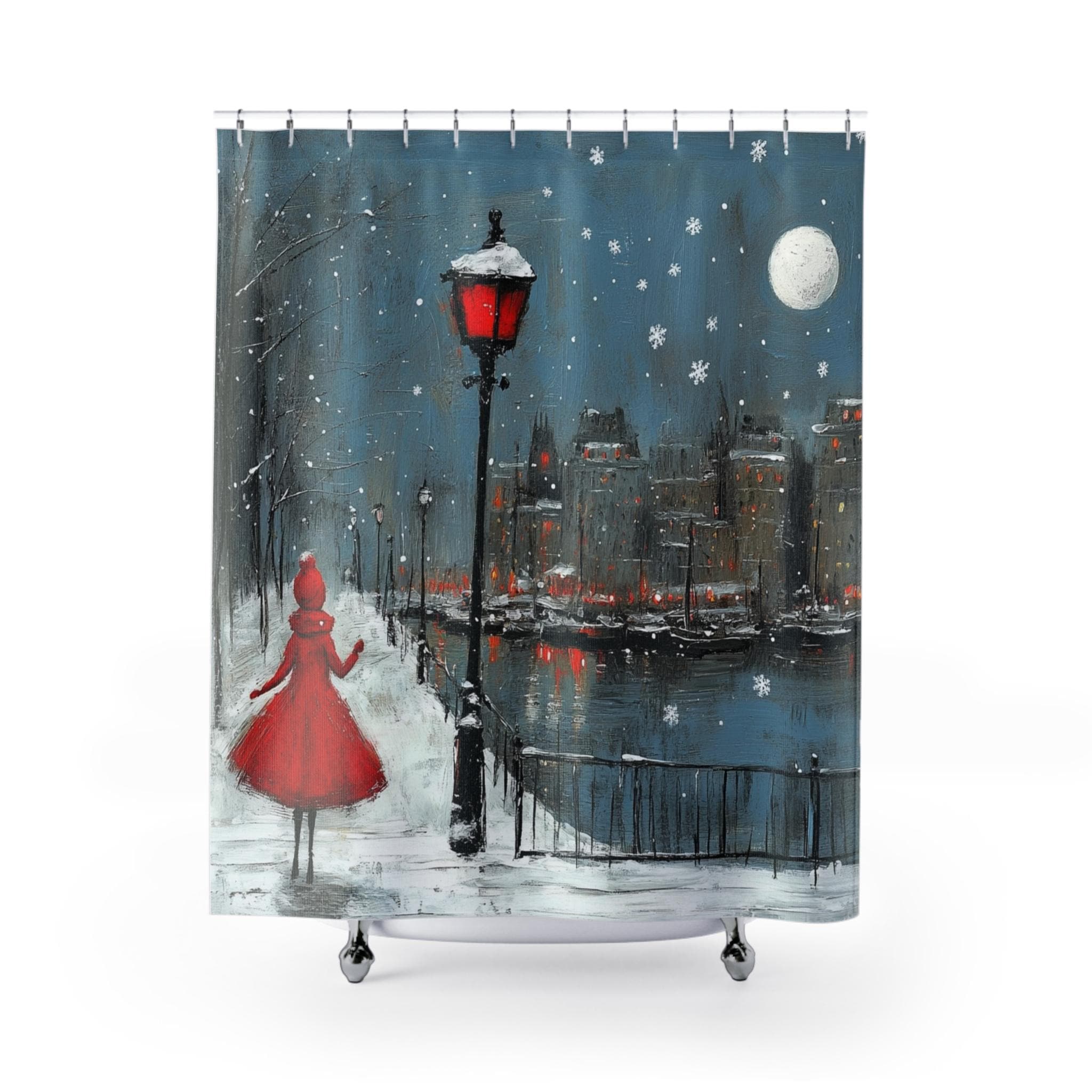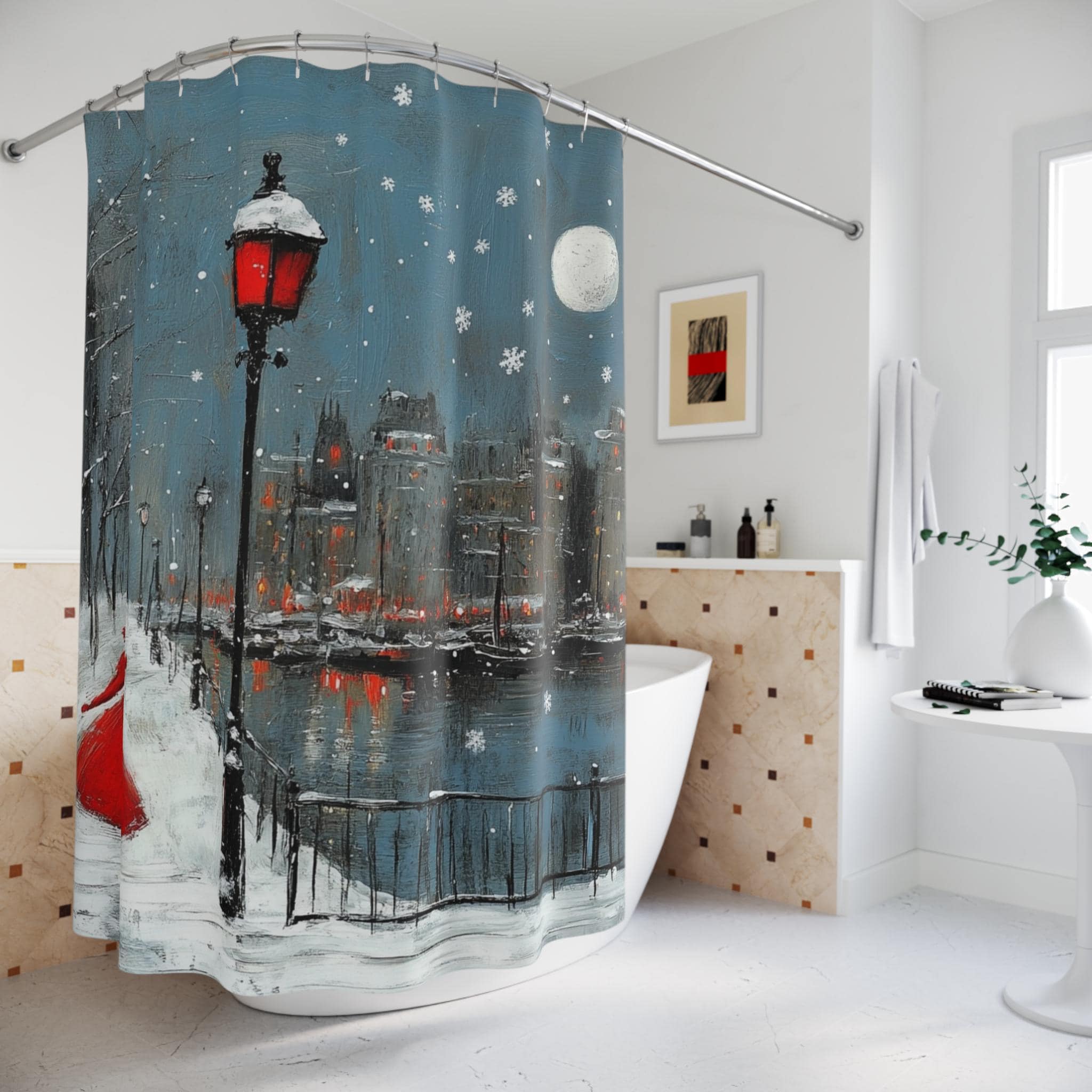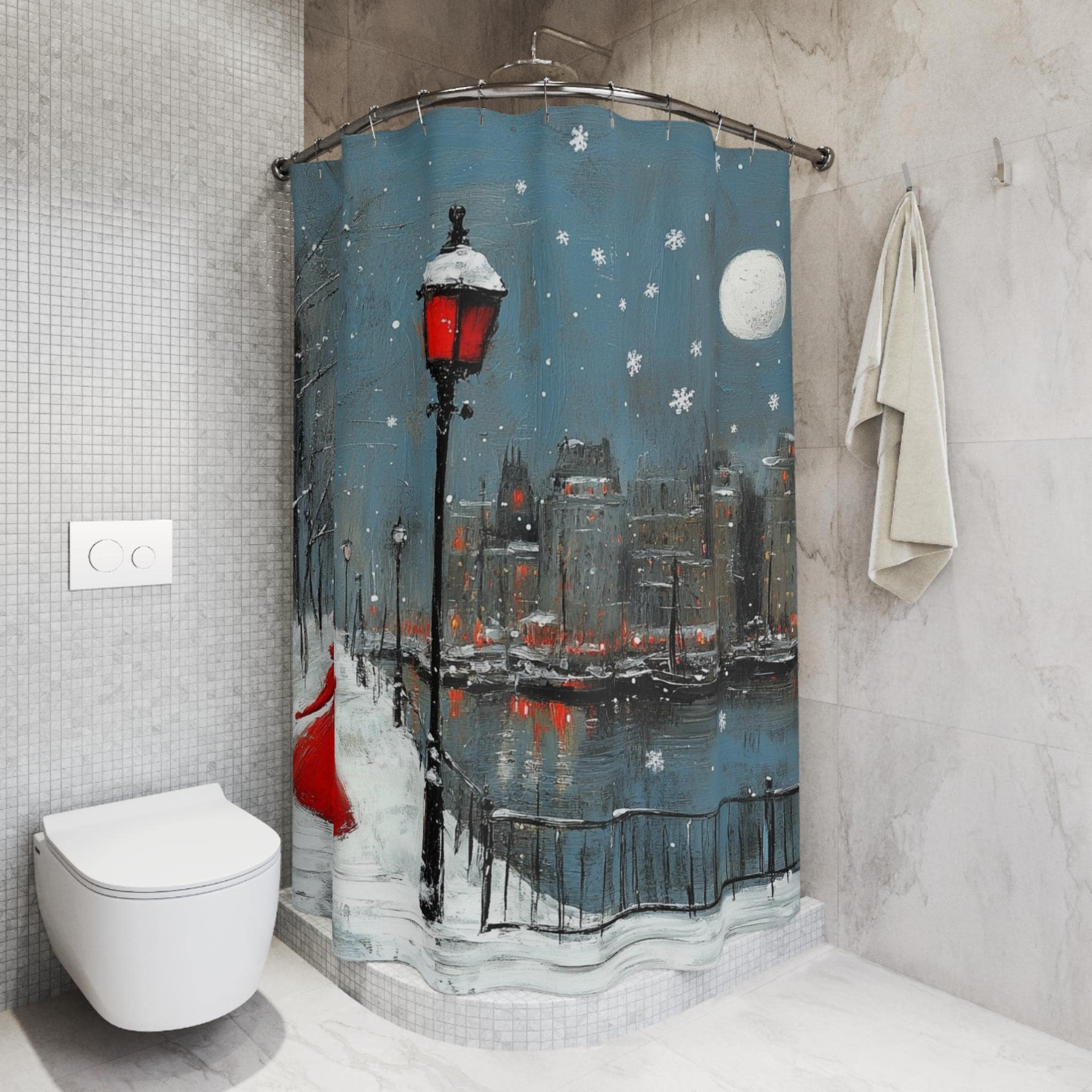 Transform your bathroom into a stylish oasis with this stunning shower curtain. Featuring a beautiful winter scene, this product exudes a cozy, serene vibe, perfect for creating a tranquil retreat in your home. Ideal for those who appreciate art and charm, it effortlessly elevates any bathroom decor. Great for the winter holidays this shower curtain brings warmth and beauty to personal spaces. It's perfect for art lovers and anyone looking to enhance their bathroom with a touch of elegance and comfort.