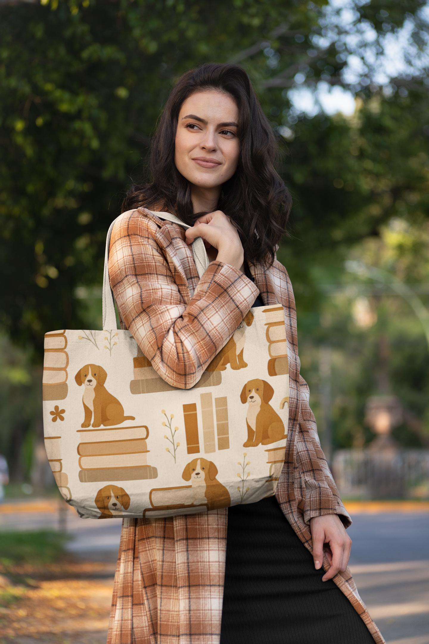 Introducing a delightful tote bag that is perfect for everyday adventures! This bag brings a fun and playful vibe with its charming design of adorable dogs and books. It's not just a stylish accessory; it's an expression of love for reading and furry friends. Imagine carrying this tote to the library, on a picnic, or even as a thoughtful gift for the dog lover in your life.