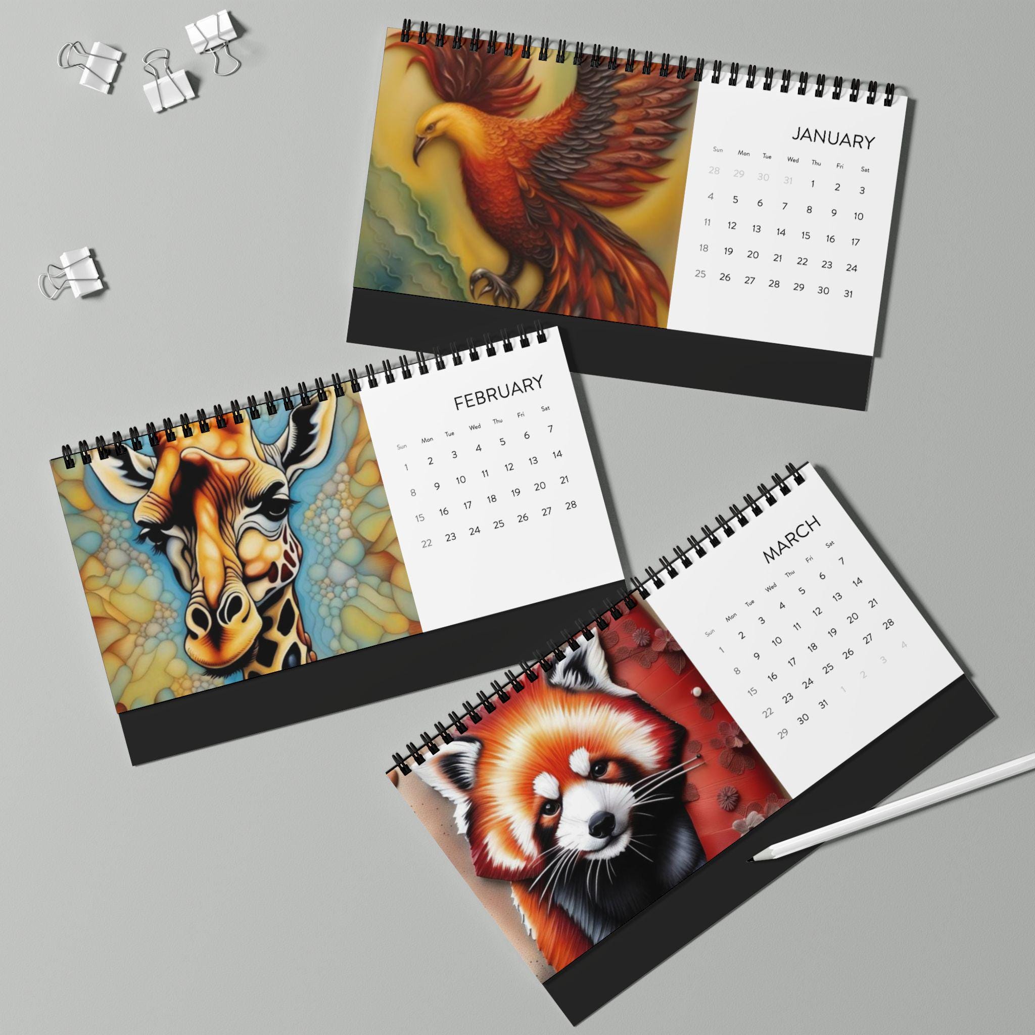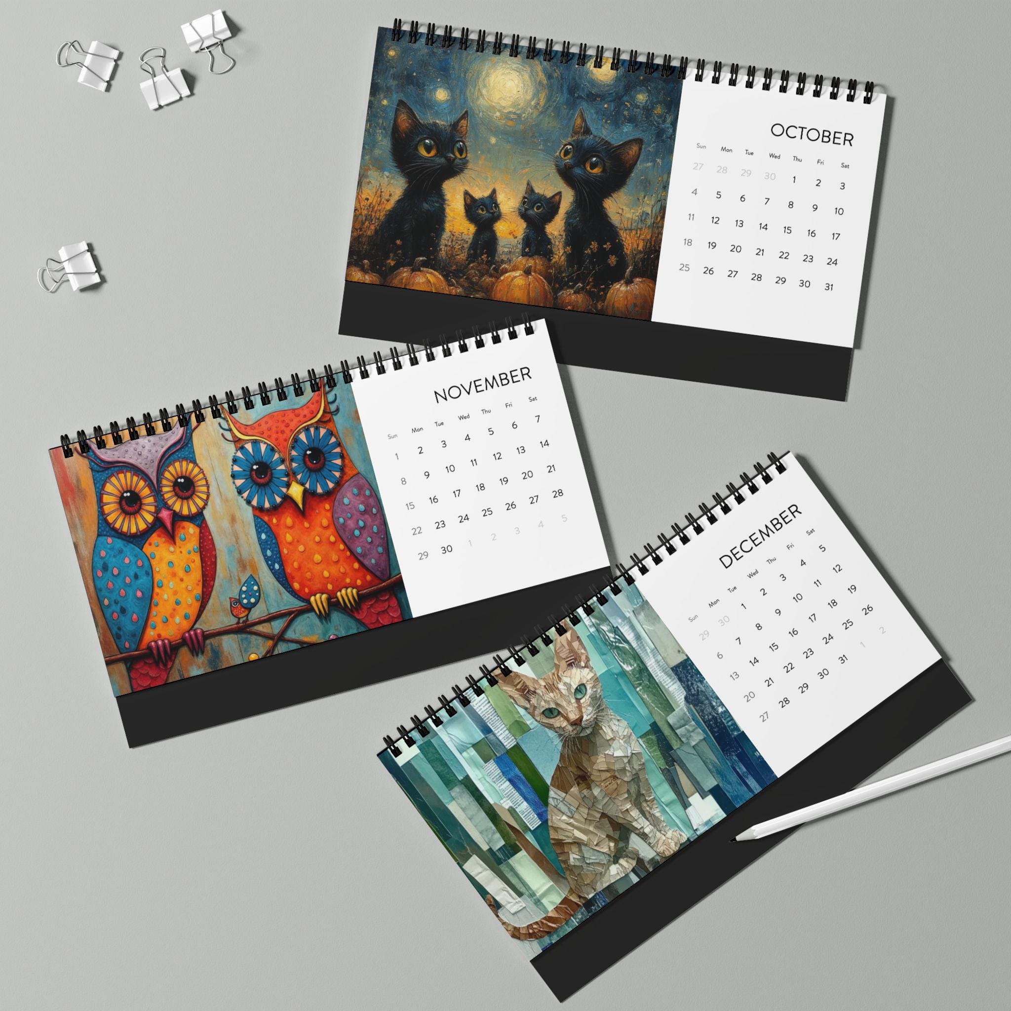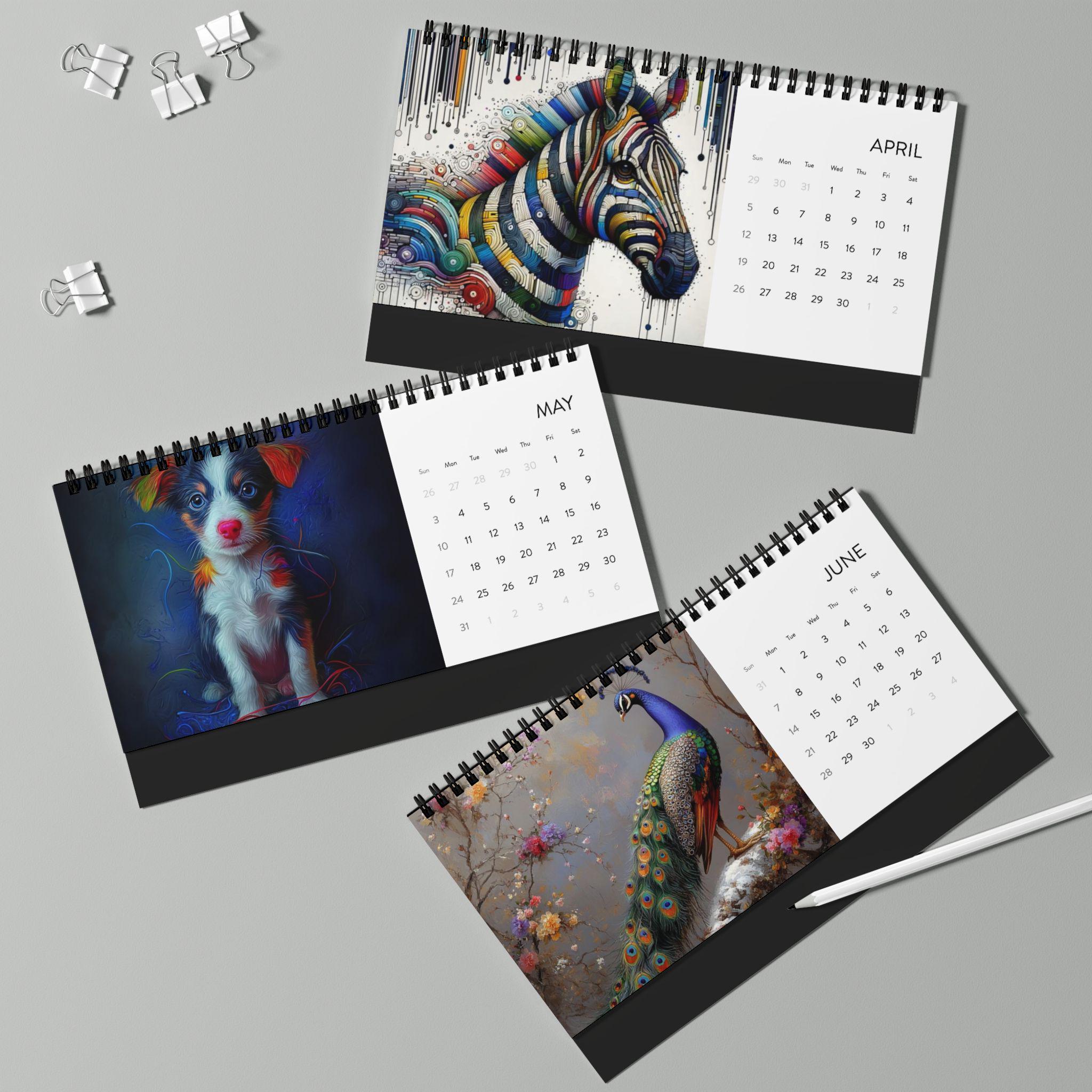 This 2026 desktop calendar brings a touch of playful charm and everyday calm to your desk. Each month pairs a bright, crisp illustration with a clear month grid so you can glance at plans without losing the mood. The low-profile 10" x 5" size fits neatly between keyboard and monitor. Sturdy black metal spiral binding and a black tent-card backing keep the pages upright and readable. Printed on 250 gsm matte paper in vivid color, the pages feel substantial and resist glare while the USA-sourced paper and domestic assembly mean quality you can notice each time you turn the page. Whether it sits on a home workbench, a cozy studio table, or a busy office shelf, this calendar quietly blends whimsy and function for daily use throughout 2026.