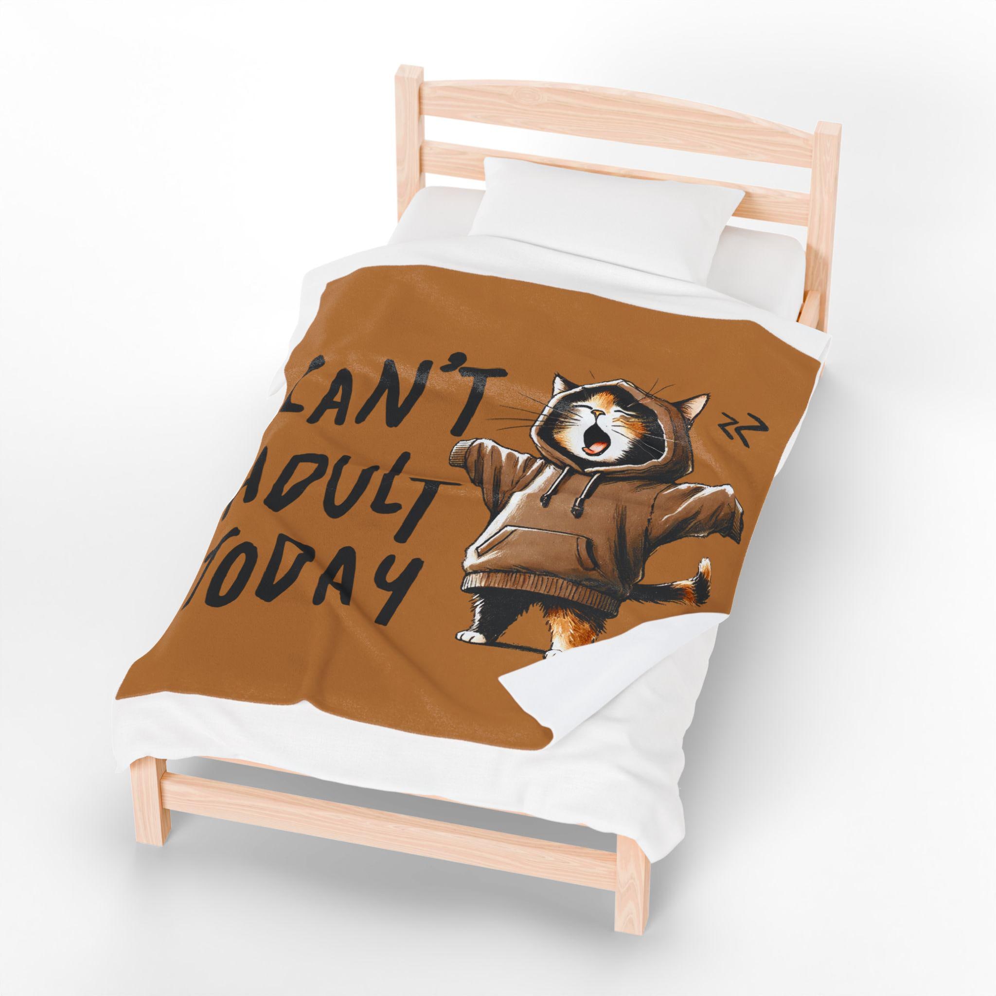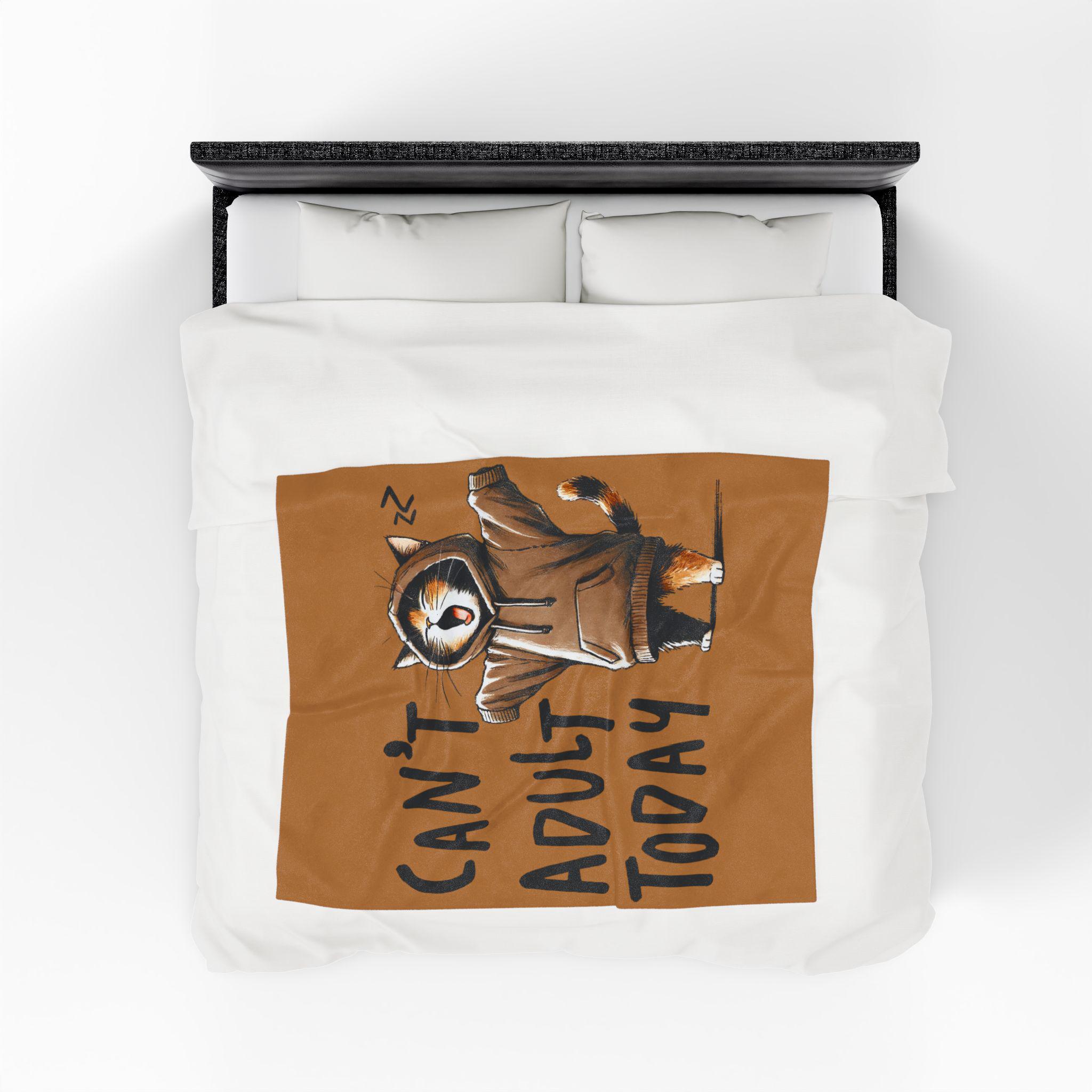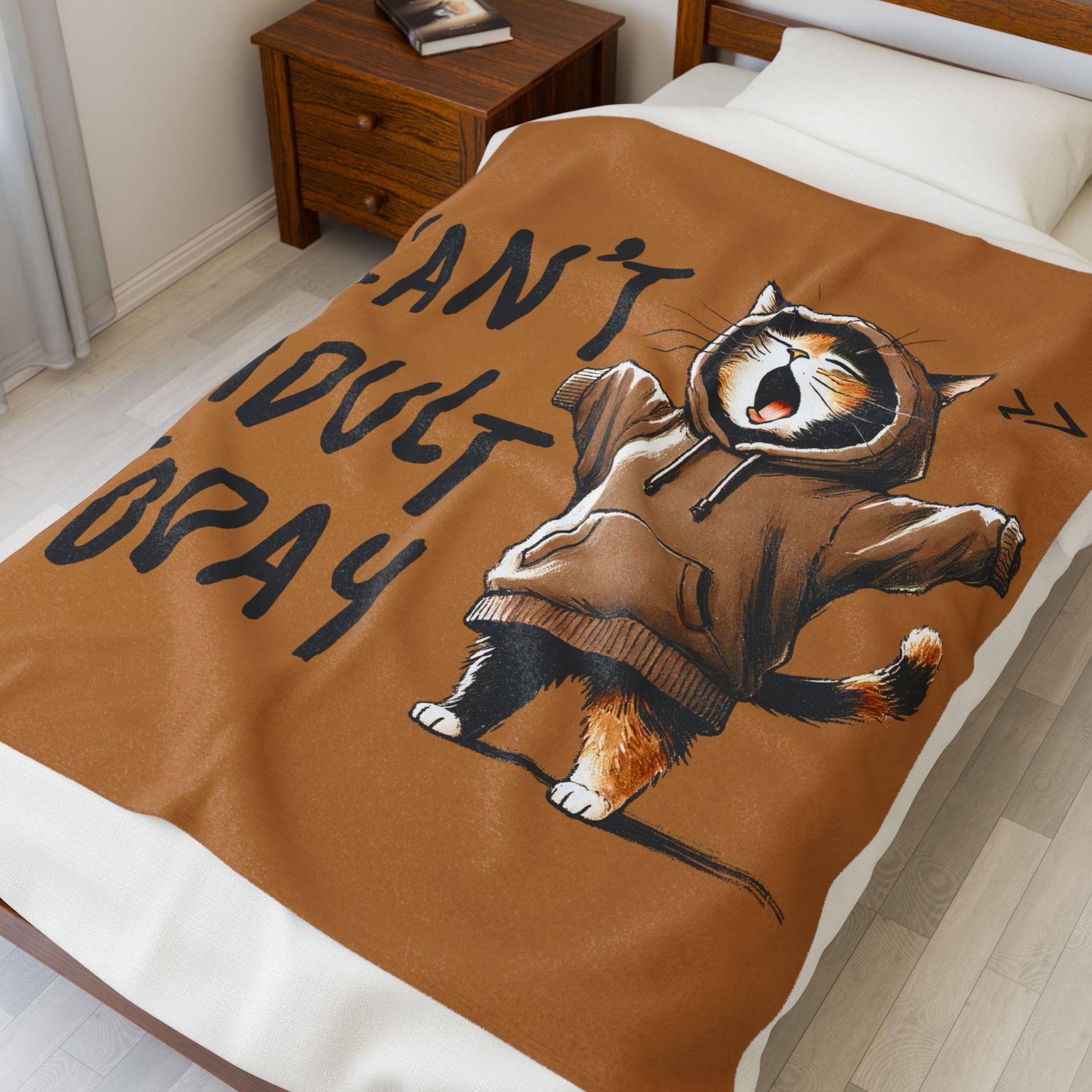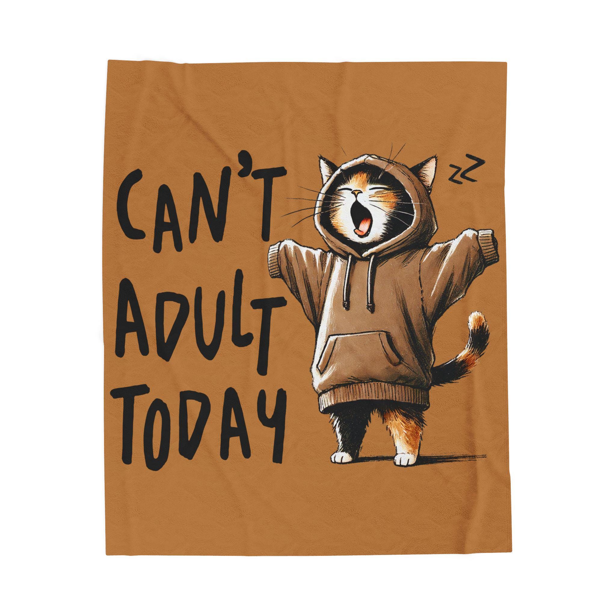 Curl up and let the small rebellions of a long day melt away. This velveteen plush blanket features a sleepy, hoodie-wearing cat and the cheeky line “CAN’T ADULT TODAY,” rendered in rich, cozy tones. The fabric feels sumptuously soft against the skin and holds vivid color on the front, making that illustrated yawn and warm palette pop. It’s the kind of throw you reach for on slow mornings, quiet evenings, or when you need a lighthearted pause while working from home. Layer it over a sofa or drape it across a favorite chair — it gives an instant dose of comfort and personality without fuss. The design speaks to anyone who appreciates whimsical home touches and a little honest humor during downtime.