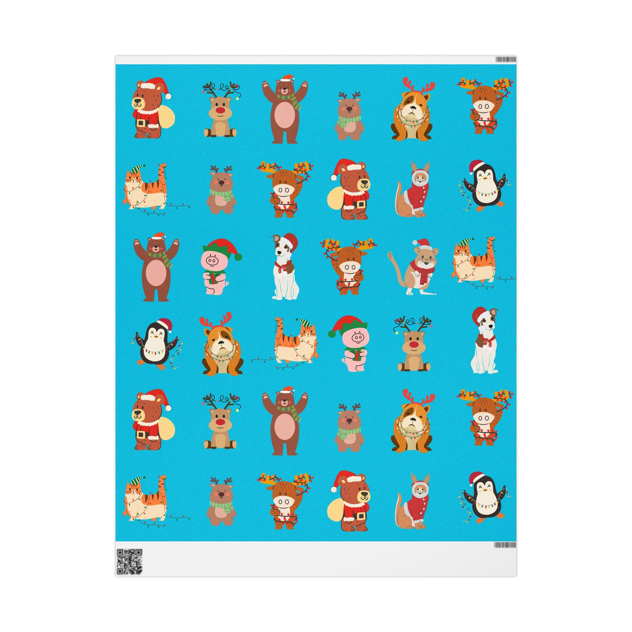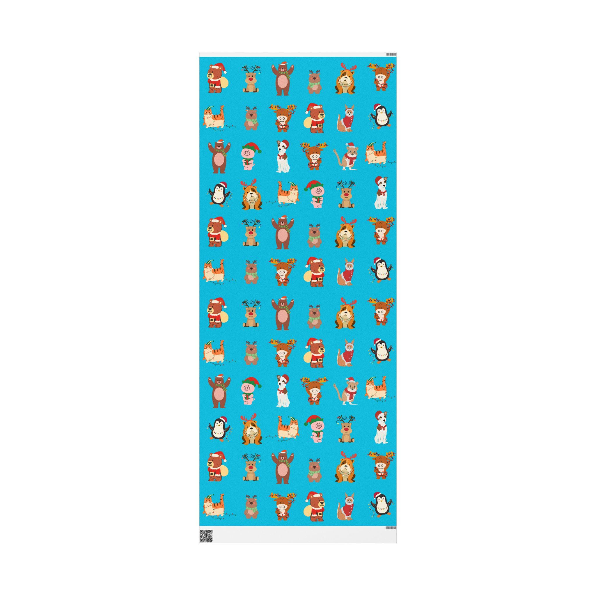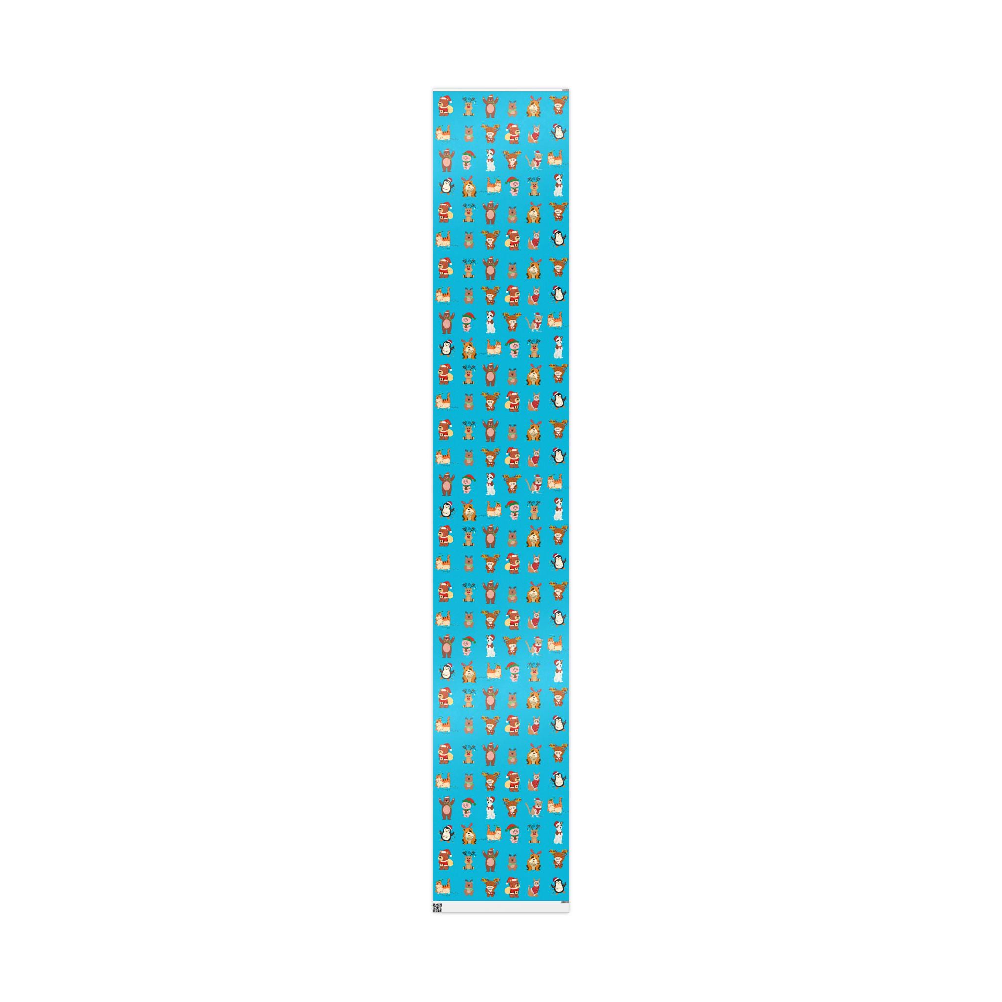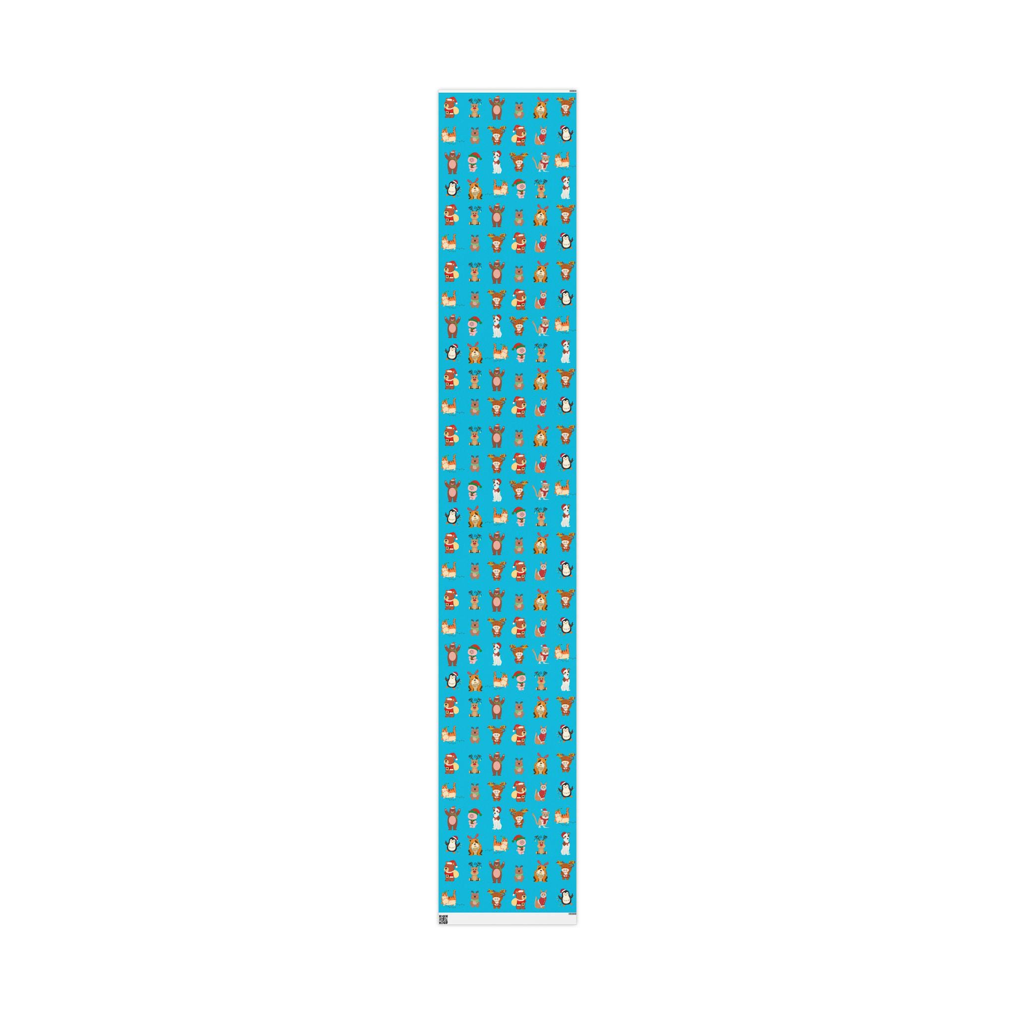 Bright, playful wrapping paper printed on sturdy 90 gsm fine art paper. A vibrant turquoise background repeats a cozy pattern of adorable animals wearing holiday hats and scarves. The single-sided print comes in your choice of glossy or smooth matte finish, and is available in three generous lengths so you can wrap everything from small boxes to long parcels. Each roll carries a narrow white trim at the top and bottom with a barcode and QR code, a small production detail that doesn’t distract from the pattern. This paper brings a warm, whimsical touch to holiday packages and everyday surprise-giving alike.