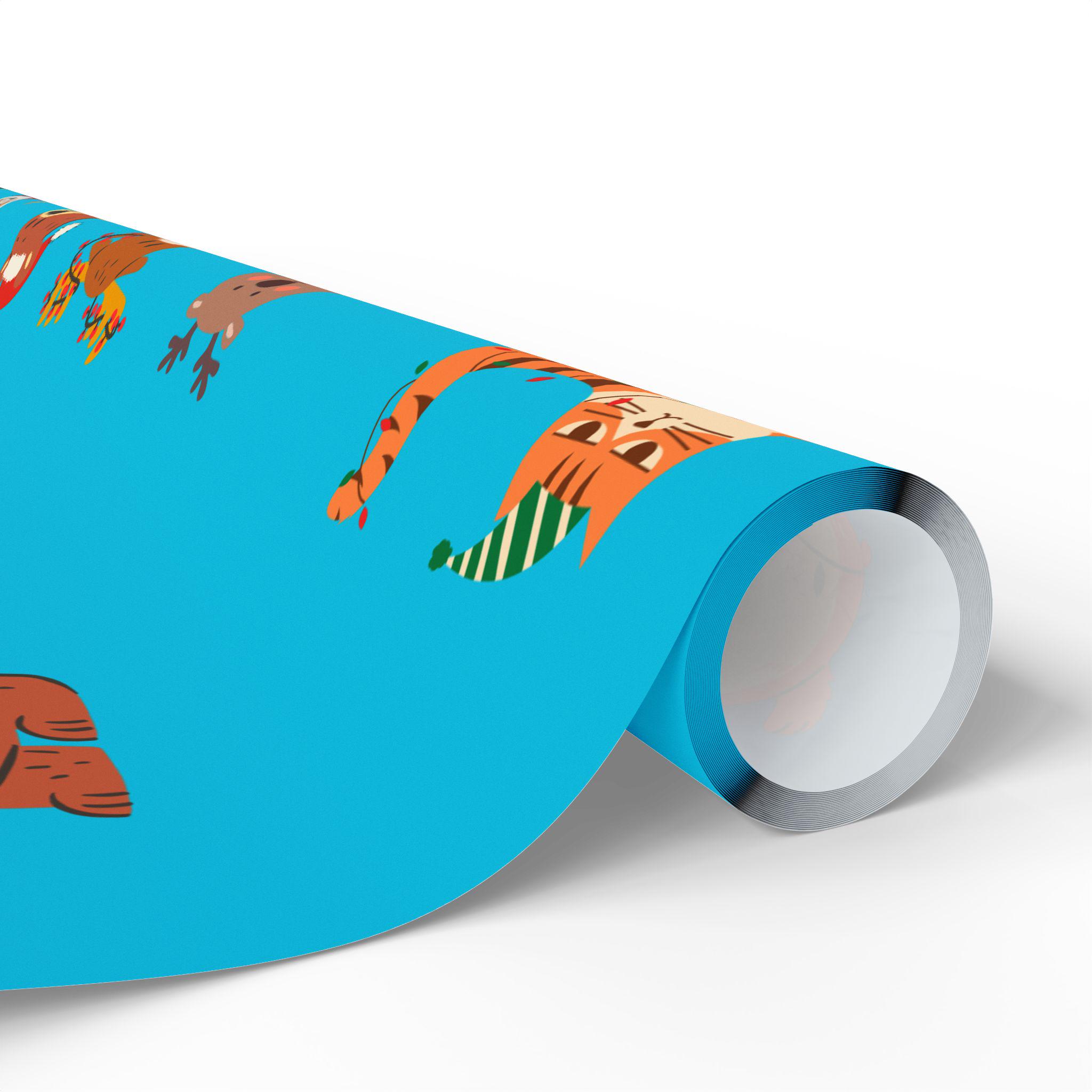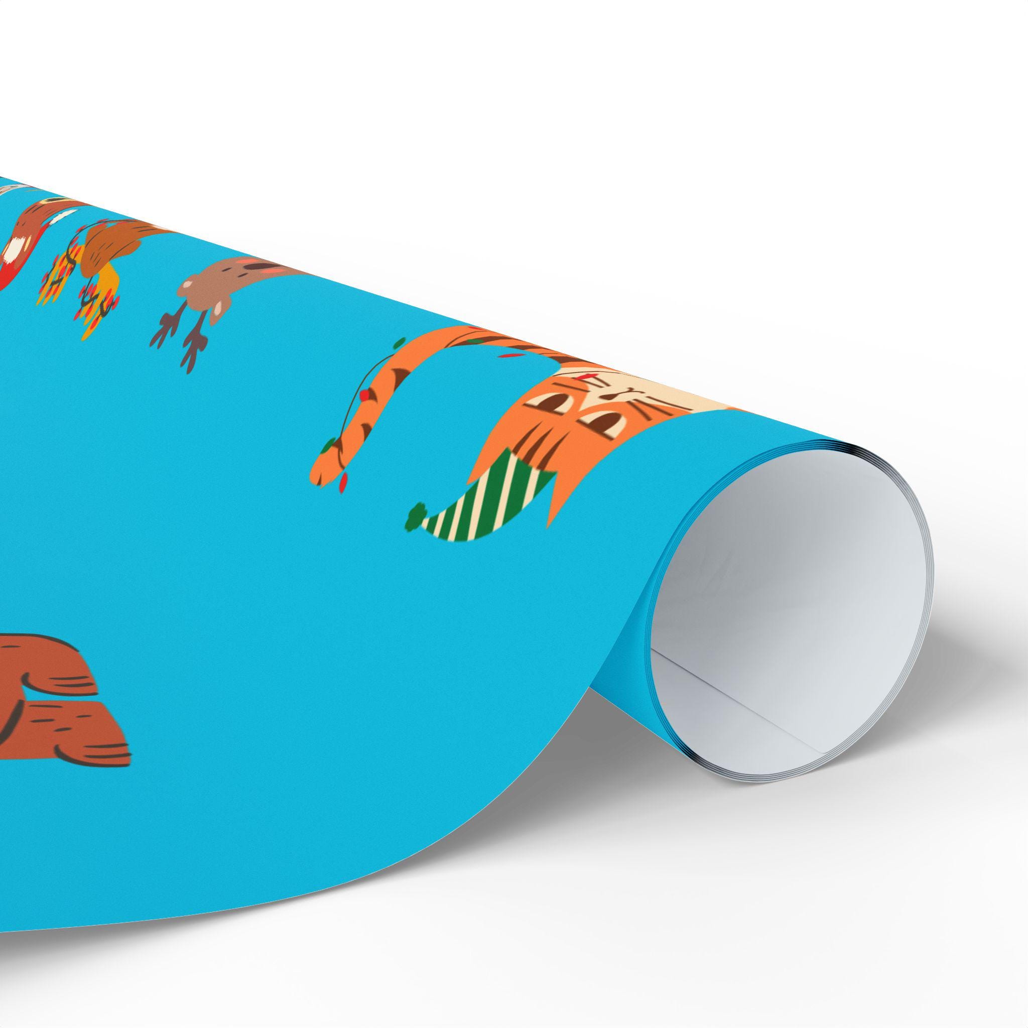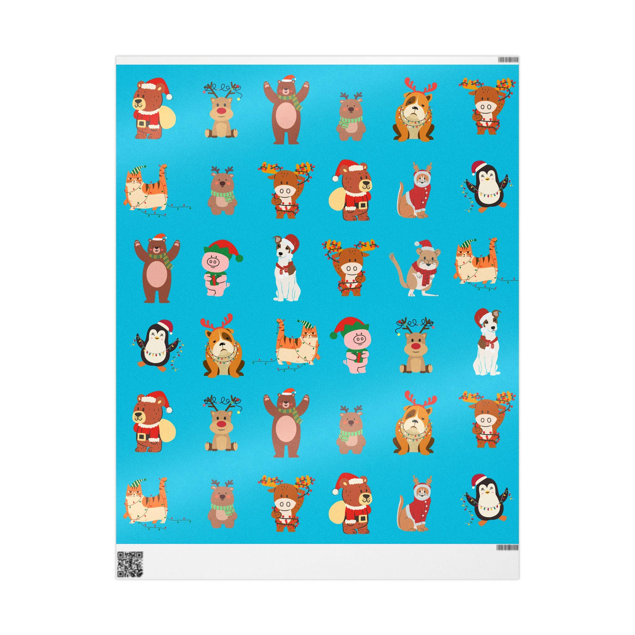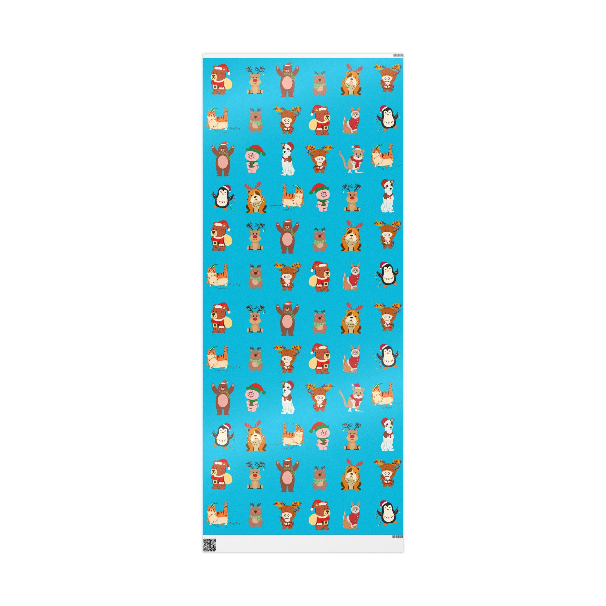 Bright, playful wrapping paper printed on sturdy 90 gsm fine art paper. A vibrant turquoise background repeats a cozy pattern of adorable animals wearing holiday hats and scarves. The single-sided print comes in your choice of glossy or smooth matte finish, and is available in three generous lengths so you can wrap everything from small boxes to long parcels. Each roll carries a narrow white trim at the top and bottom with a barcode and QR code, a small production detail that doesn’t distract from the pattern. This paper brings a warm, whimsical touch to holiday packages and everyday surprise-giving alike.
