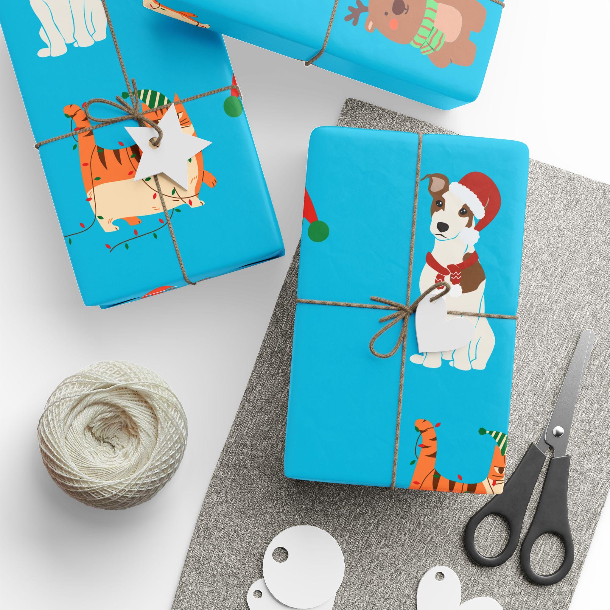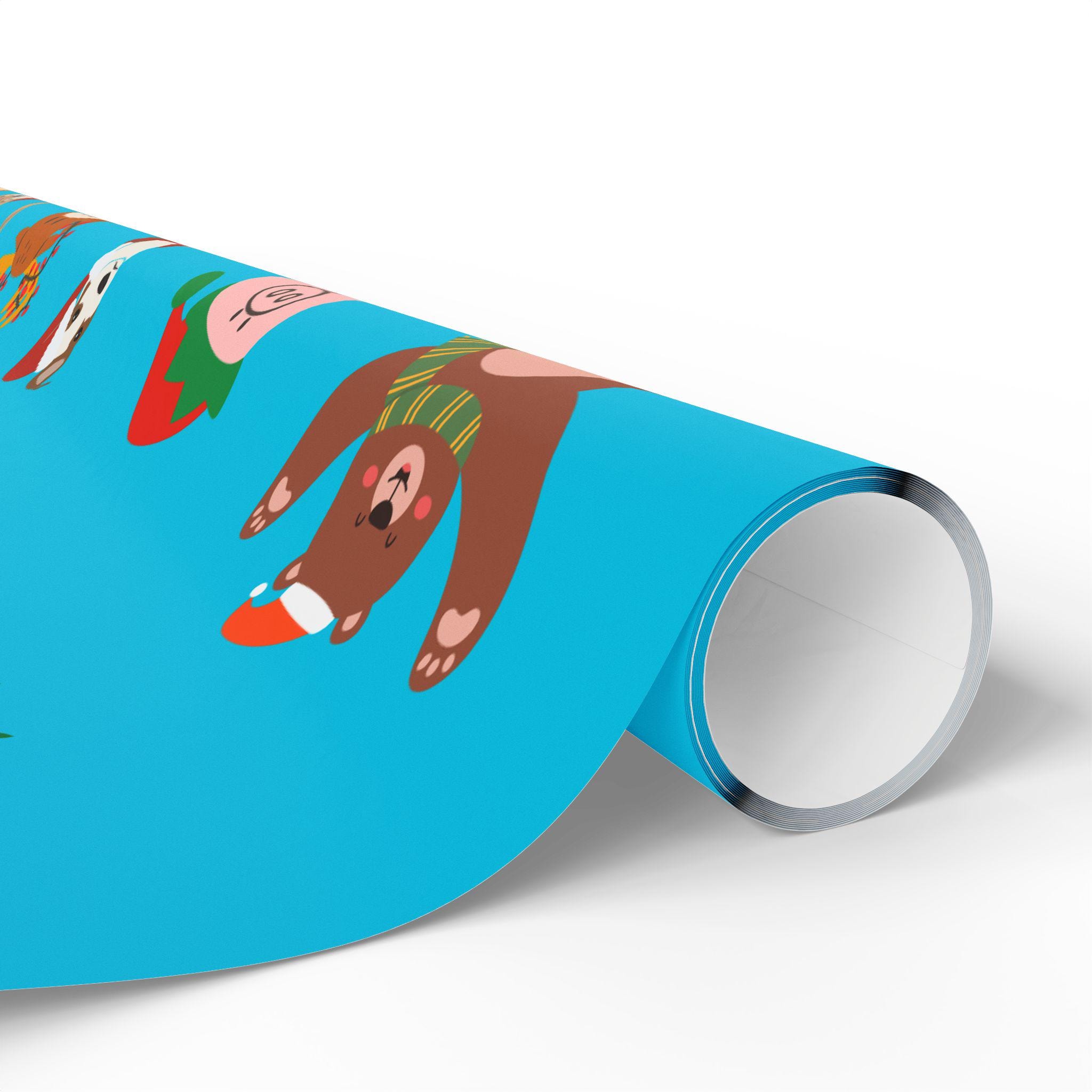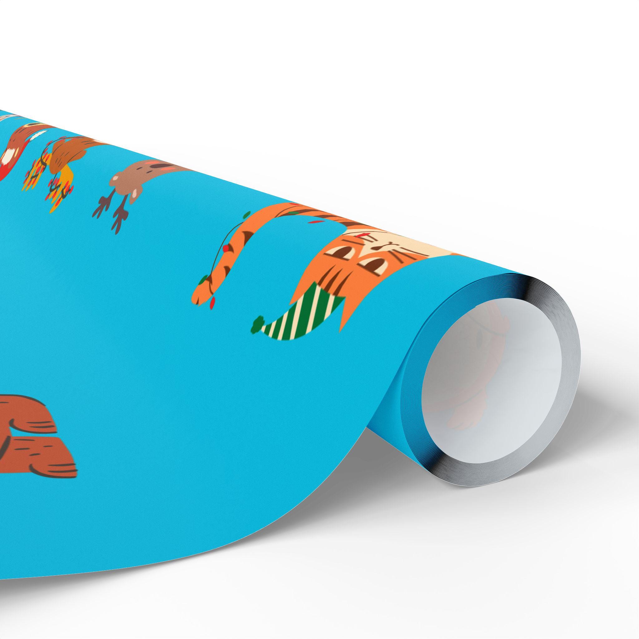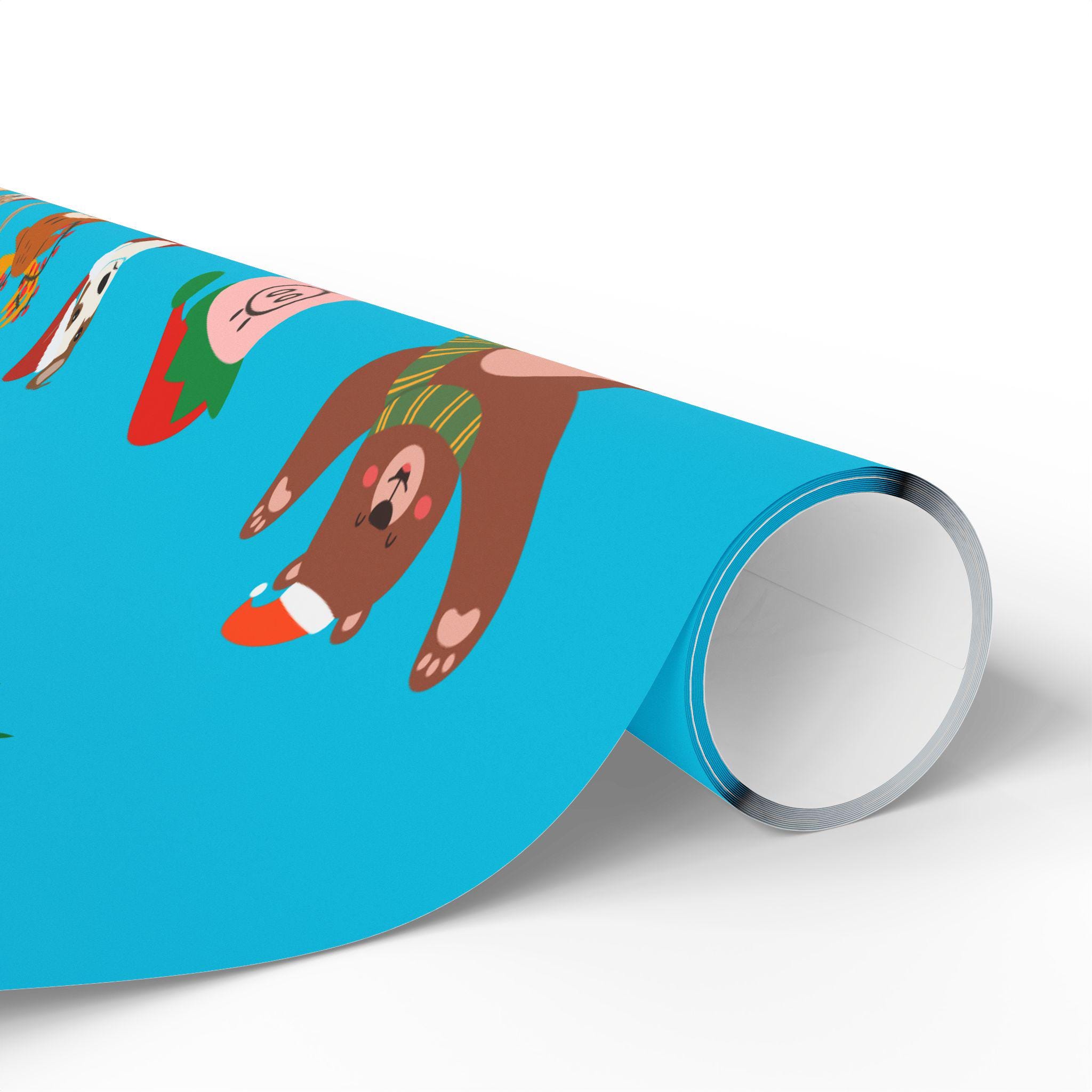 Bright, playful wrapping paper printed on sturdy 90 gsm fine art paper. A vibrant turquoise background repeats a cozy pattern of adorable animals wearing holiday hats and scarves. The single-sided print comes in your choice of glossy or smooth matte finish, and is available in three generous lengths so you can wrap everything from small boxes to long parcels. Each roll carries a narrow white trim at the top and bottom with a barcode and QR code, a small production detail that doesn’t distract from the pattern. This paper brings a warm, whimsical touch to holiday packages and everyday surprise-giving alike.