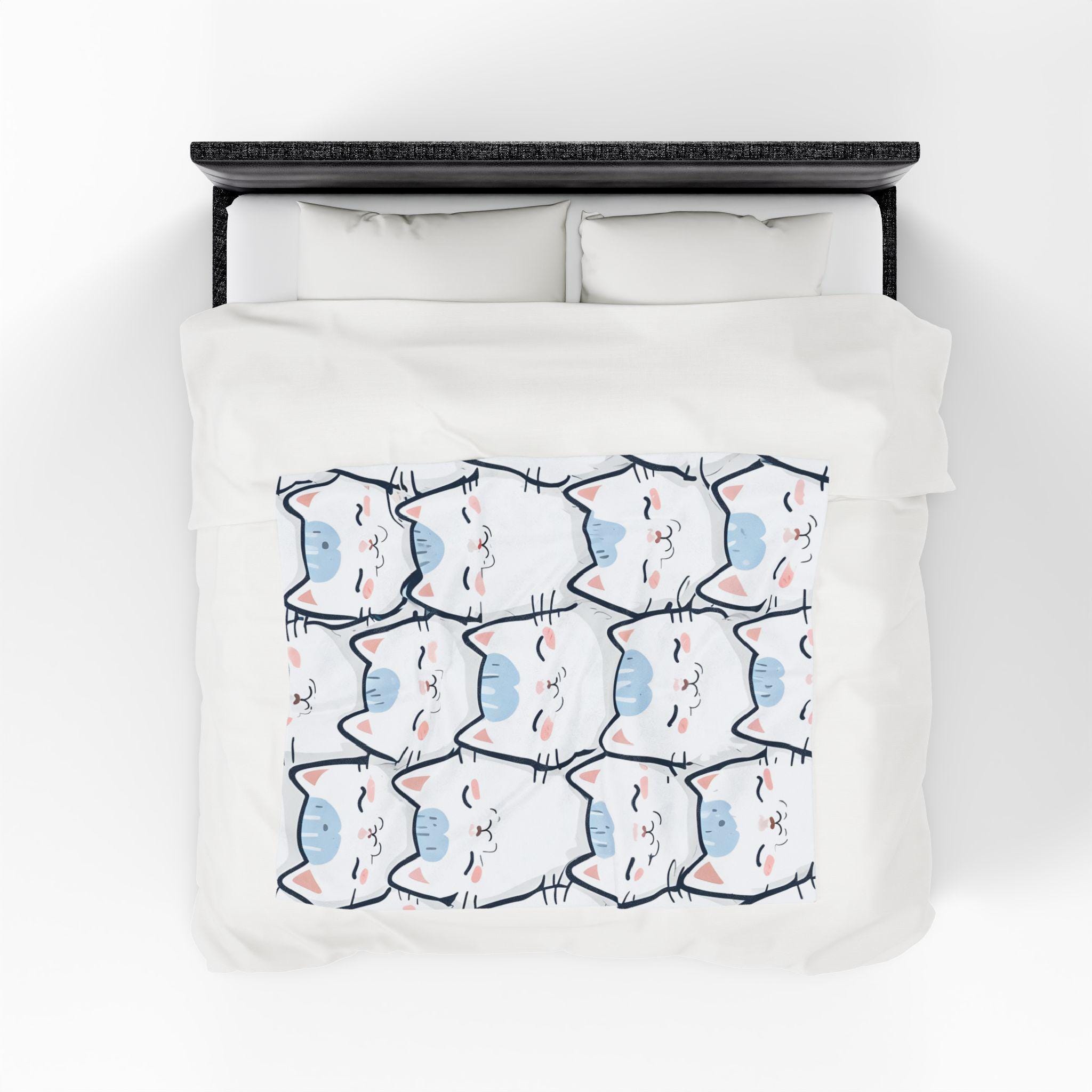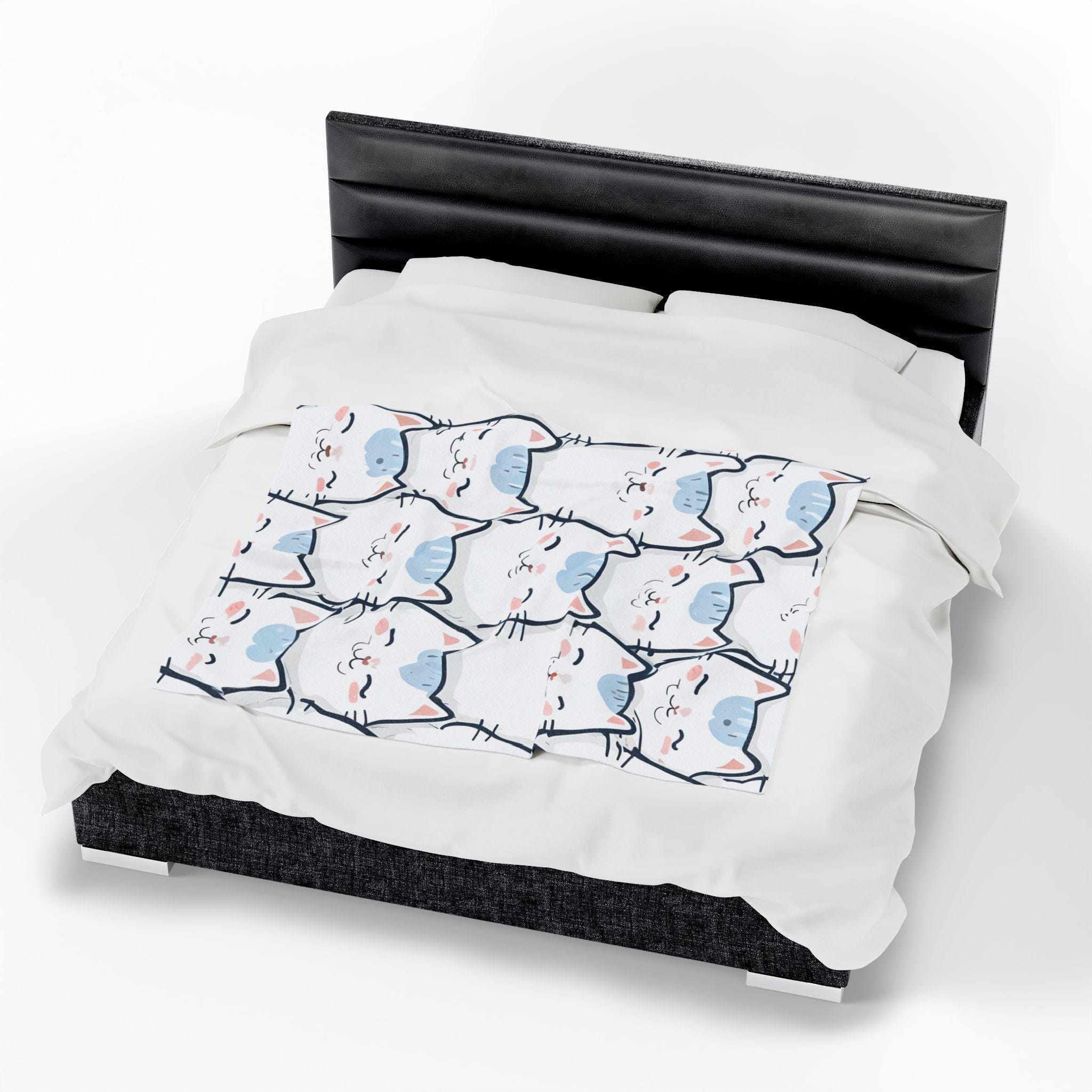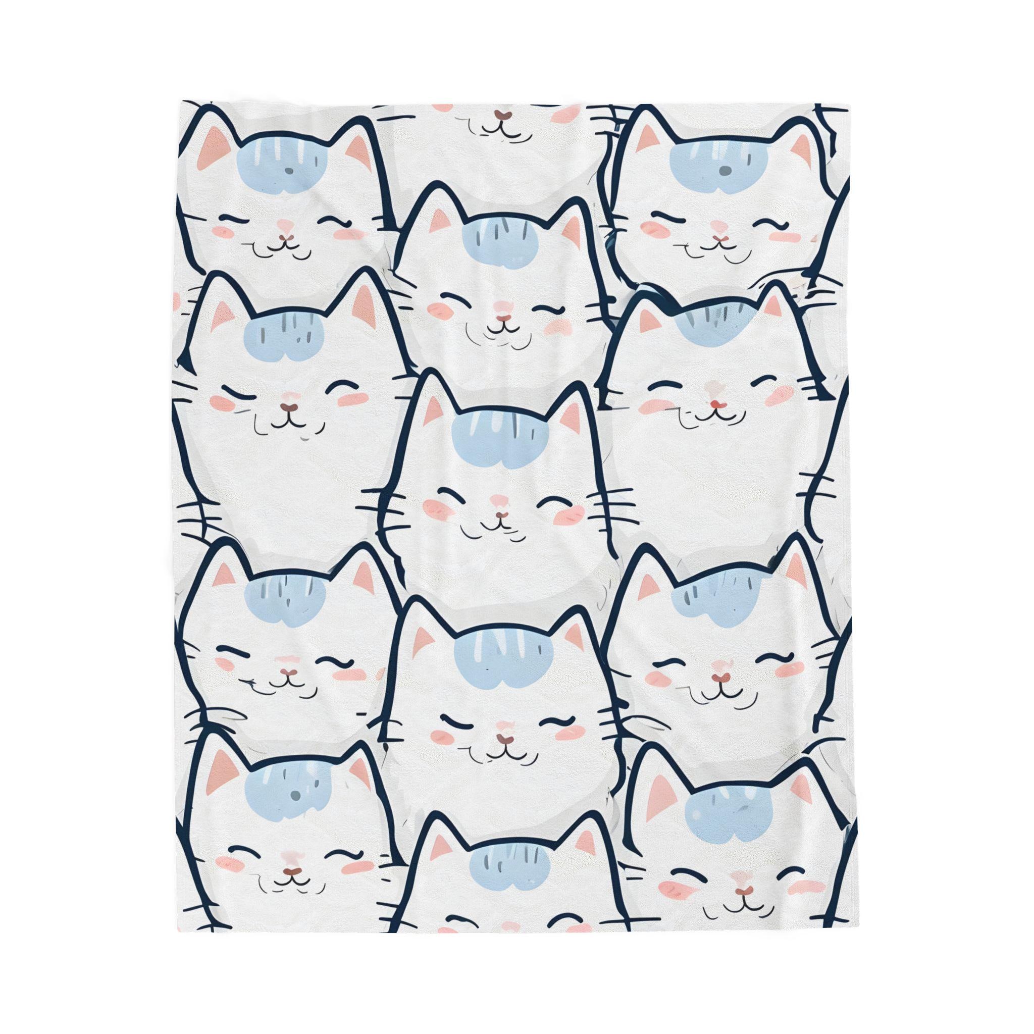 Soft, velvety, and quietly joyful — this plush blanket wraps you in a gentle hush of warmth. A repeat of sleepy, smiling cats in soft blues and blush gives the design a calm, whimsical rhythm that brightens a room without shouting. Drape it over a sofa for chilled movie nights, fold it by the reading chair for slow Sunday mornings, or tuck it around your legs while sketching or journaling. The fabric feels smooth against skin and holds the printed art in clear, lively detail so the pattern stays charming wash after wash. It lives where comfort and personality meet: cozy corners, small studios, and anyone who collects quiet comforts and cute things that make home feel like home.