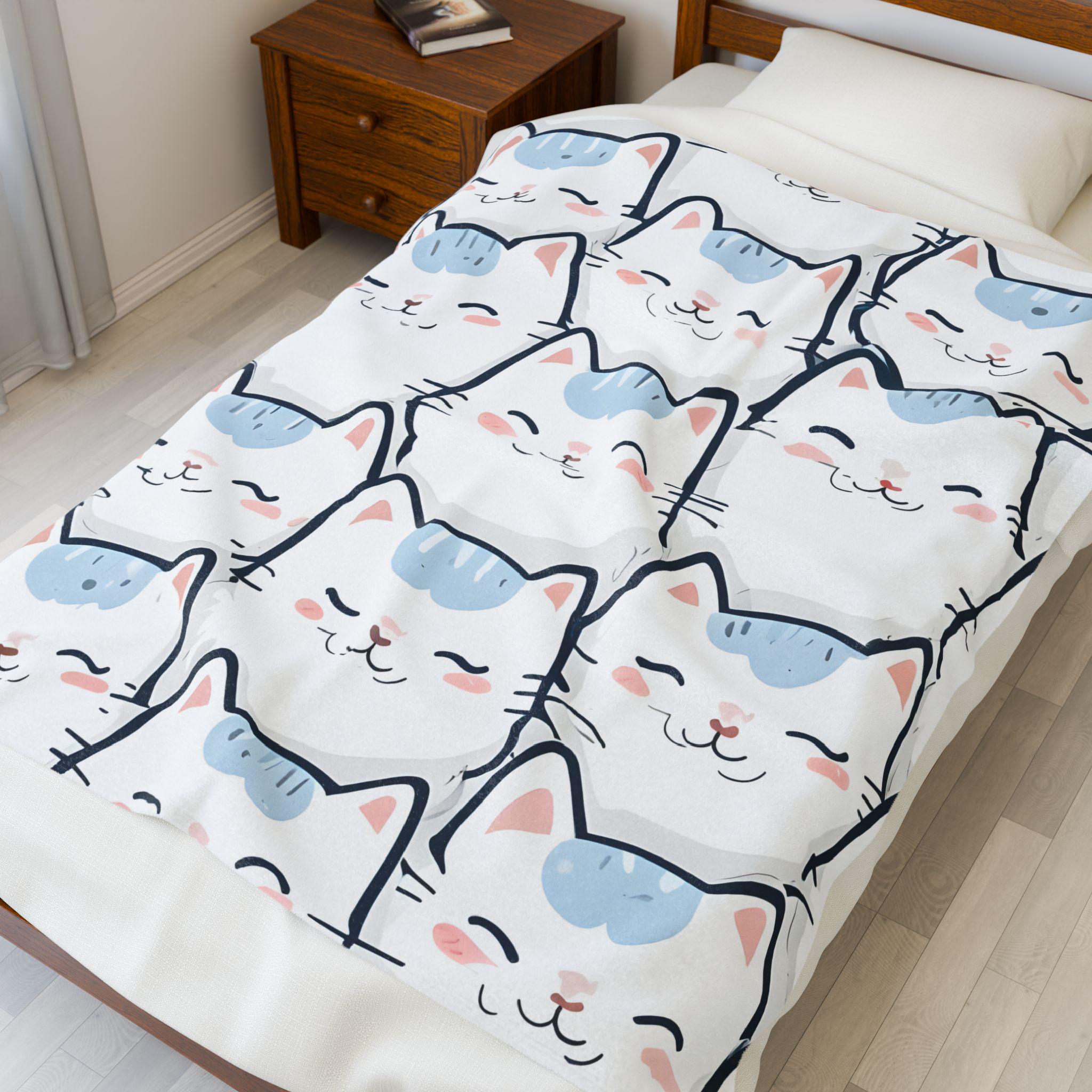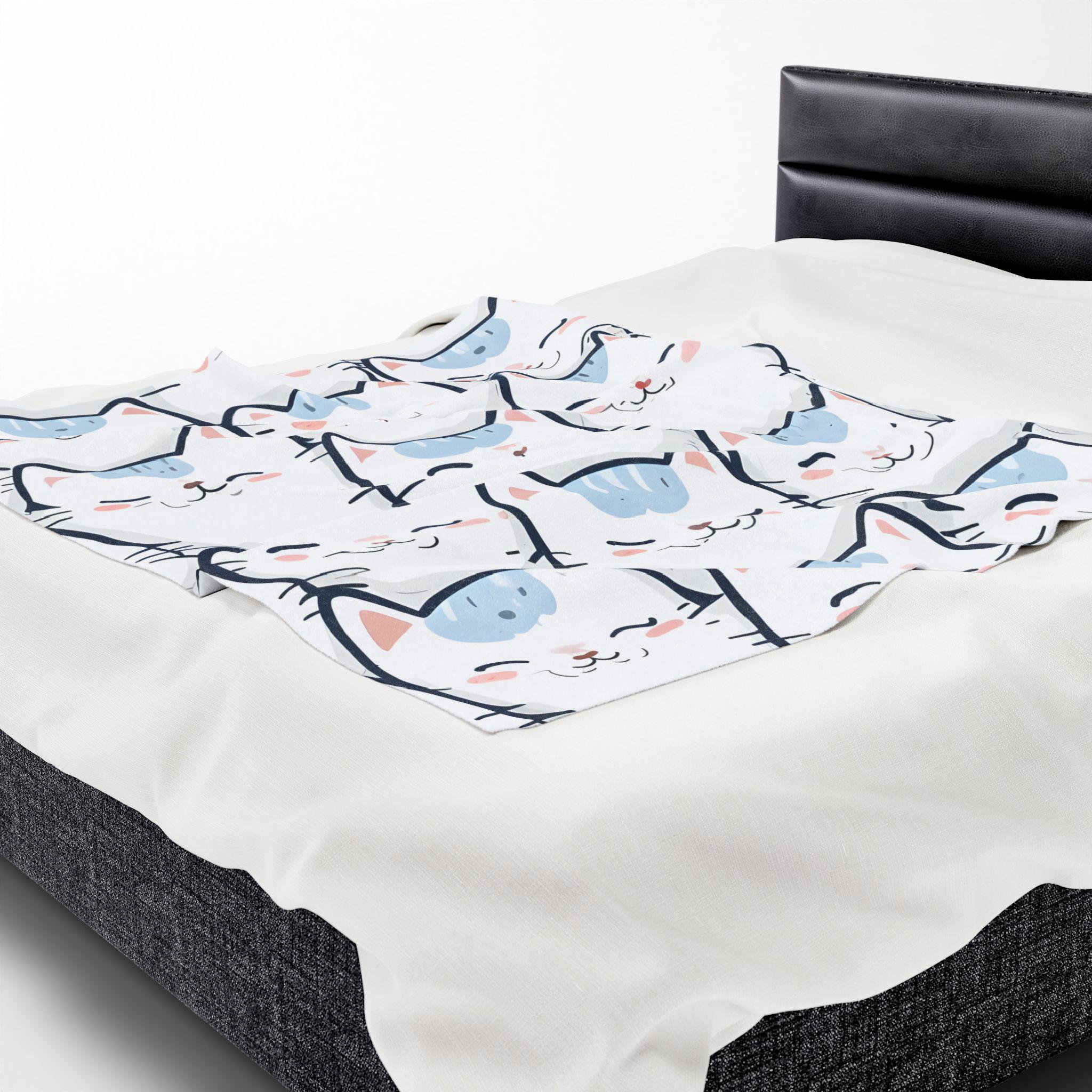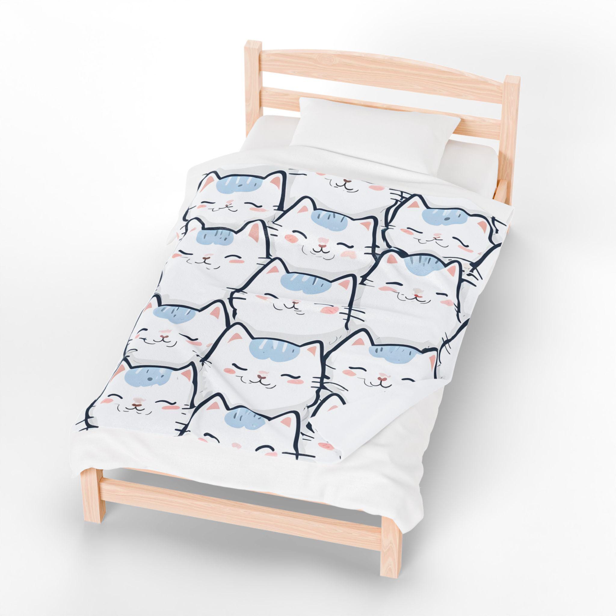 Soft, velvety, and quietly joyful — this plush blanket wraps you in a gentle hush of warmth. A repeat of sleepy, smiling cats in soft blues and blush gives the design a calm, whimsical rhythm that brightens a room without shouting. Drape it over a sofa for chilled movie nights, fold it by the reading chair for slow Sunday mornings, or tuck it around your legs while sketching or journaling. The fabric feels smooth against skin and holds the printed art in clear, lively detail so the pattern stays charming wash after wash. It lives where comfort and personality meet: cozy corners, small studios, and anyone who collects quiet comforts and cute things that make home feel like home.