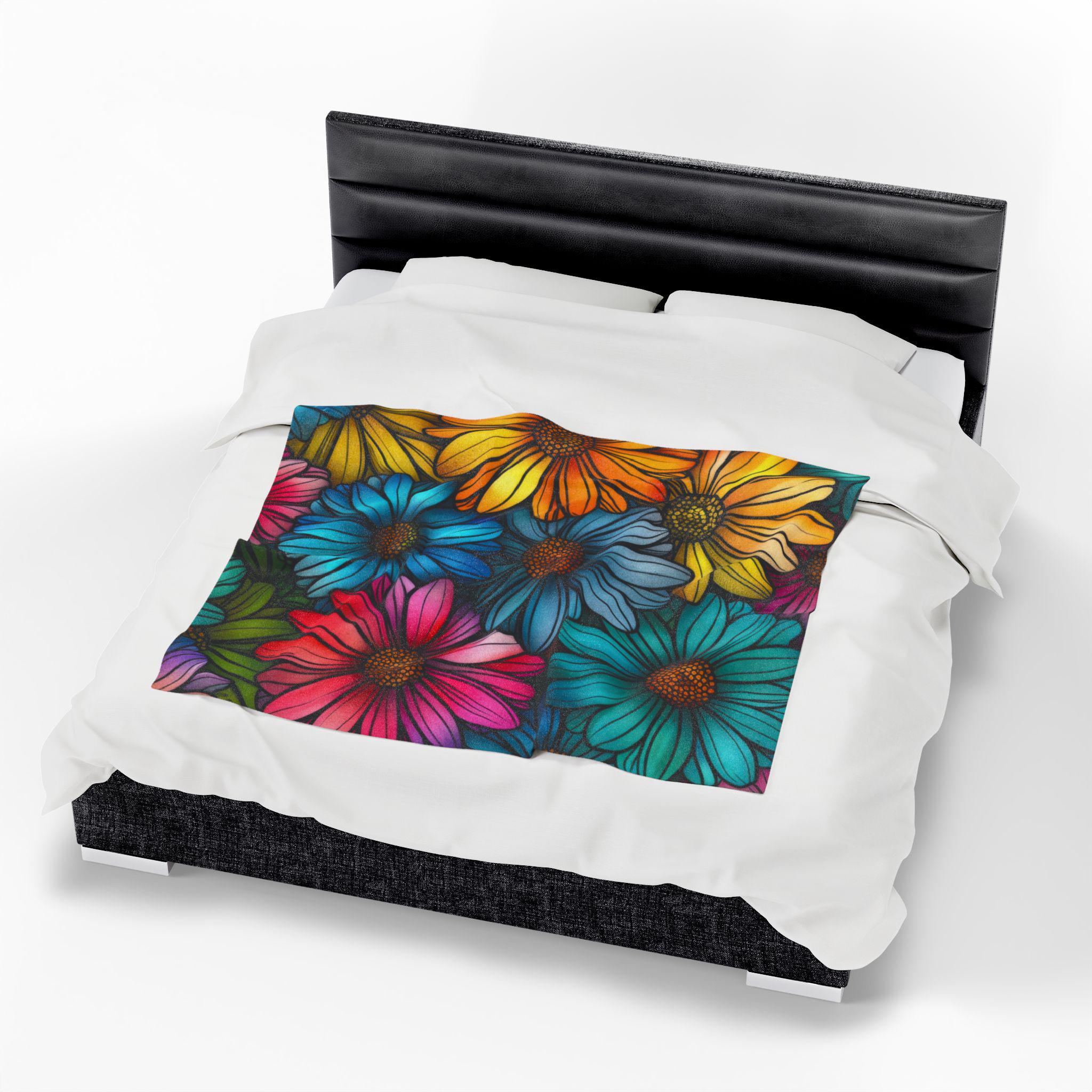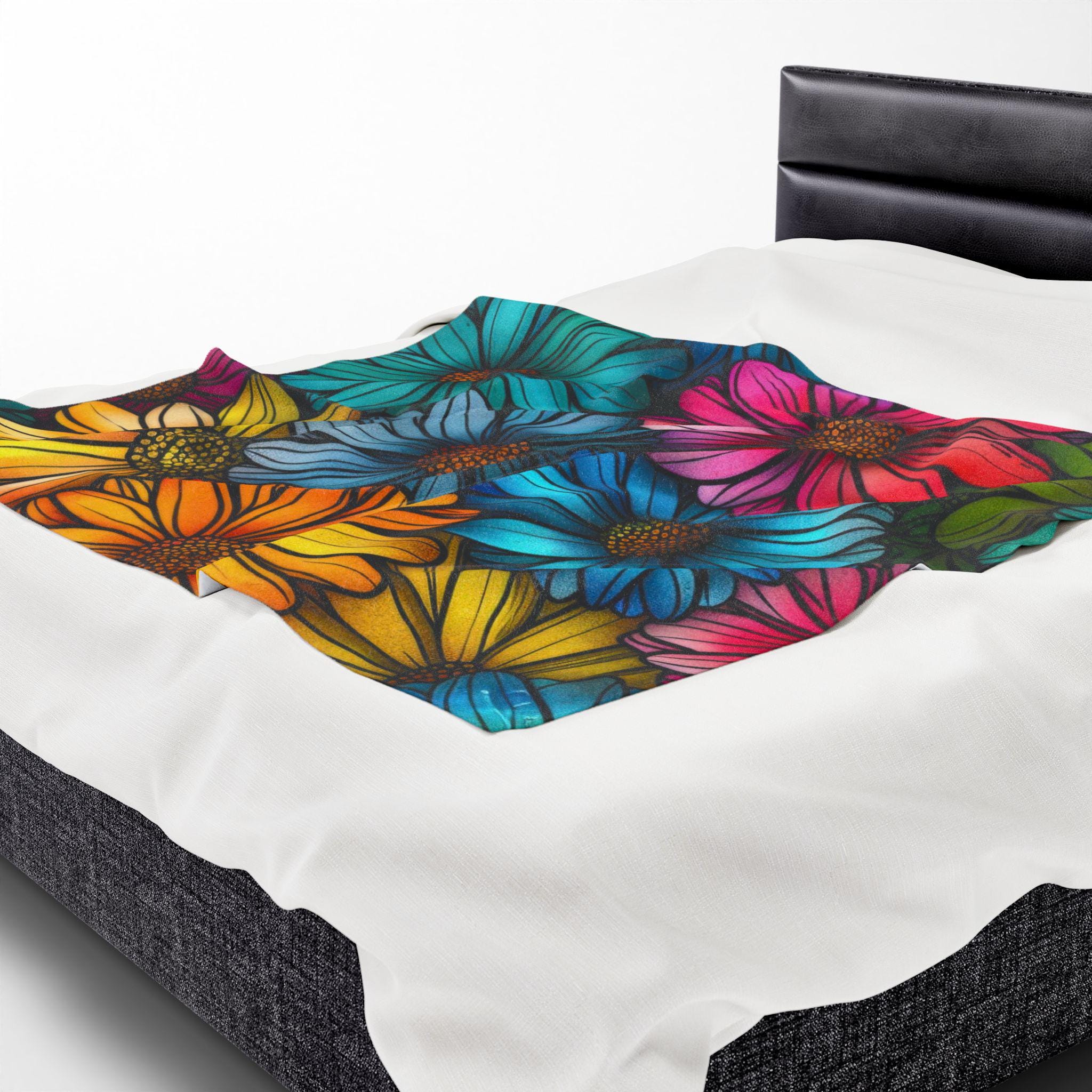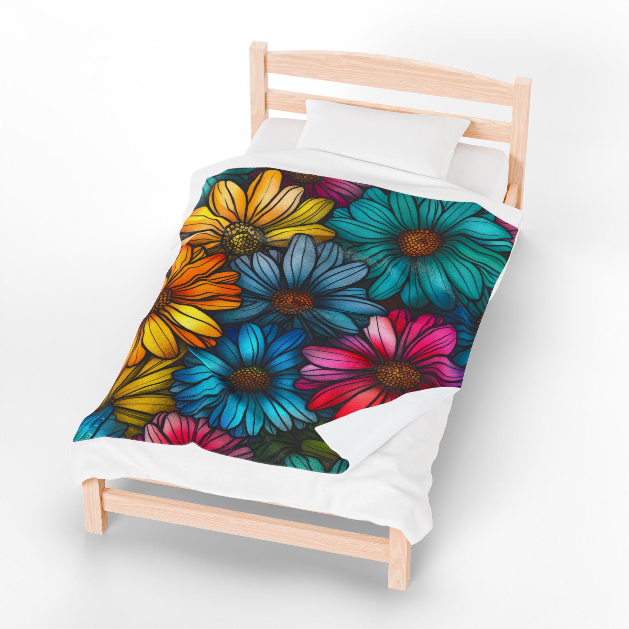 Wrap yourself in a riot of color and comfort. This velveteen plush blanket features a hand-drawn cascade of vividly saturated daisies—sunny yellows, teal blues, and magenta petals—printed in rich, high-detail color on one side. The fabric is sumptuously soft with a medium-heavy weight that drapes like a warm hug on the couch, on a picnic, or over chilled shoulders during late-night reading. Durable double-needle topstitching keeps the edges neat after many cozy nights, while the quick-drying polyester blend maintains the blanket’s plush feel and brilliant hues. It brings a touch of cheerful, botanical energy to small apartments, artist studios, or any corner that needs a bright, tactile lift.