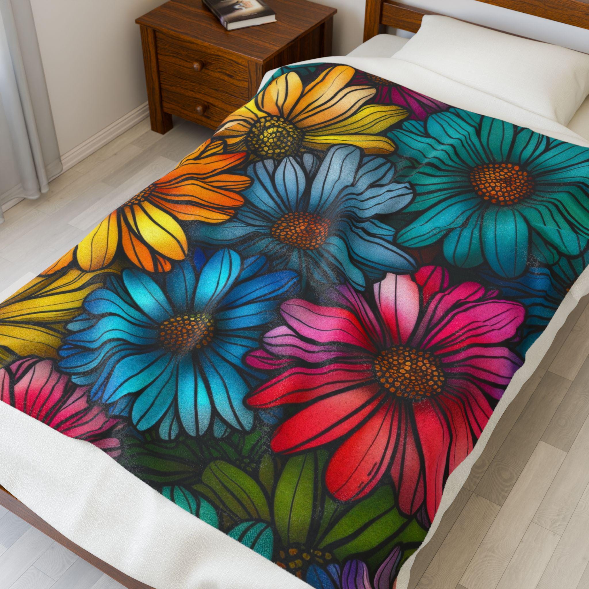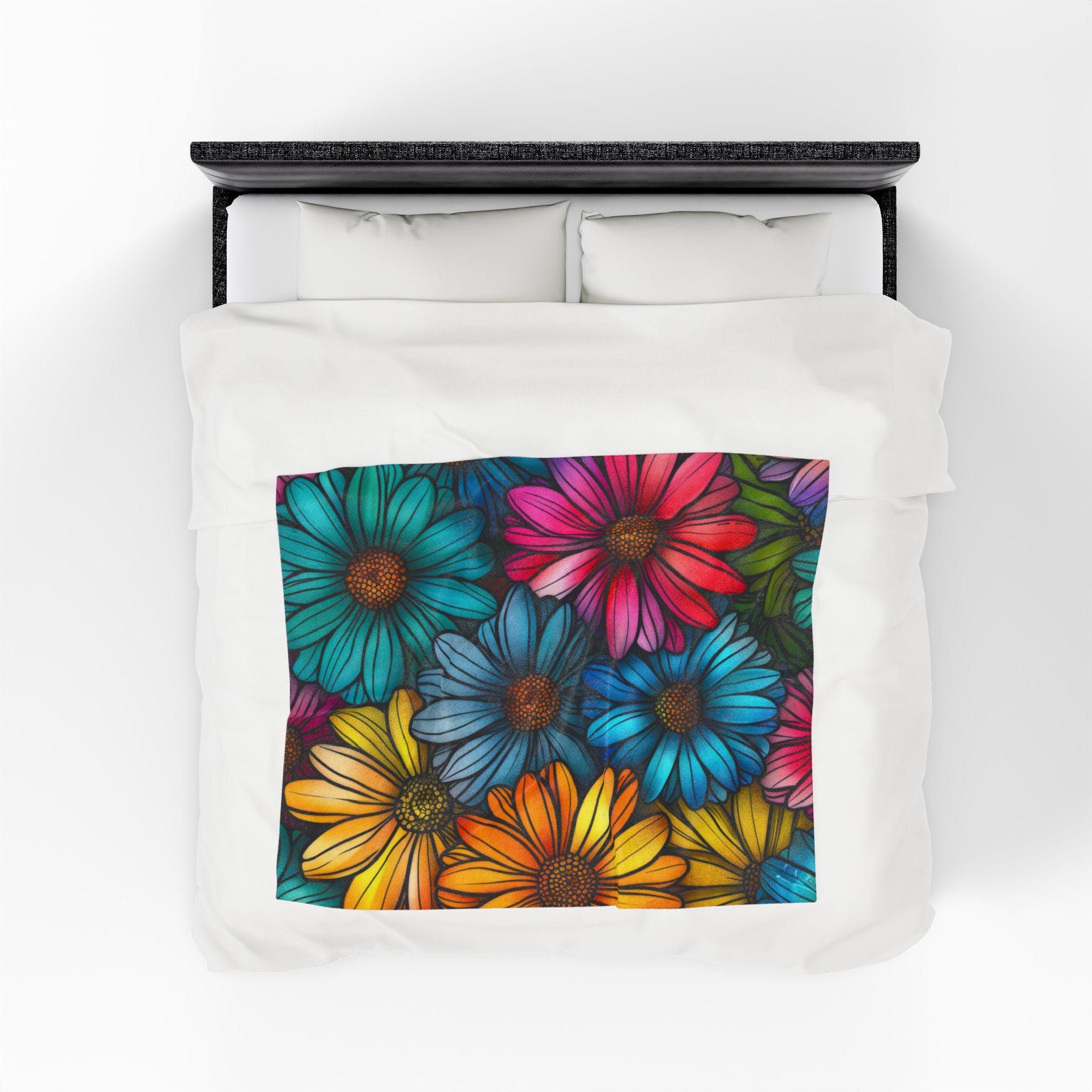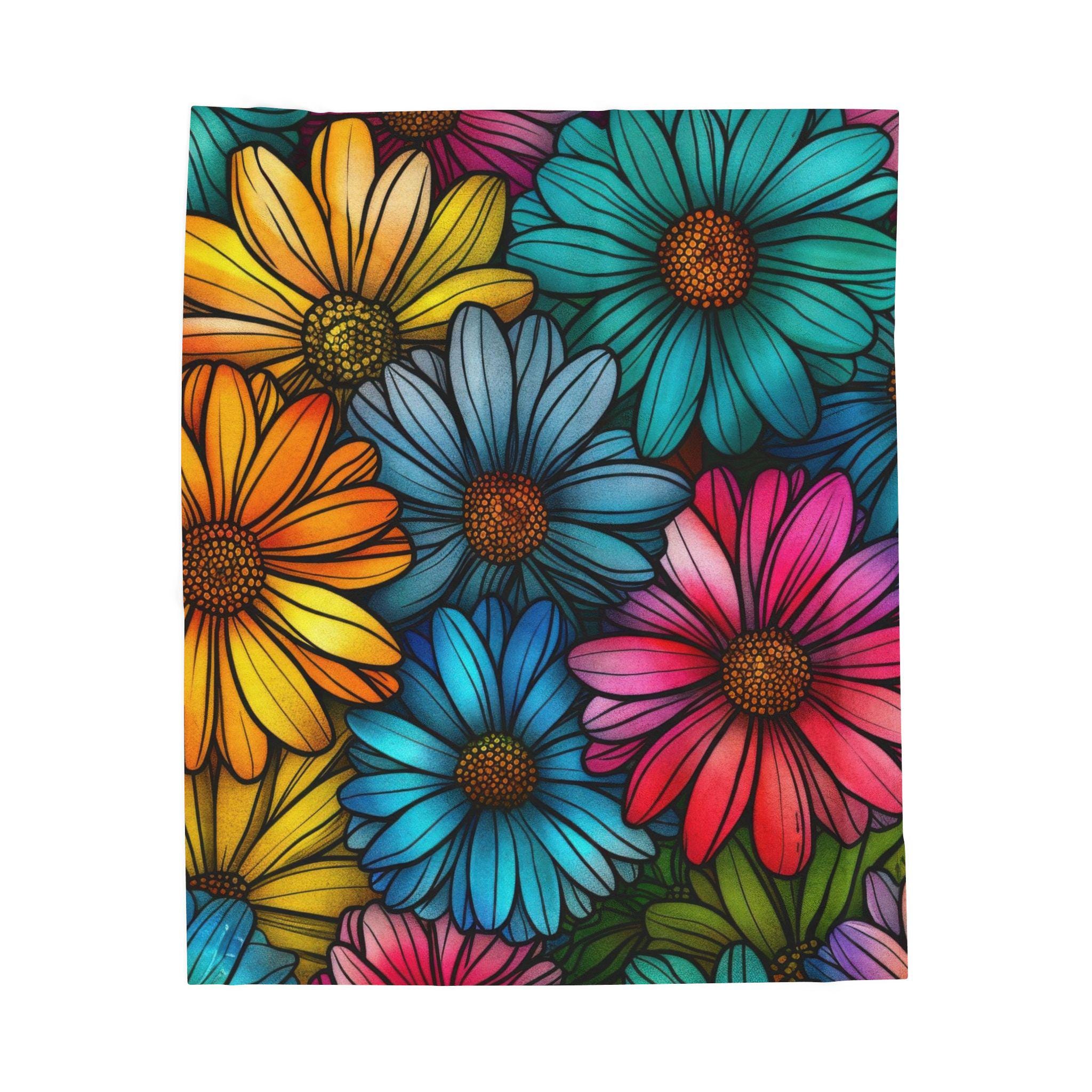 Wrap yourself in a riot of color and comfort. This velveteen plush blanket features a hand-drawn cascade of vividly saturated daisies—sunny yellows, teal blues, and magenta petals—printed in rich, high-detail color on one side. The fabric is sumptuously soft with a medium-heavy weight that drapes like a warm hug on the couch, on a picnic, or over chilled shoulders during late-night reading. Durable double-needle topstitching keeps the edges neat after many cozy nights, while the quick-drying polyester blend maintains the blanket’s plush feel and brilliant hues. It brings a touch of cheerful, botanical energy to small apartments, artist studios, or any corner that needs a bright, tactile lift.