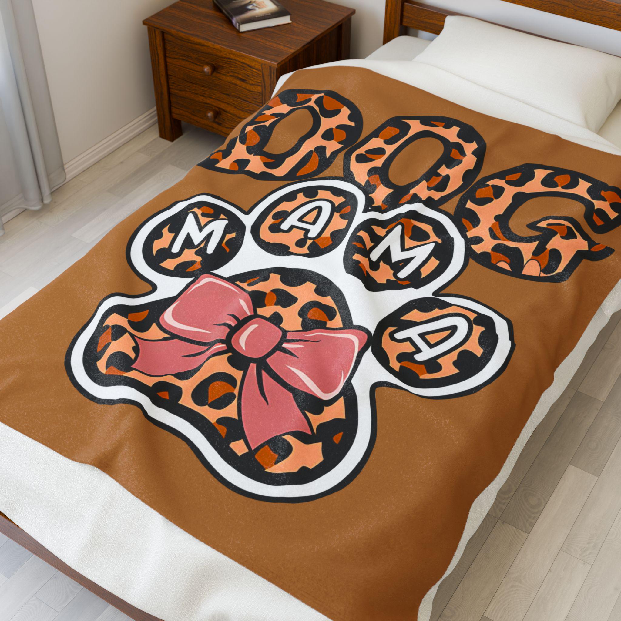 Wrap yourself in cozy, playful warmth with this velveteen plush blanket. Soft, medium heavy-weight fabric hugs you as you curl up on the couch after a long walk with your pup. The bold leopard-print “DOG MAMA” paw design pops in vibrant color on one side, while the reverse stays clean and plush — an easy companion for evening snuggles, car rides to the park, or lazy mornings with coffee and fur at your feet. The blanket’s smooth finish and stitched edges keep the print crisp and the fabric durable, so it stays a familiar comfort through many seasons of cuddles and muddy paws.