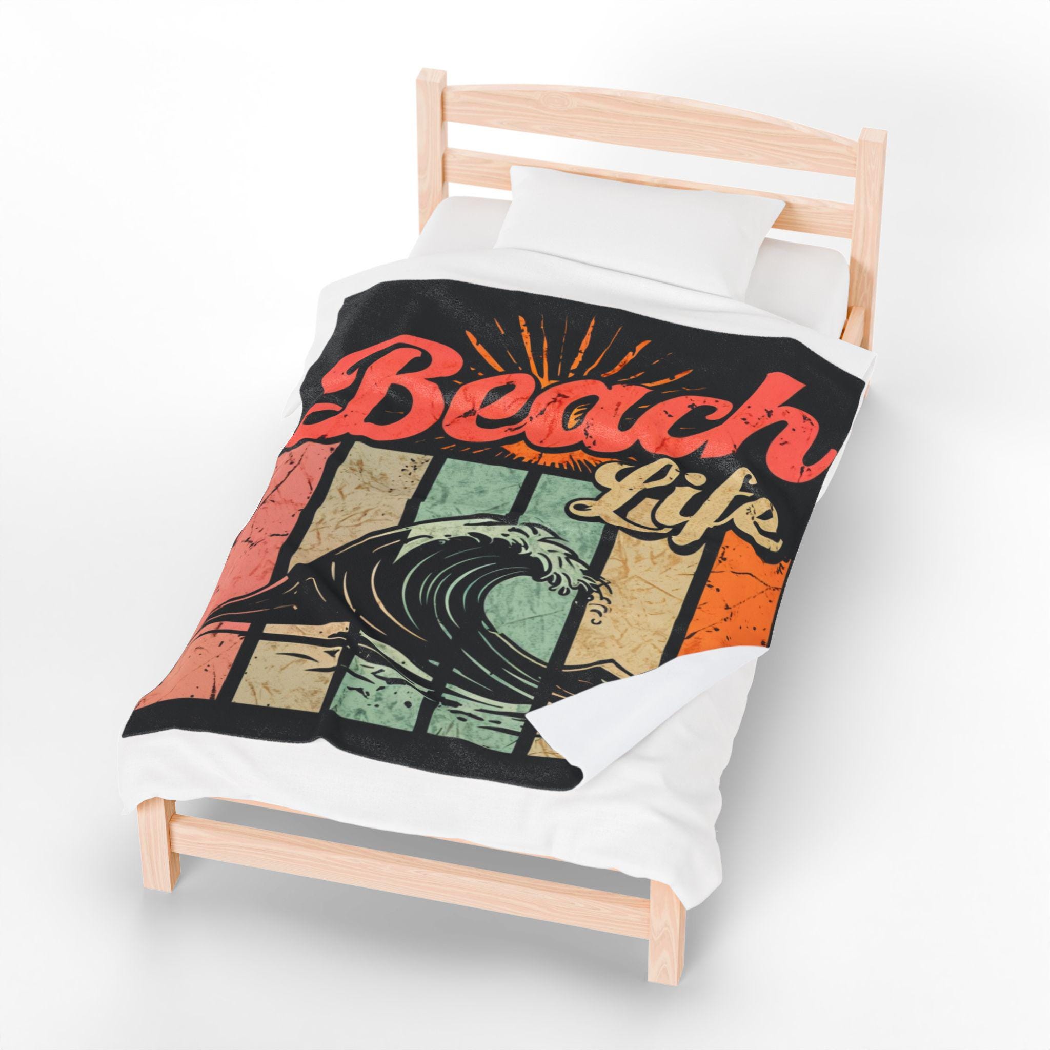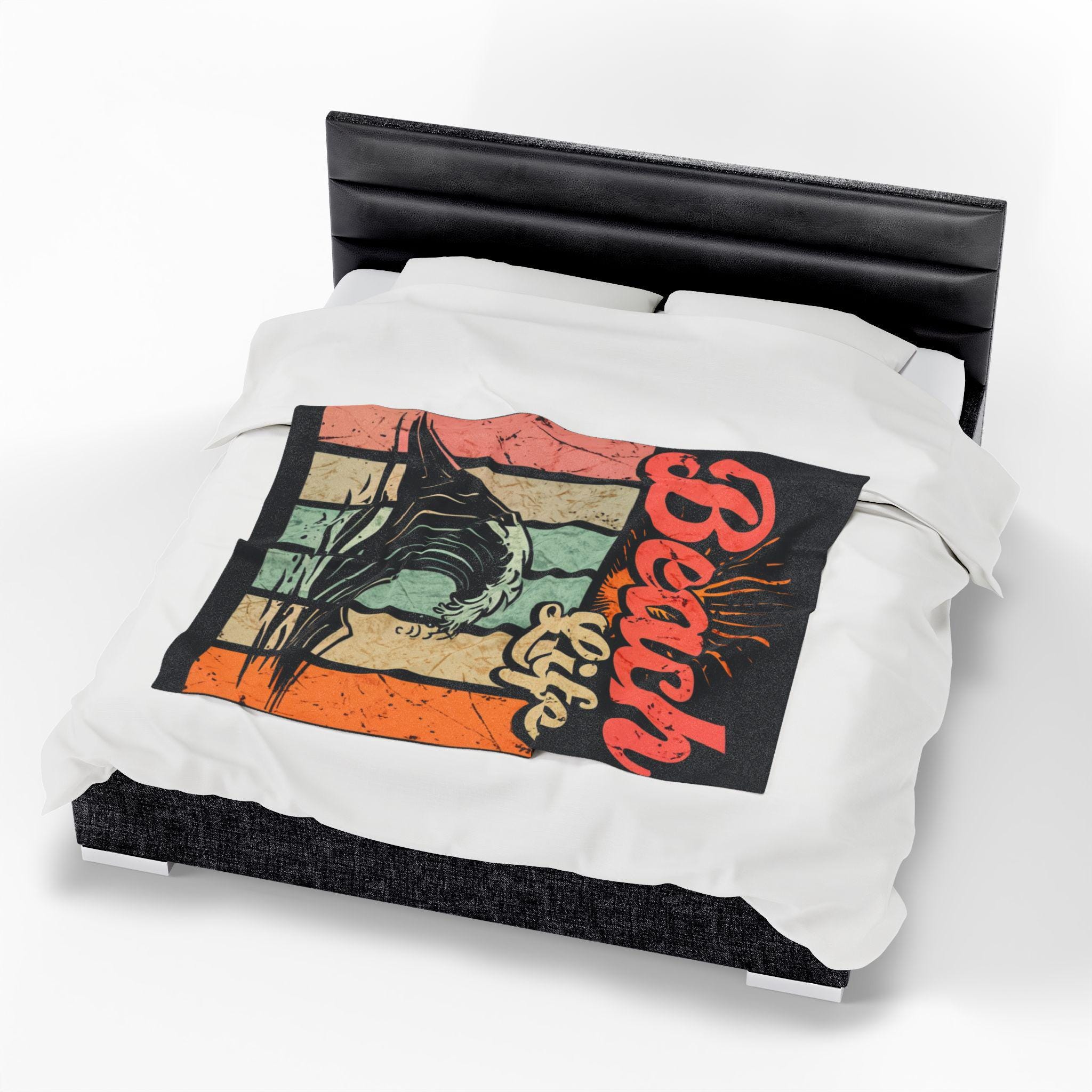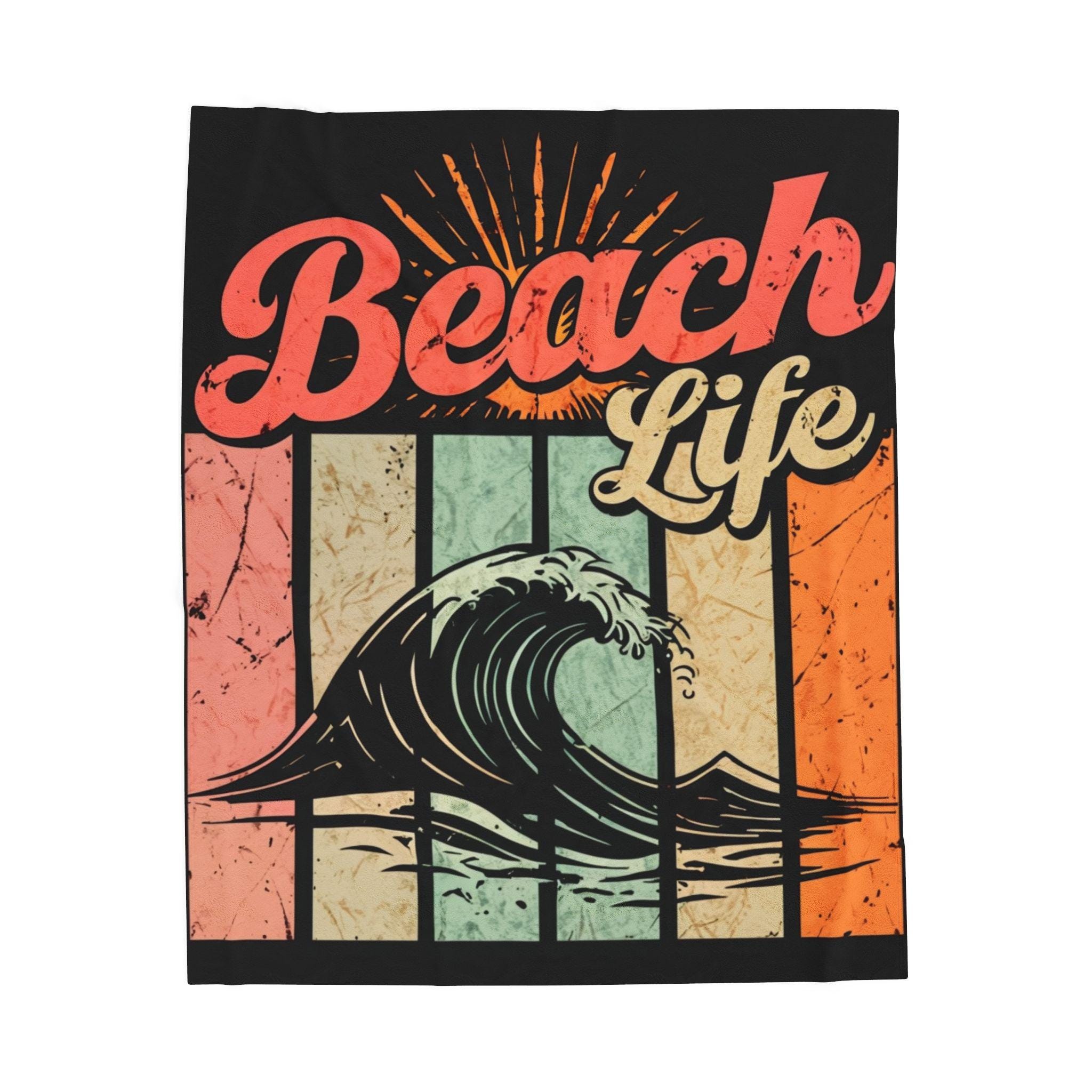 Wrap yourself in a sun-warmed memory. This plush velveteen blanket carries a retro surf graphic — crashing wave, faded sunbursts, and warm pastel stripes — that feels like an afternoon on the shore. The fabric is sumptuously soft against skin and holds bold color on one side, so the artwork stays vivid while the reverse keeps a cozy, neutral finish. Use it as a lightweight throw for chilly evenings on the porch, a layer in your beachside camper, or a comforting drape after a long day of tide-chasing. It settles around you like a familiar soundtrack: salt air, vinyl crackle, and the steady hush of waves.