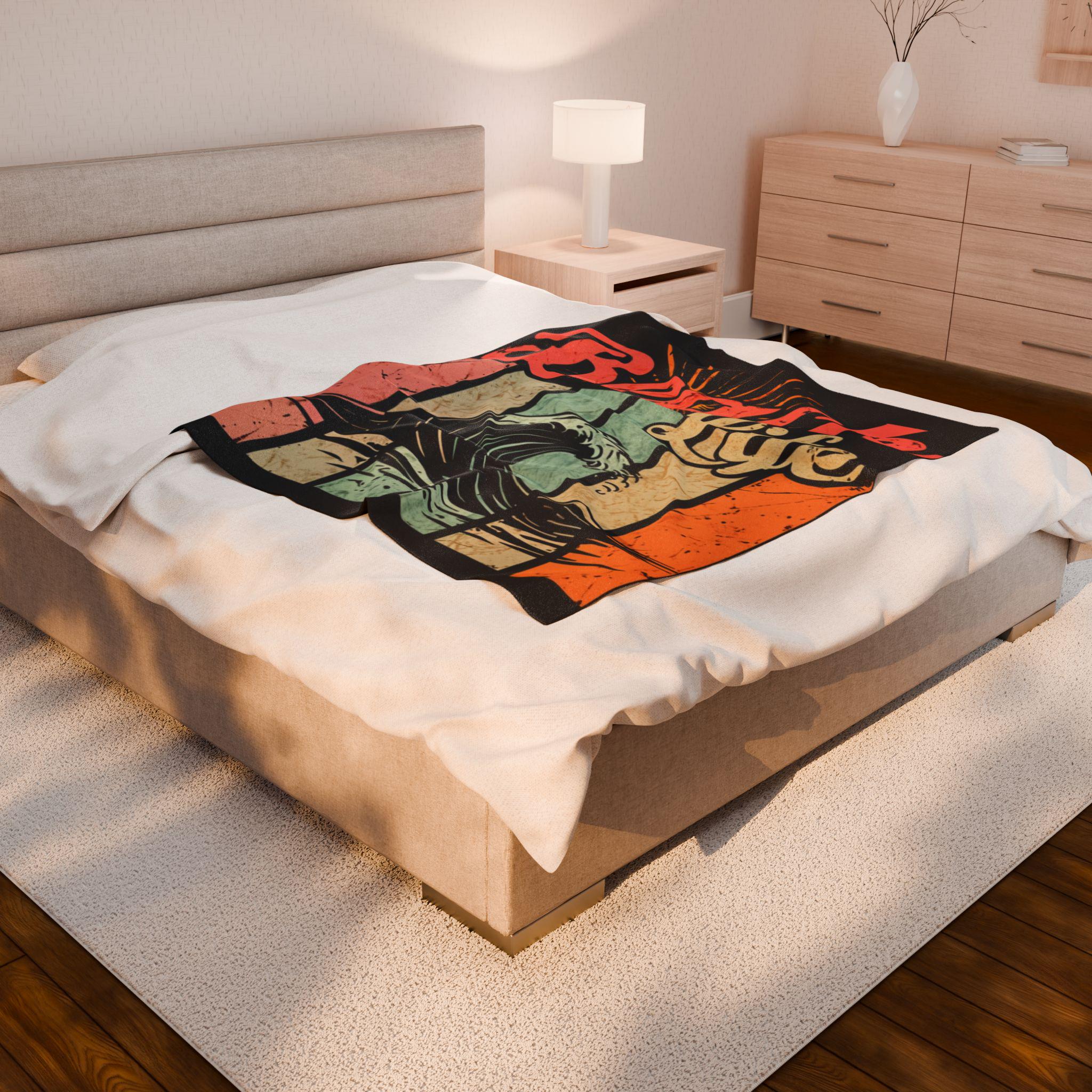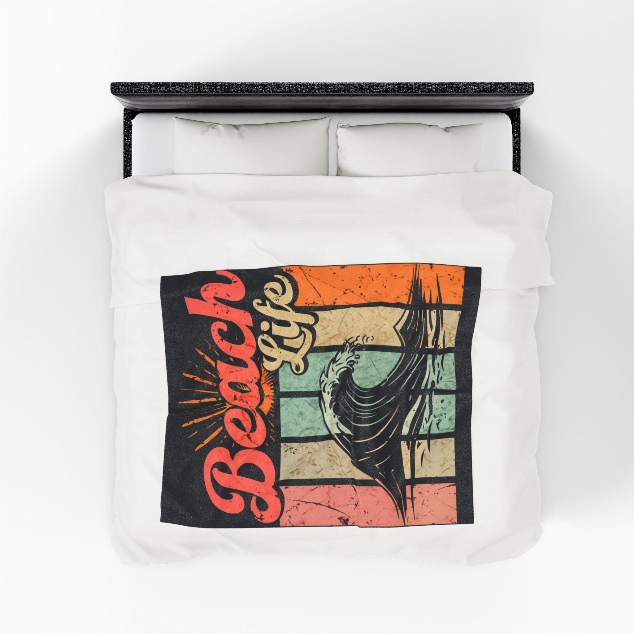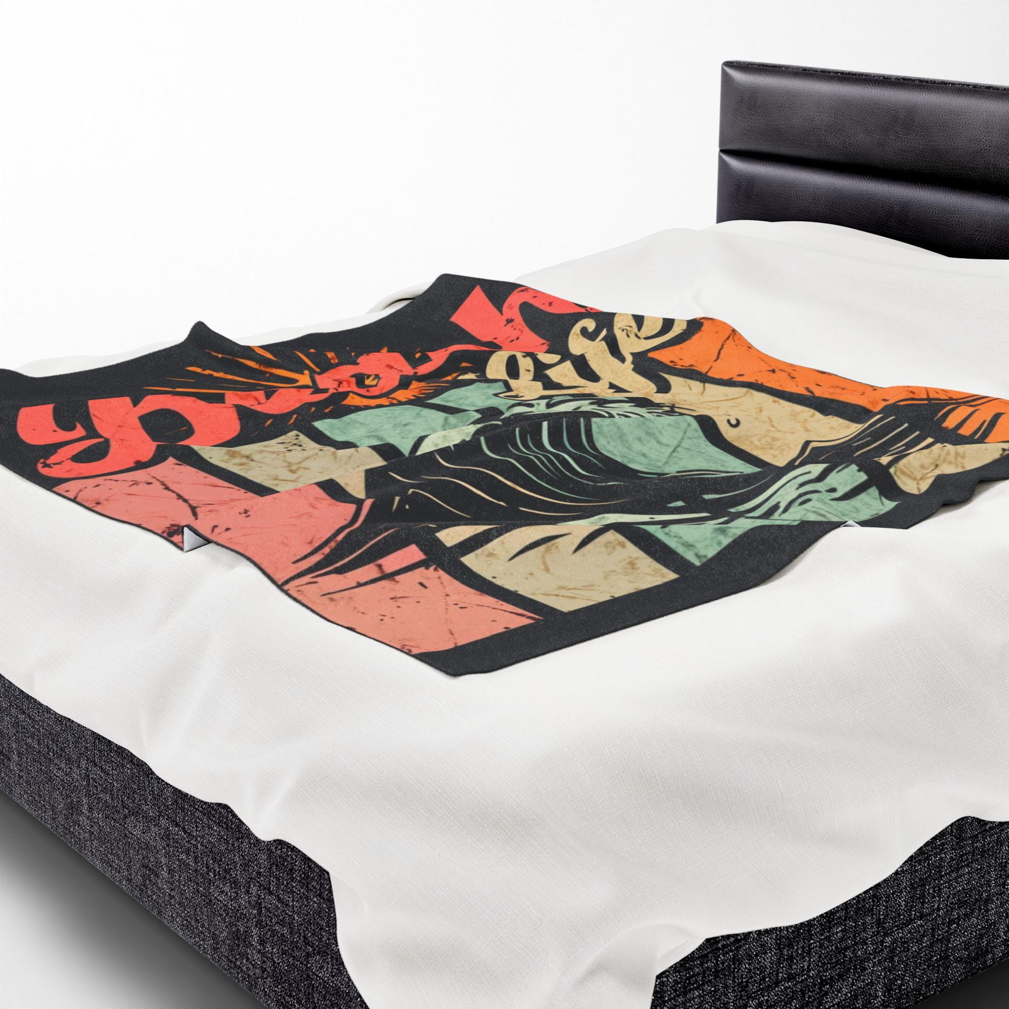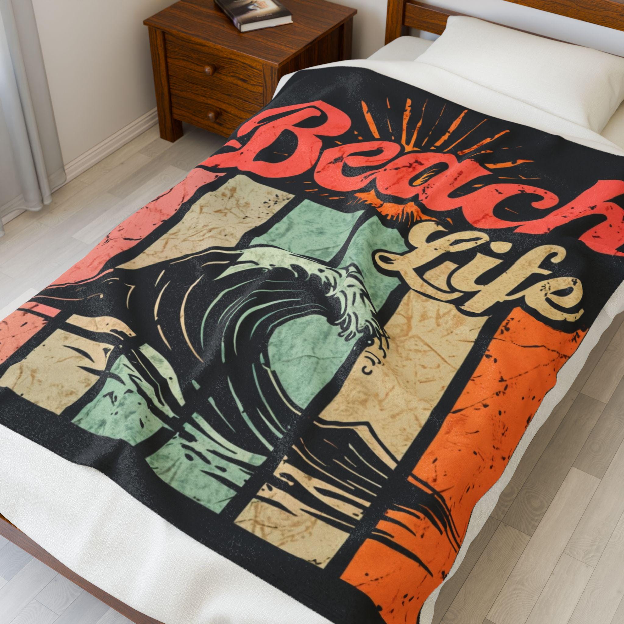 Wrap yourself in a sun-warmed memory. This plush velveteen blanket carries a retro surf graphic — crashing wave, faded sunbursts, and warm pastel stripes — that feels like an afternoon on the shore. The fabric is sumptuously soft against skin and holds bold color on one side, so the artwork stays vivid while the reverse keeps a cozy, neutral finish. Use it as a lightweight throw for chilly evenings on the porch, a layer in your beachside camper, or a comforting drape after a long day of tide-chasing. It settles around you like a familiar soundtrack: salt air, vinyl crackle, and the steady hush of waves.