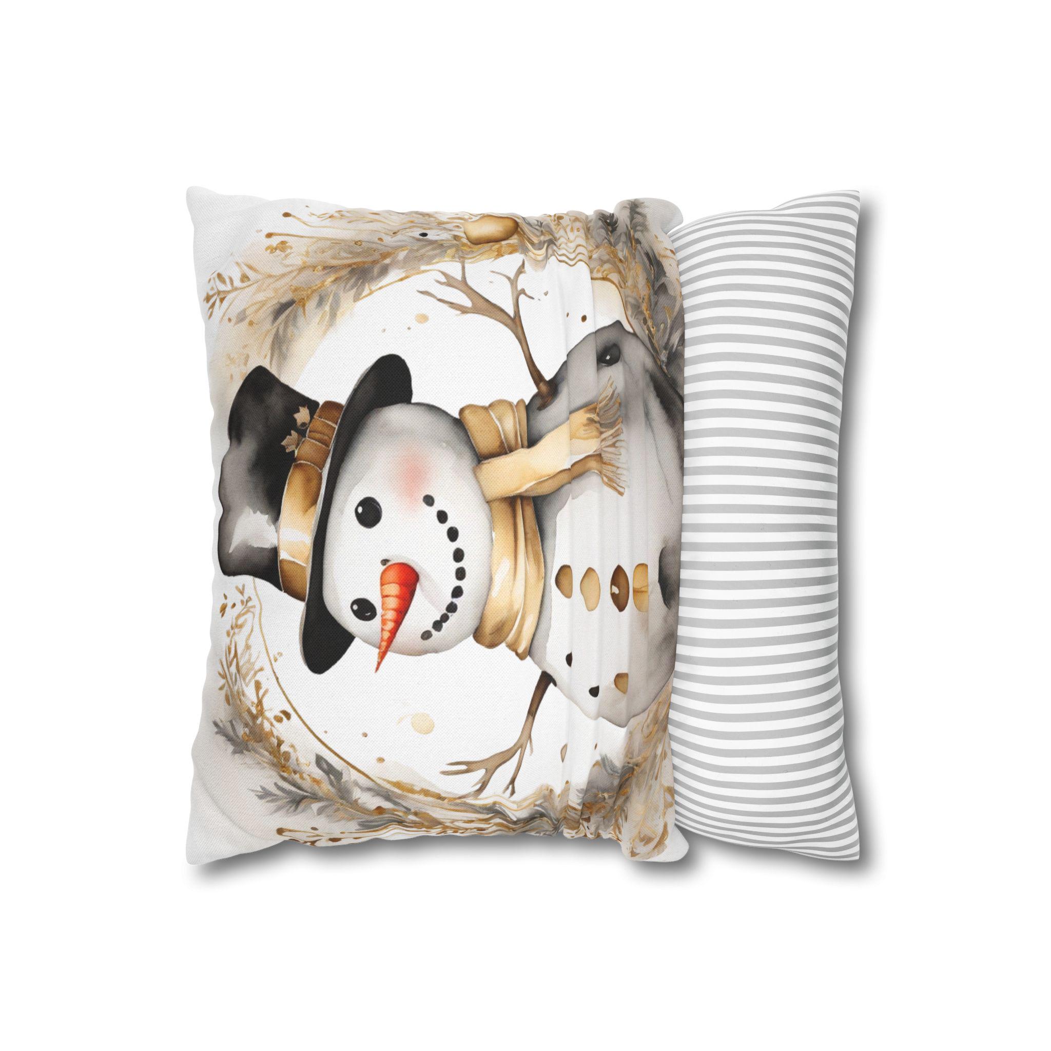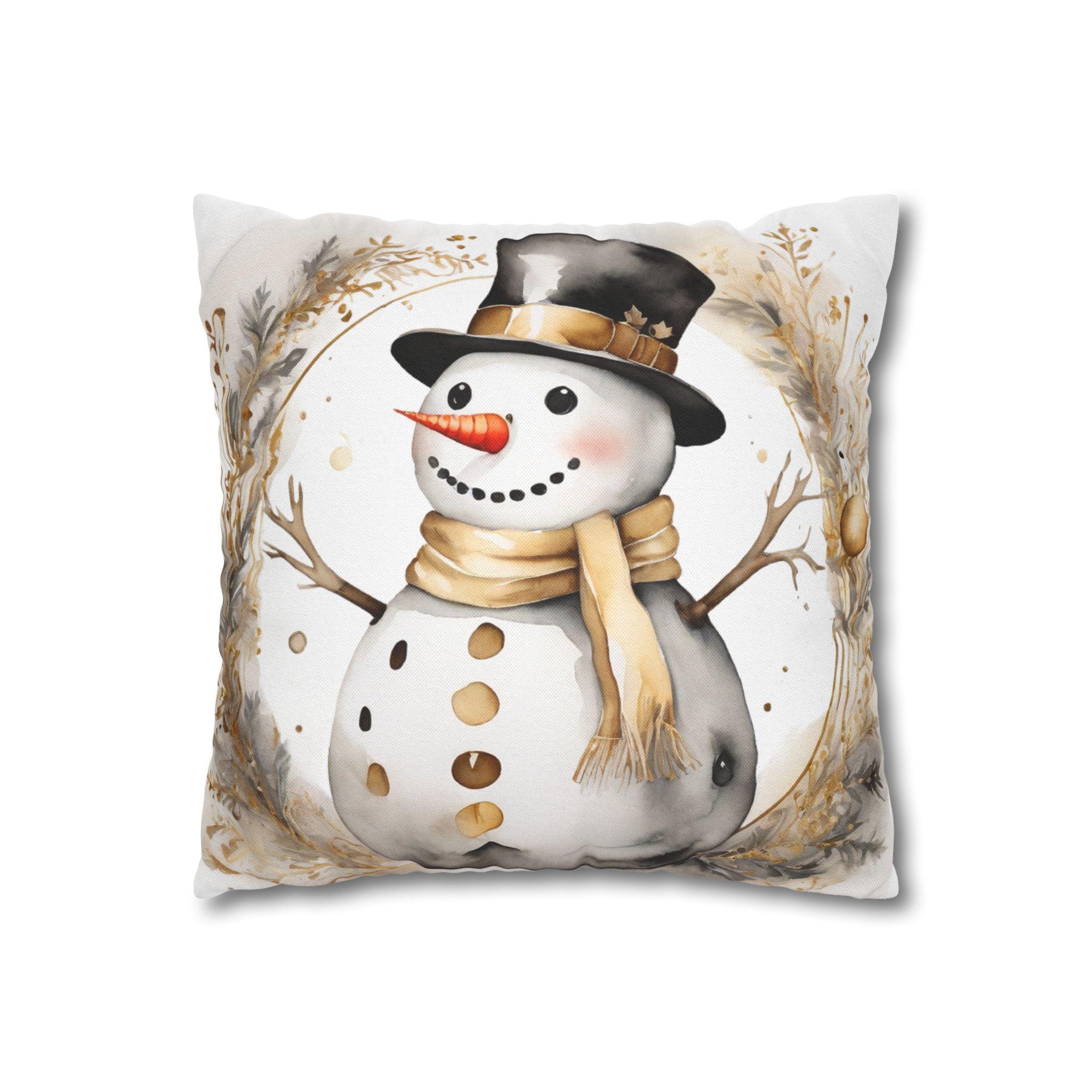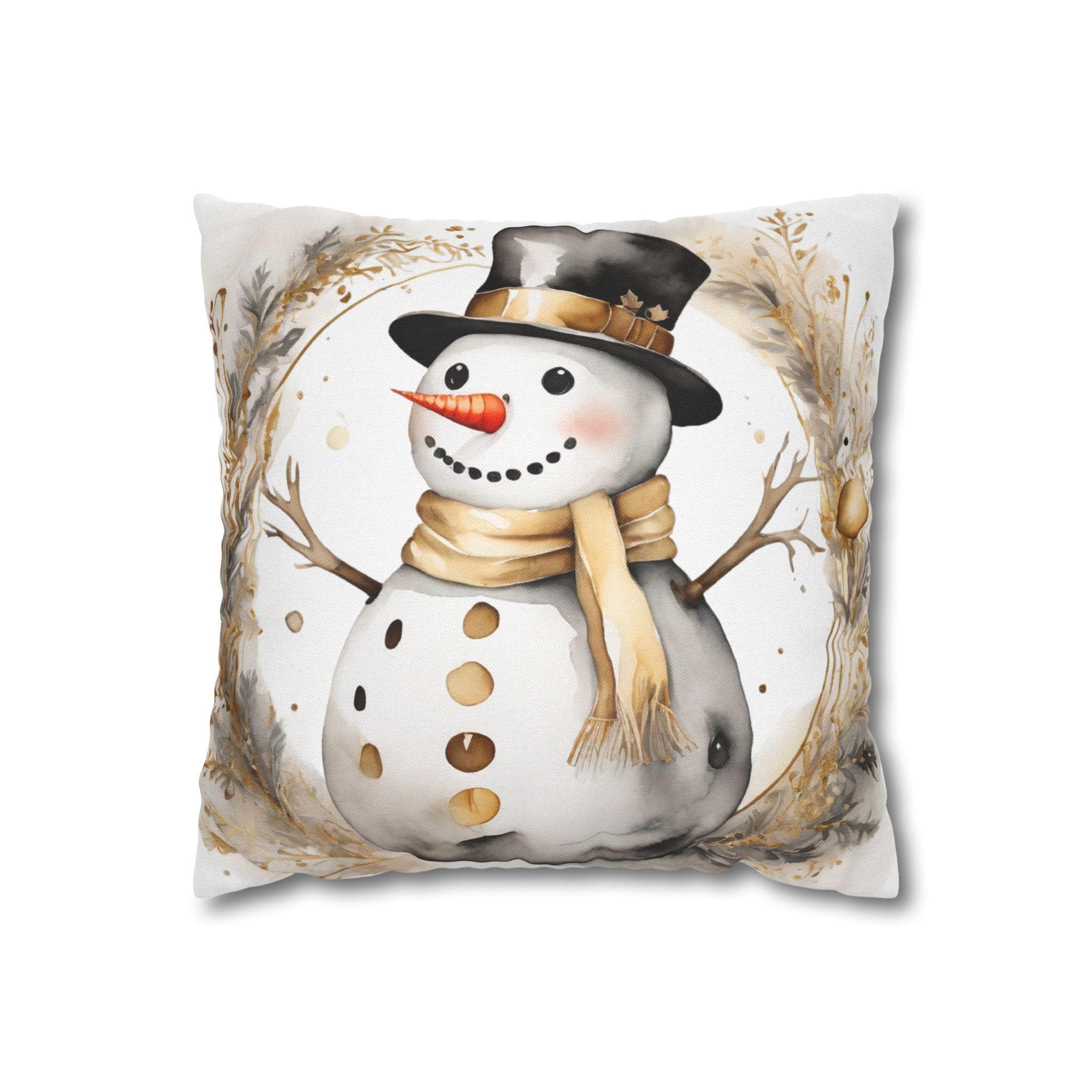 Soft, square throw pillow cover illustrated with a warm-toned snowman framed by delicate winter foliage. The watercolor-style art uses creamy beiges, muted golds and soft charcoal accents for a cozy, vintage-inspired look. The double-sided print keeps the design visible from every angle, while a concealed beige zipper preserves a clean edge. Slip this cover over your own insert to add a gentle, seasonal touch to a sofa, reading nook, or entry bench. It’s unobtrusive, comforting, and made to layer with neutral, farmhouse, or rustic holiday decor.