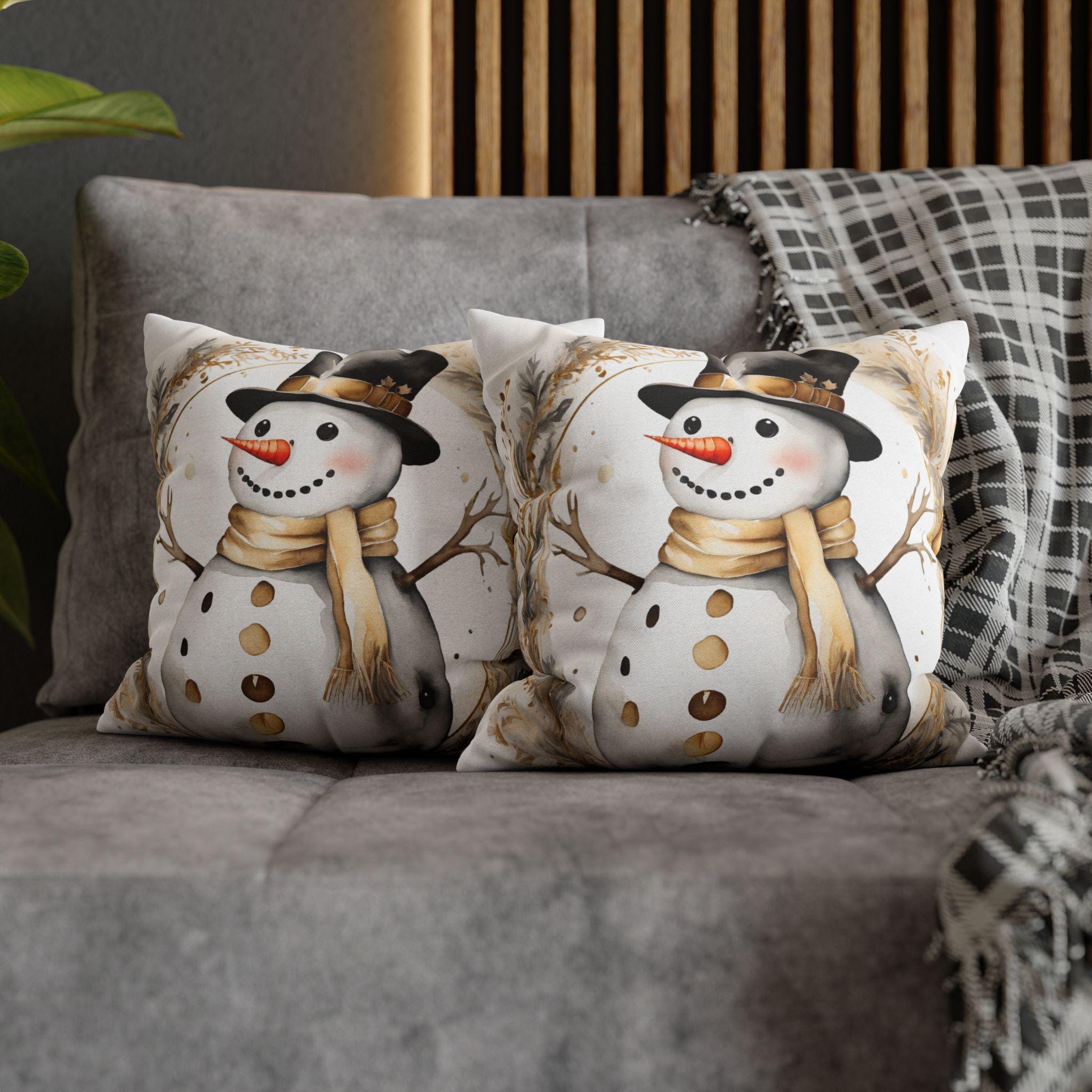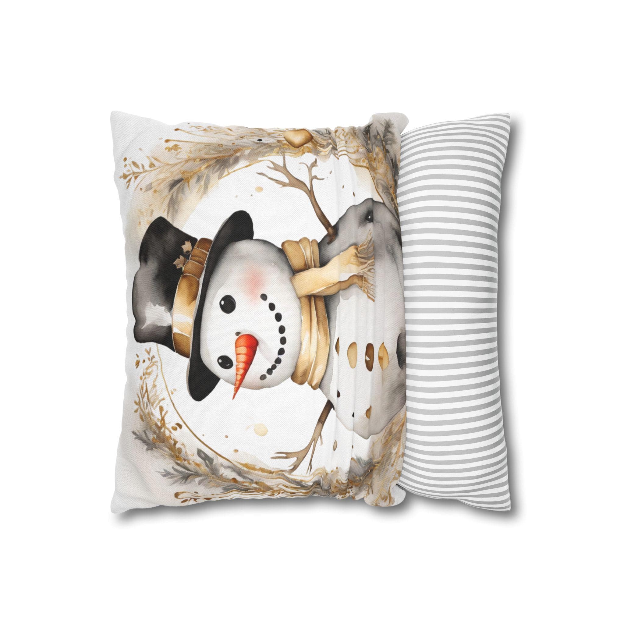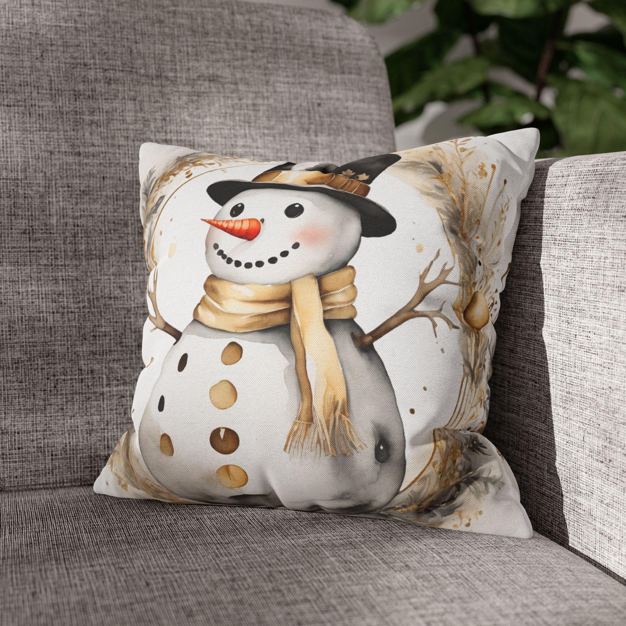 Soft, square throw pillow cover illustrated with a warm-toned snowman framed by delicate winter foliage. The watercolor-style art uses creamy beiges, muted golds and soft charcoal accents for a cozy, vintage-inspired look. The double-sided print keeps the design visible from every angle, while a concealed beige zipper preserves a clean edge. Slip this cover over your own insert to add a gentle, seasonal touch to a sofa, reading nook, or entry bench. It’s unobtrusive, comforting, and made to layer with neutral, farmhouse, or rustic holiday decor.