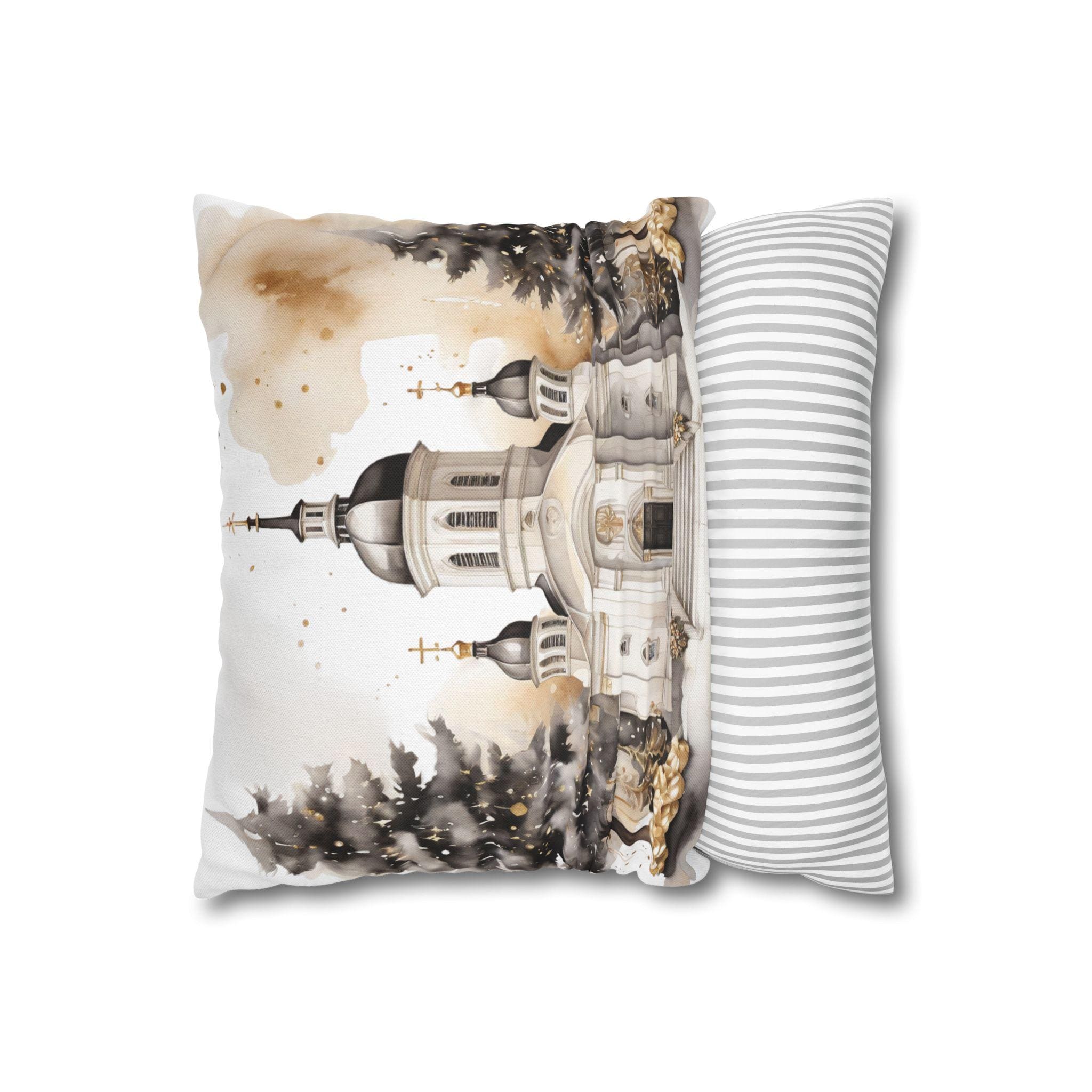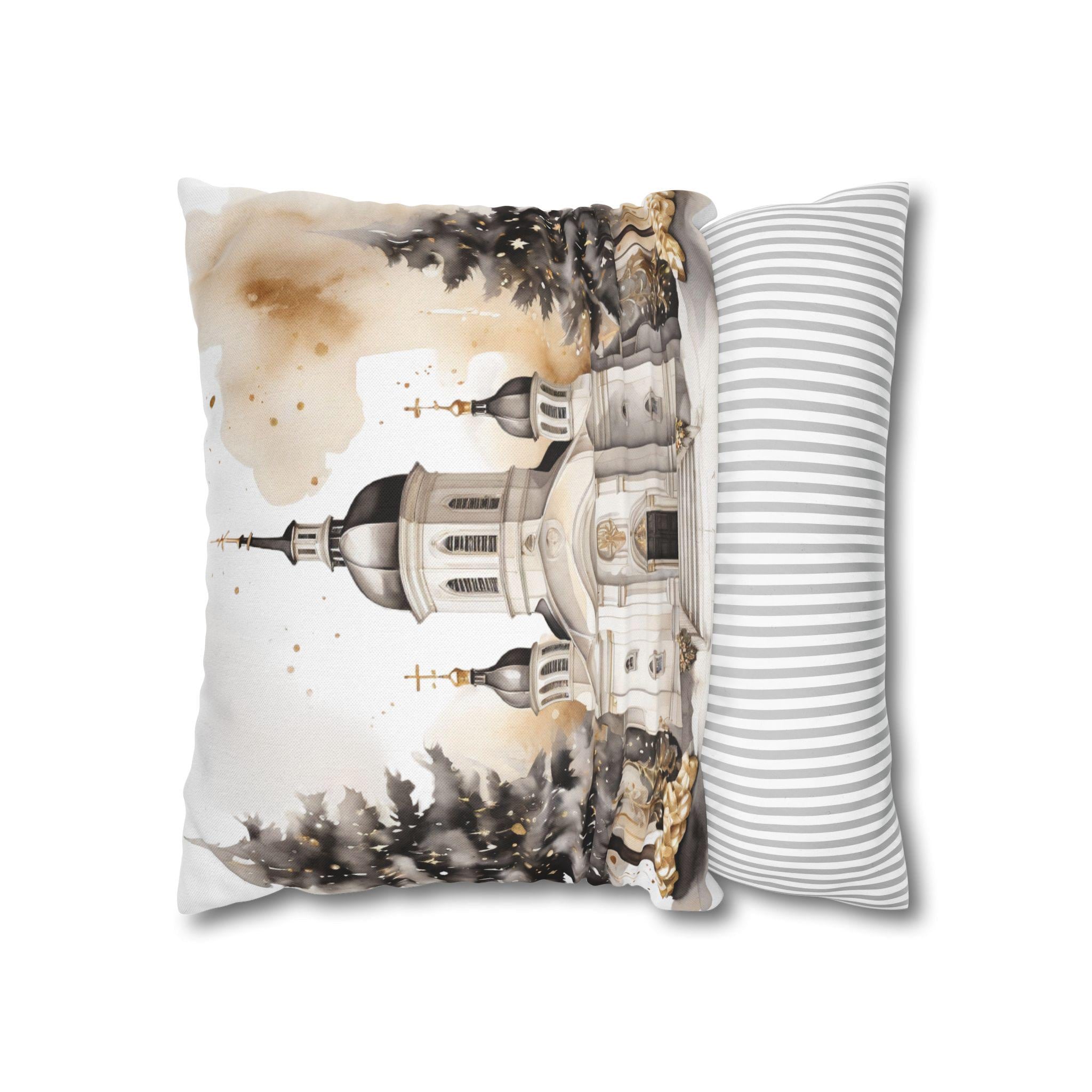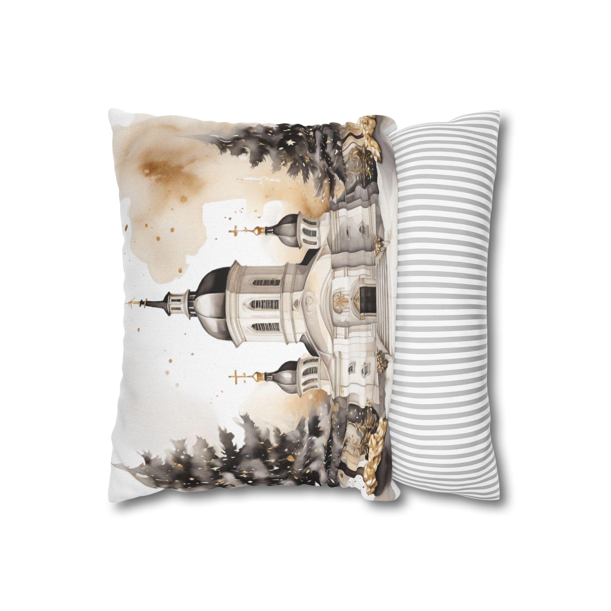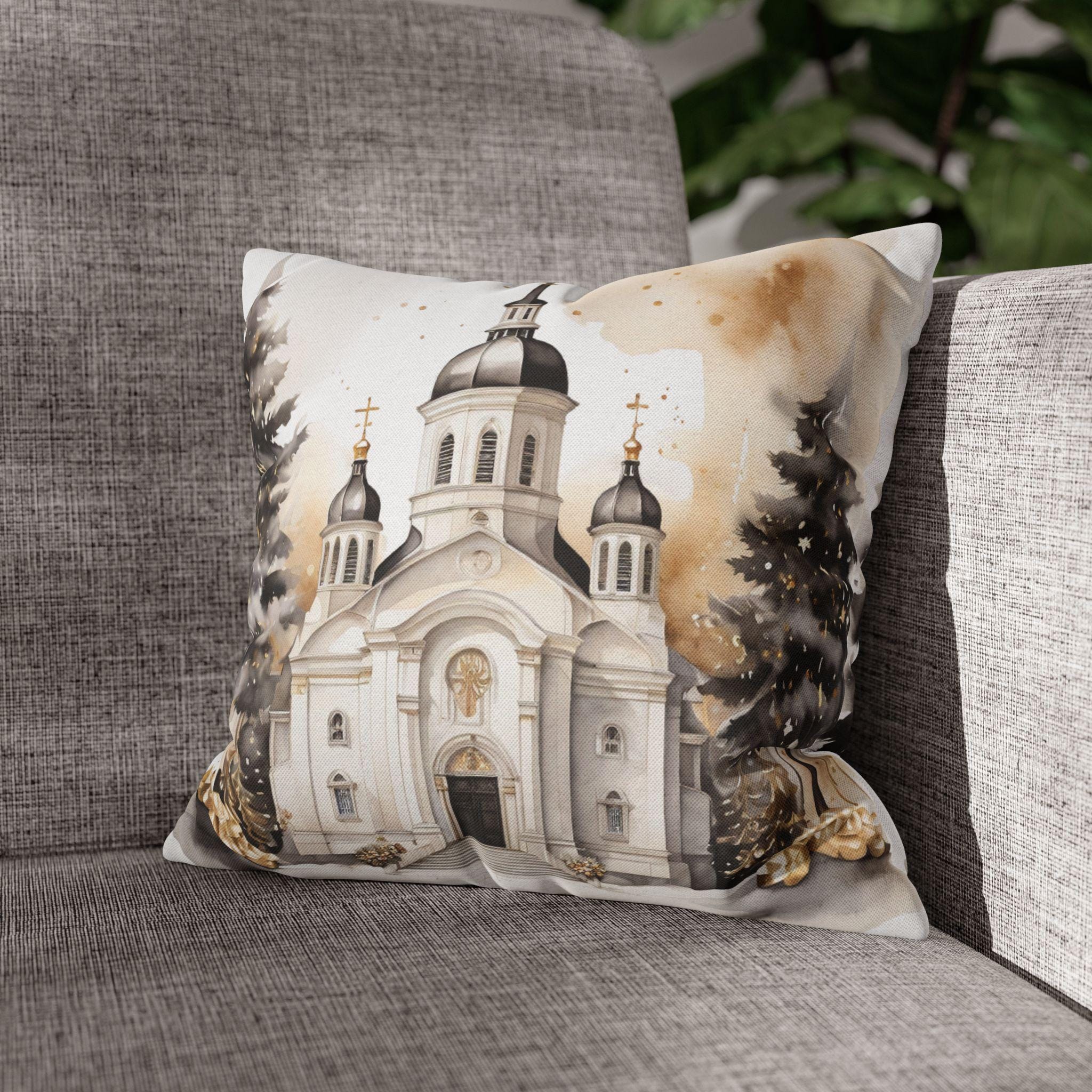 Soft, sculpted lines of a snow-dusted cathedral come to life on a spun polyester square throw pillow cover. The artwork blends warm sepia tones with gentle white highlights, evoking quiet winter mornings and the hush of fresh snowfall around steeples and pines. The double-sided print keeps the scene visible from any angle, while the concealed zipper maintains a seamless look. Slip this cover over your favorite insert to add a calm, elegant centerpiece to a mantel, window seat, or cozy reading nook.
