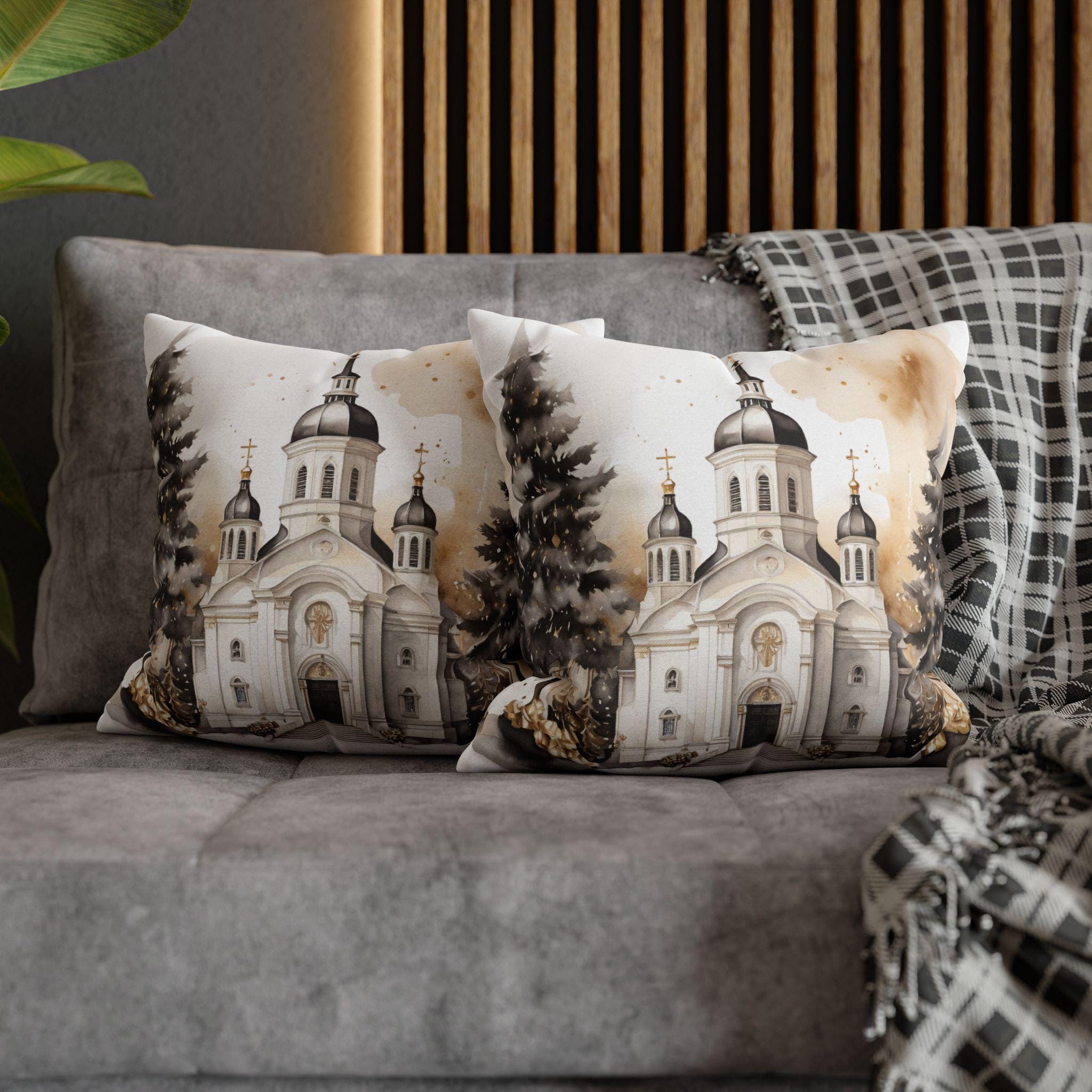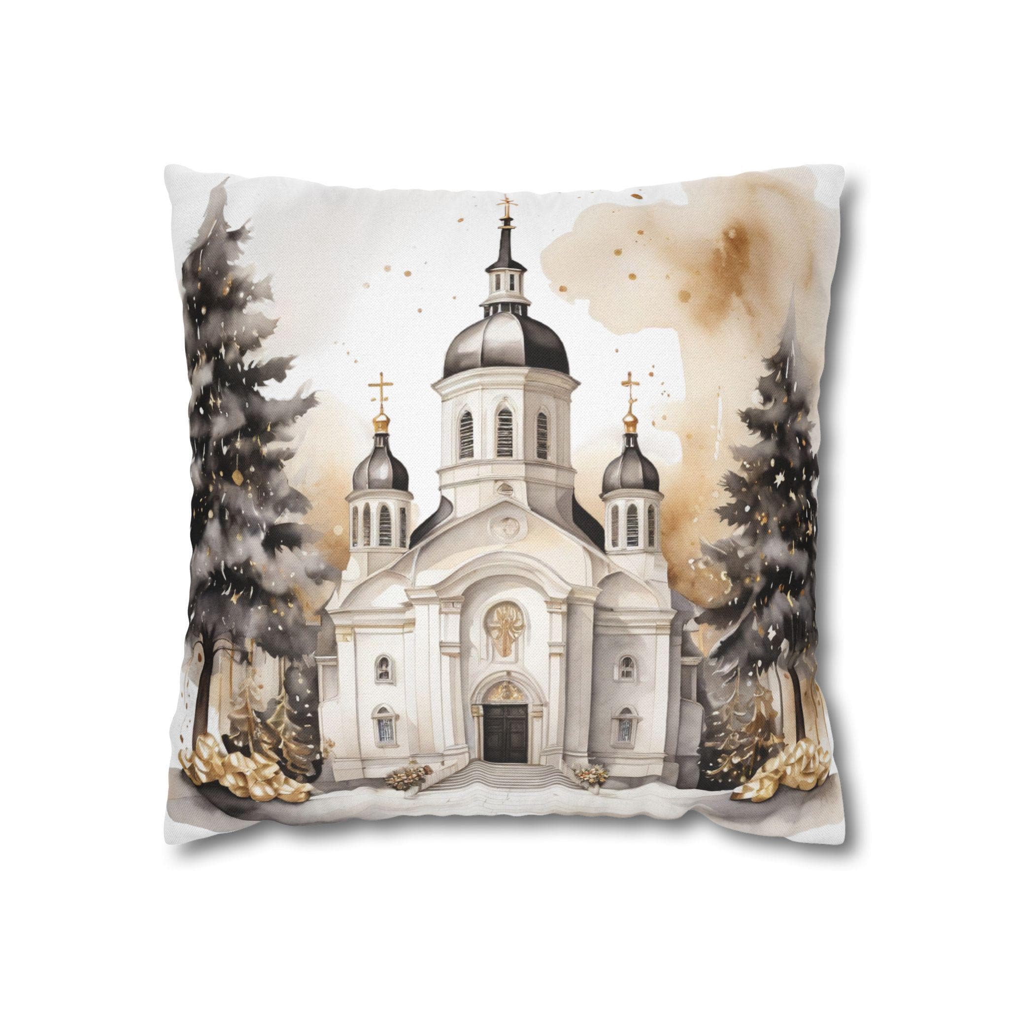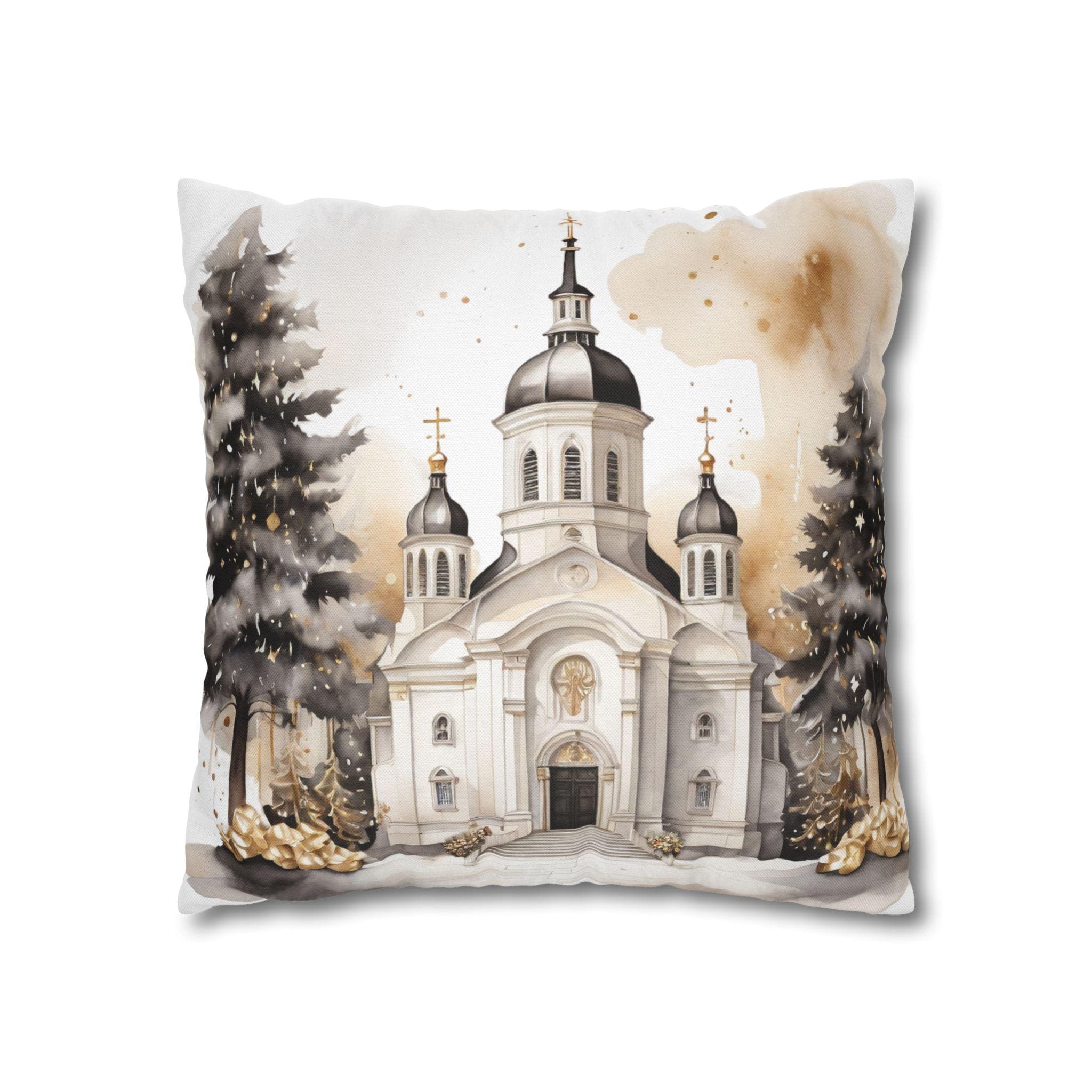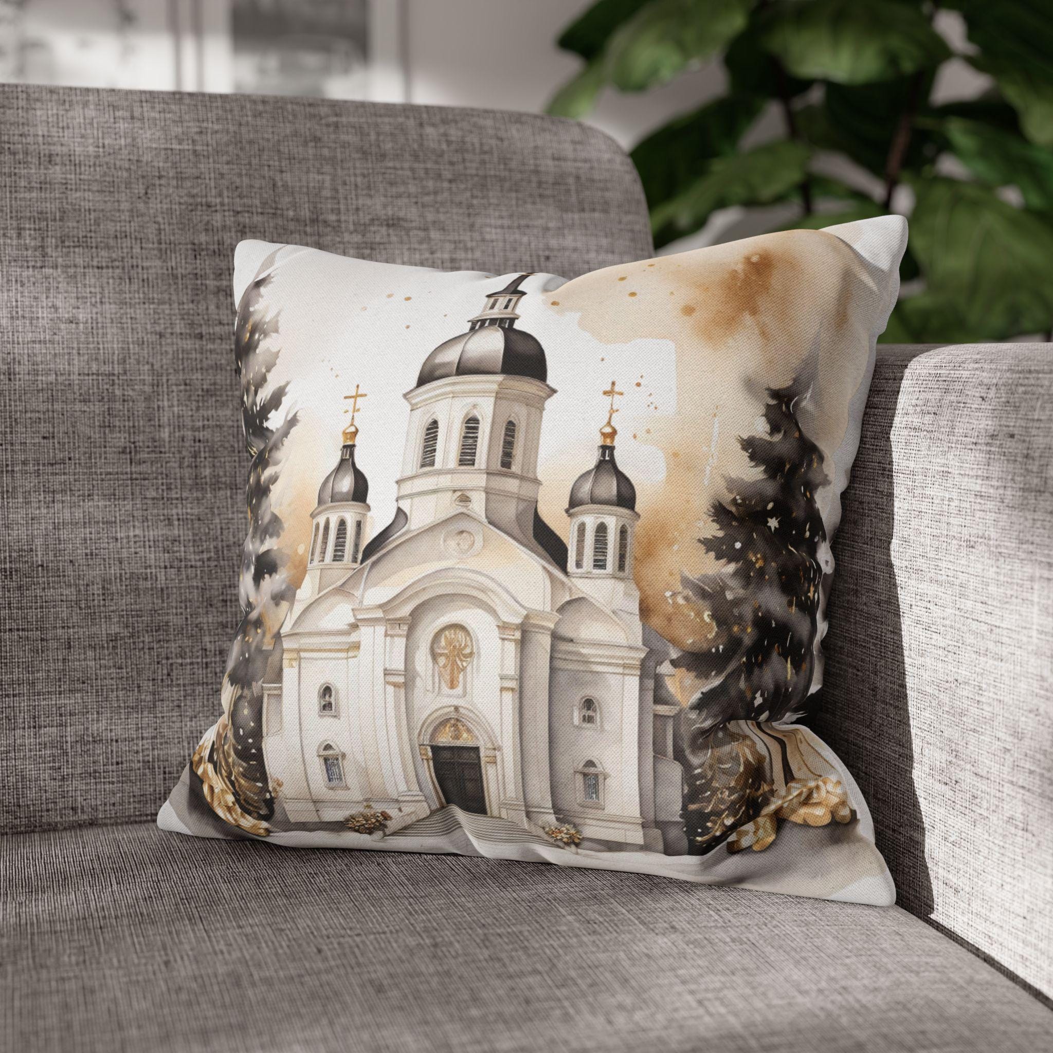 Soft, sculpted lines of a snow-dusted cathedral come to life on a spun polyester square throw pillow cover. The artwork blends warm sepia tones with gentle white highlights, evoking quiet winter mornings and the hush of fresh snowfall around steeples and pines. The double-sided print keeps the scene visible from any angle, while the concealed zipper maintains a seamless look. Slip this cover over your favorite insert to add a calm, elegant centerpiece to a mantel, window seat, or cozy reading nook.