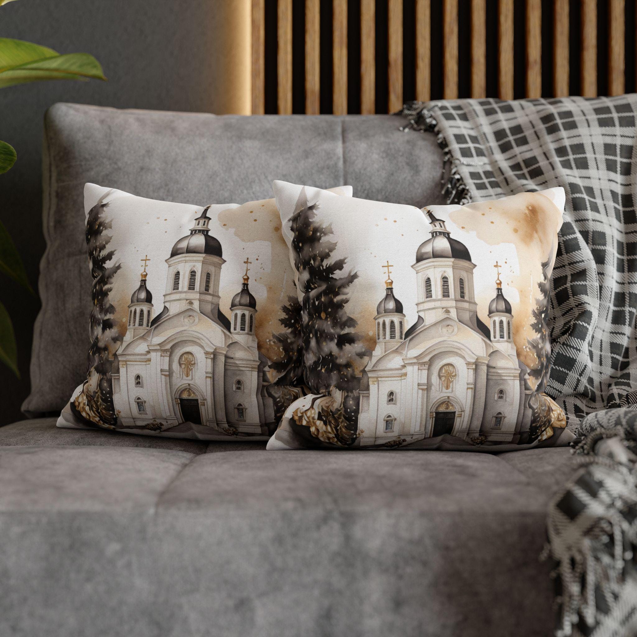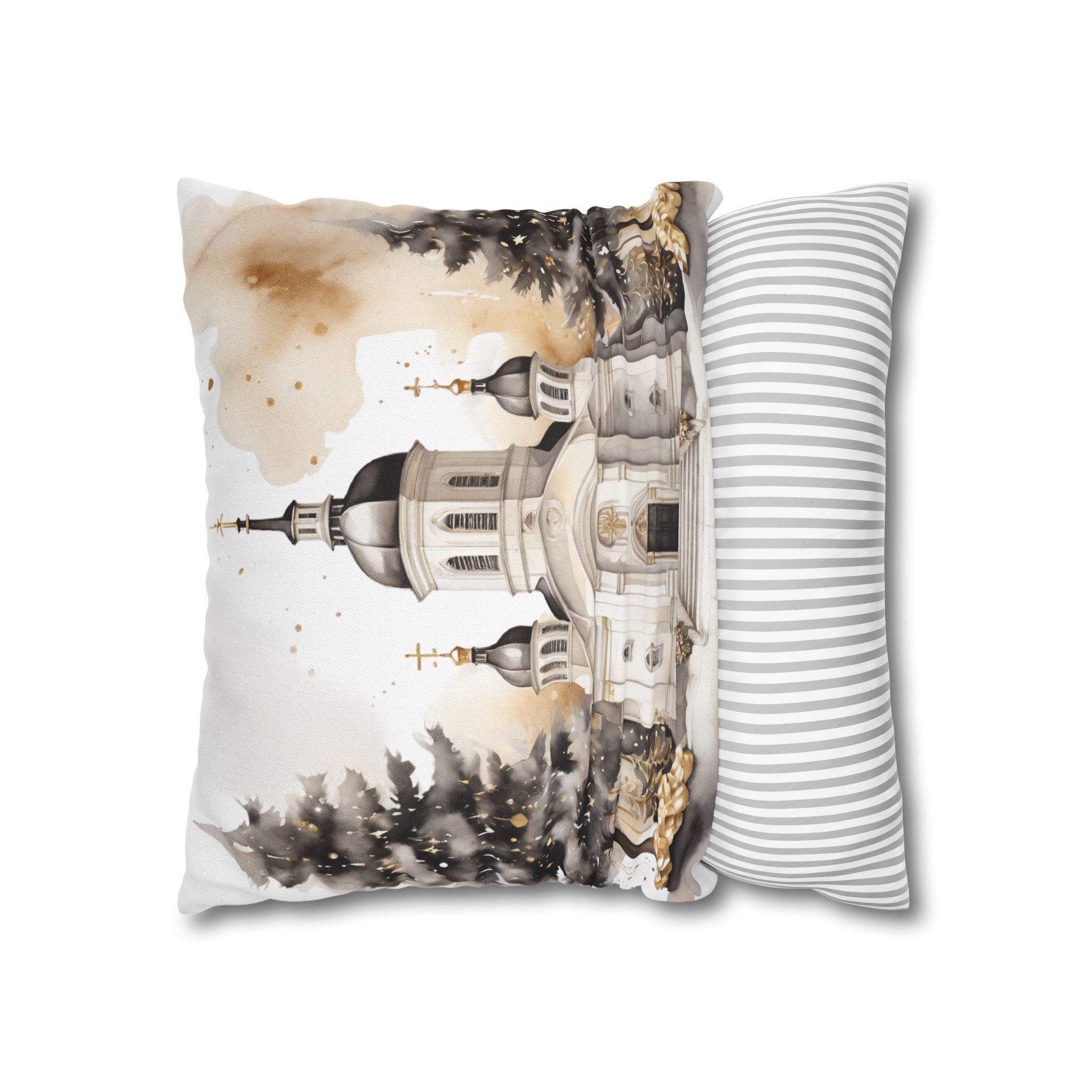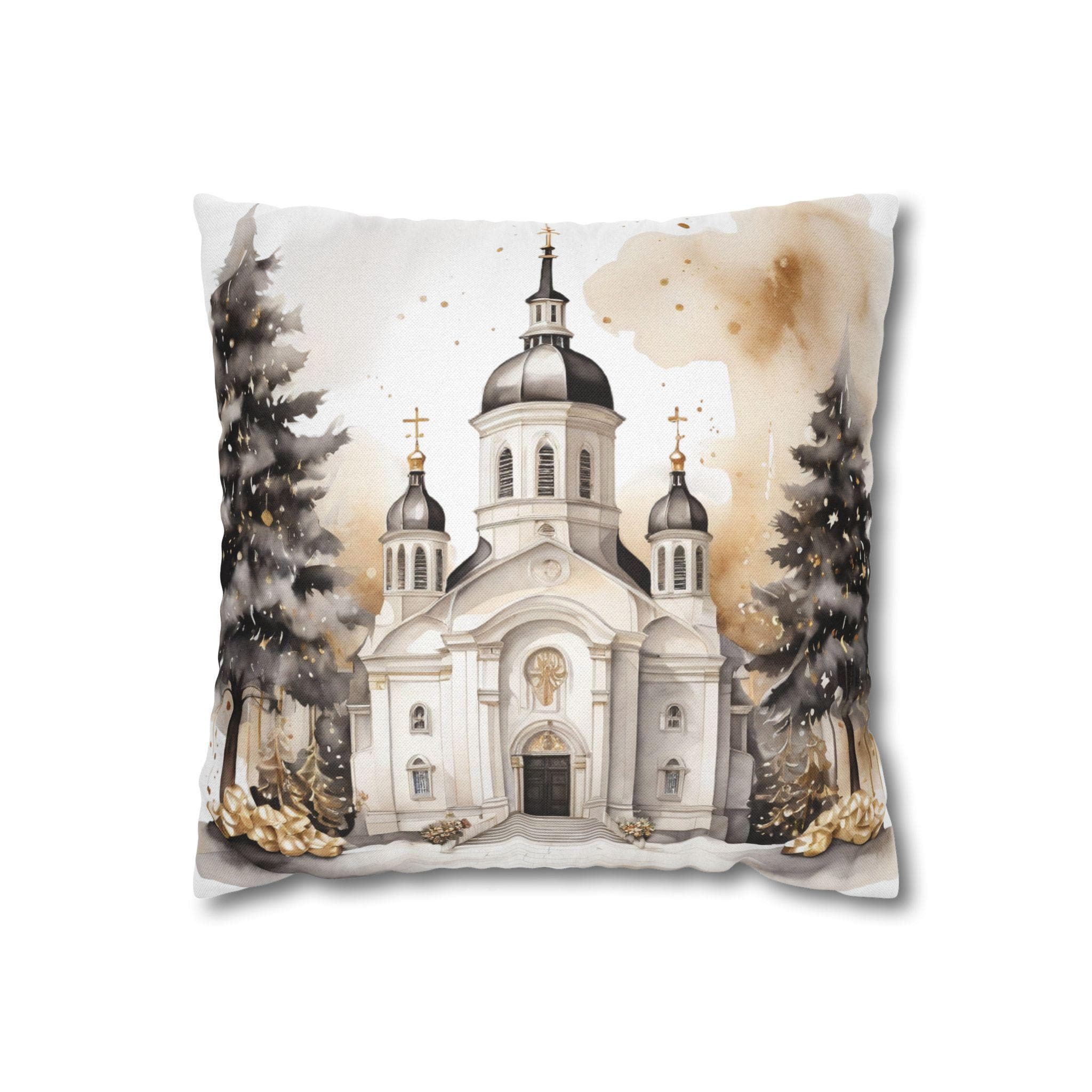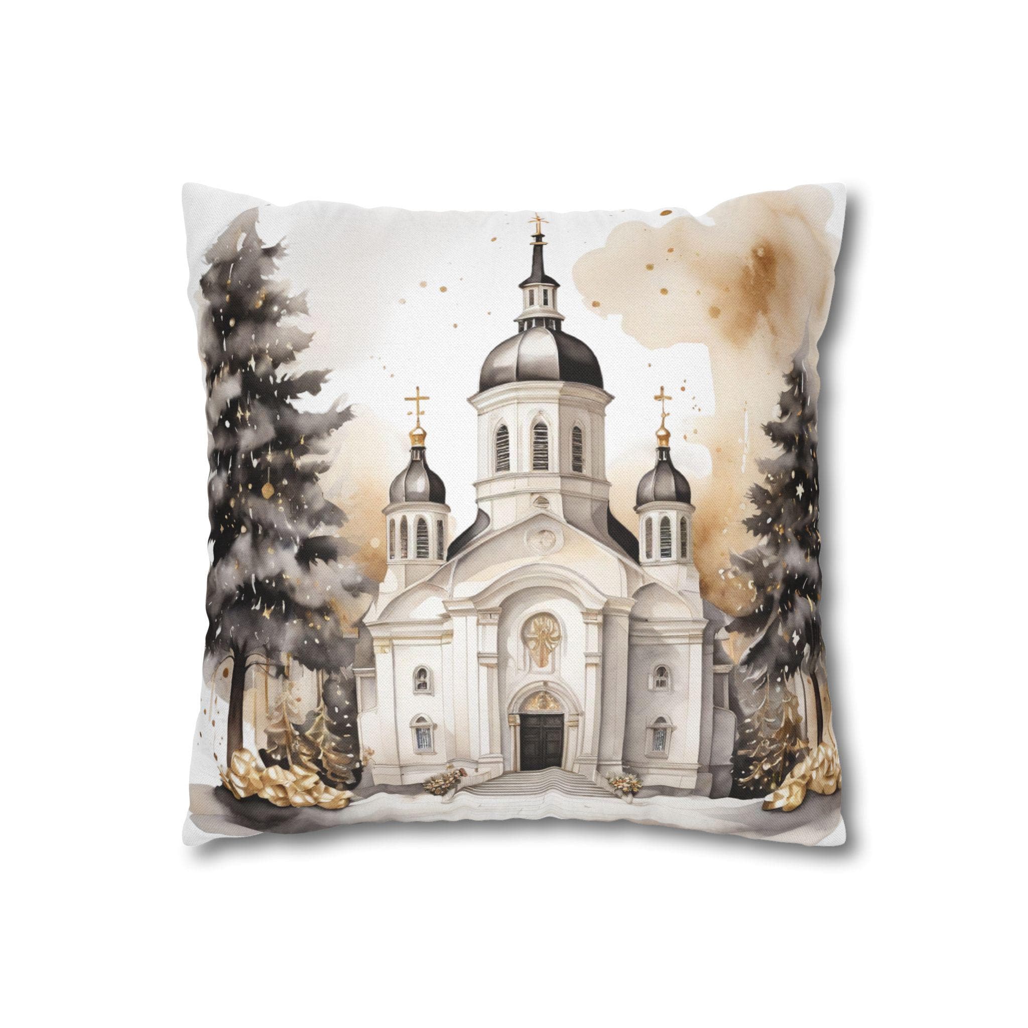 Soft, sculpted lines of a snow-dusted cathedral come to life on a spun polyester square throw pillow cover. The artwork blends warm sepia tones with gentle white highlights, evoking quiet winter mornings and the hush of fresh snowfall around steeples and pines. The double-sided print keeps the scene visible from any angle, while the concealed zipper maintains a seamless look. Slip this cover over your favorite insert to add a calm, elegant centerpiece to a mantel, window seat, or cozy reading nook.