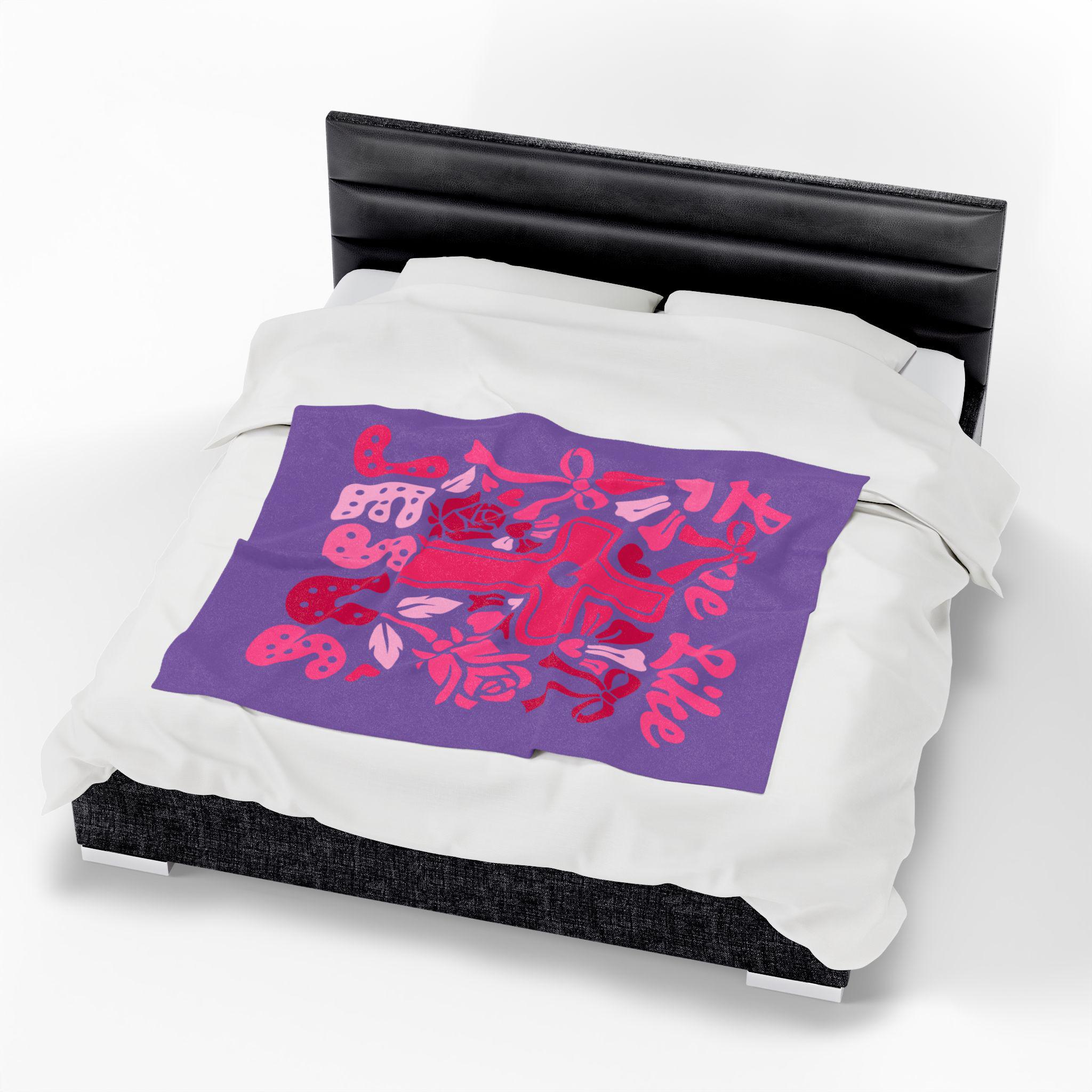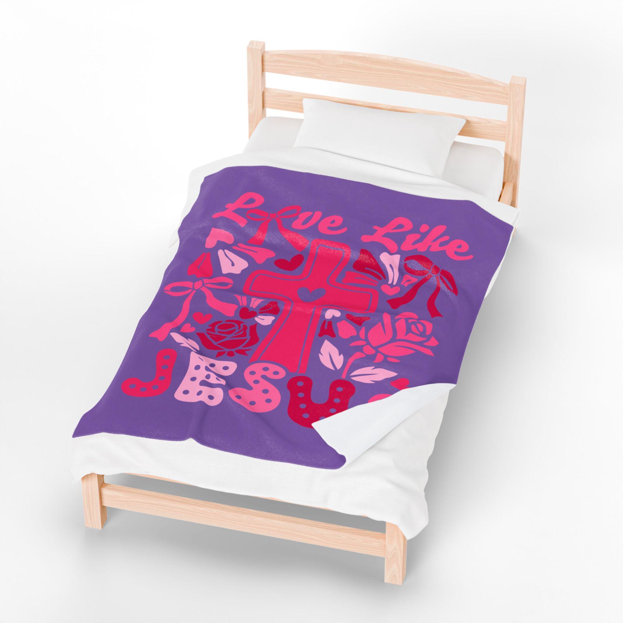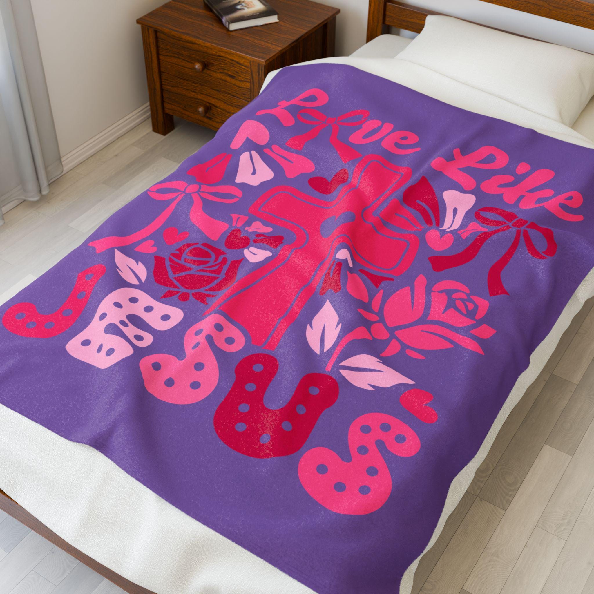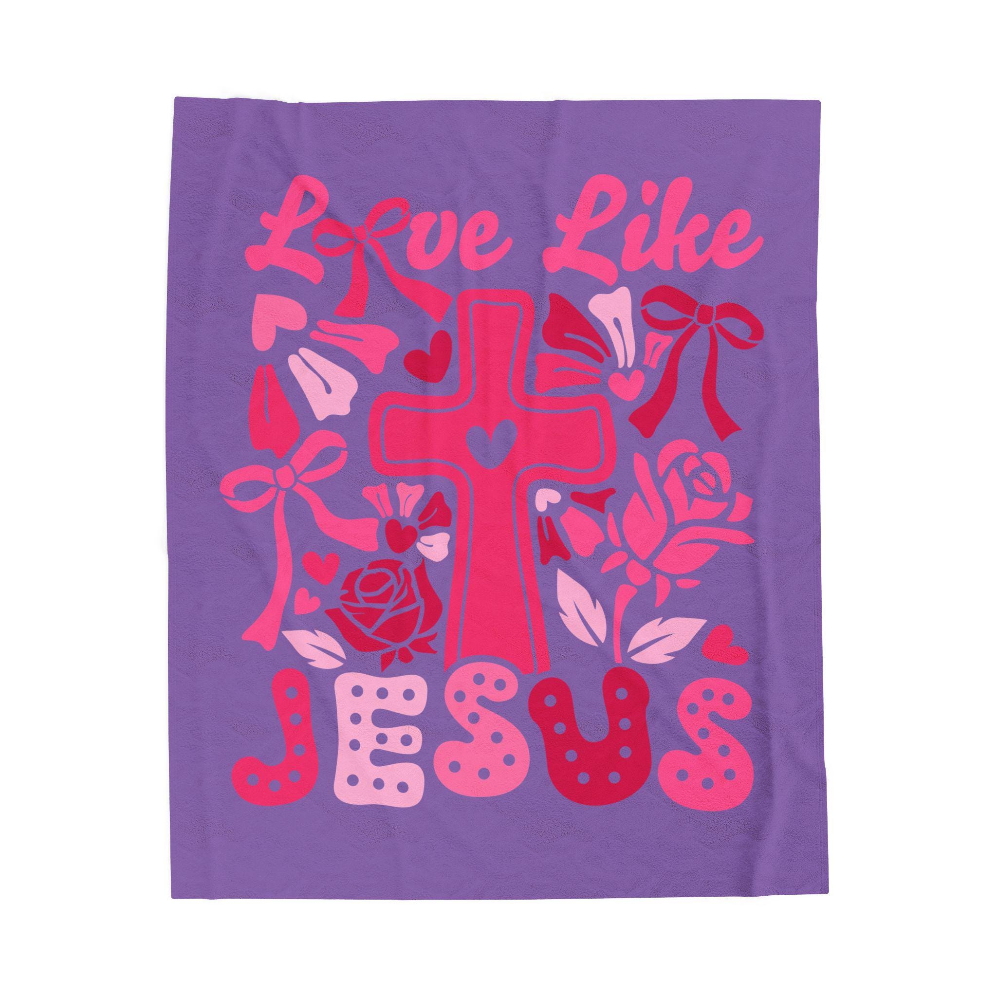 Wrap yourself in a velvety hush that reads like a quiet declaration of faith. This plush blanket pairs a lush, velveteen hand with a bold, heartfelt graphic—warm pinks and reds forming a cross, roses, and the phrase “Love Like Jesus” against a rich purple field. It settles across shoulders during evening devotion, drapes over a favorite chair in the living room, or becomes a soft backdrop for moments of reflection. The fabric feels like a gentle embrace; the colors hold their vibrancy so the message stays bright through everyday use. For those who want a visible, cozy reminder to live with compassion, this blanket brings softness and spirit into the home.
