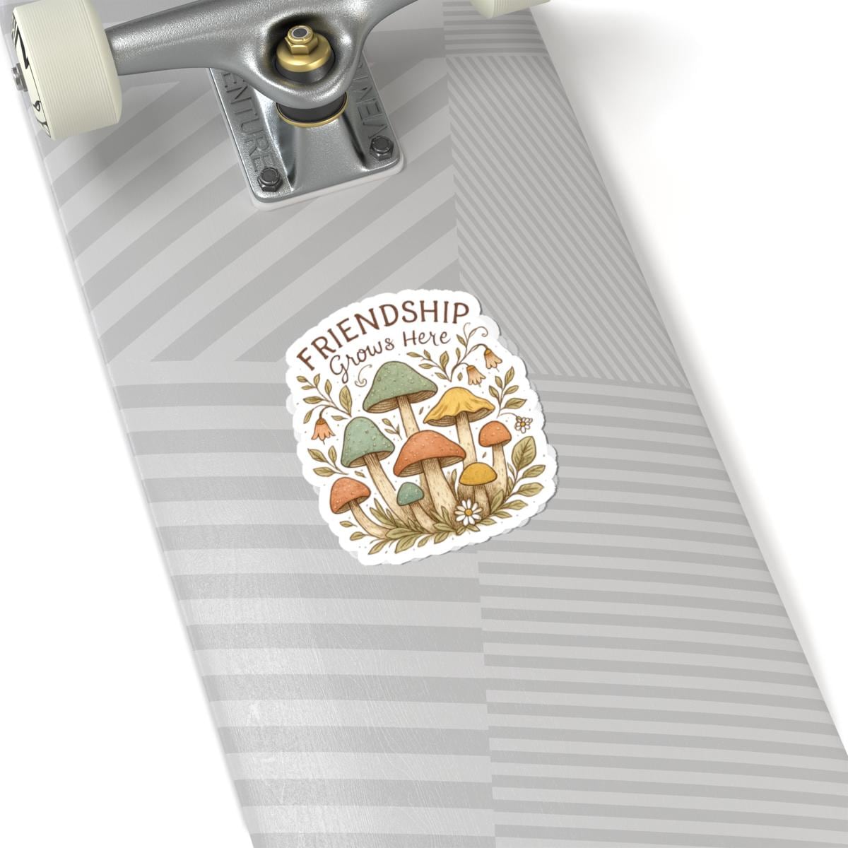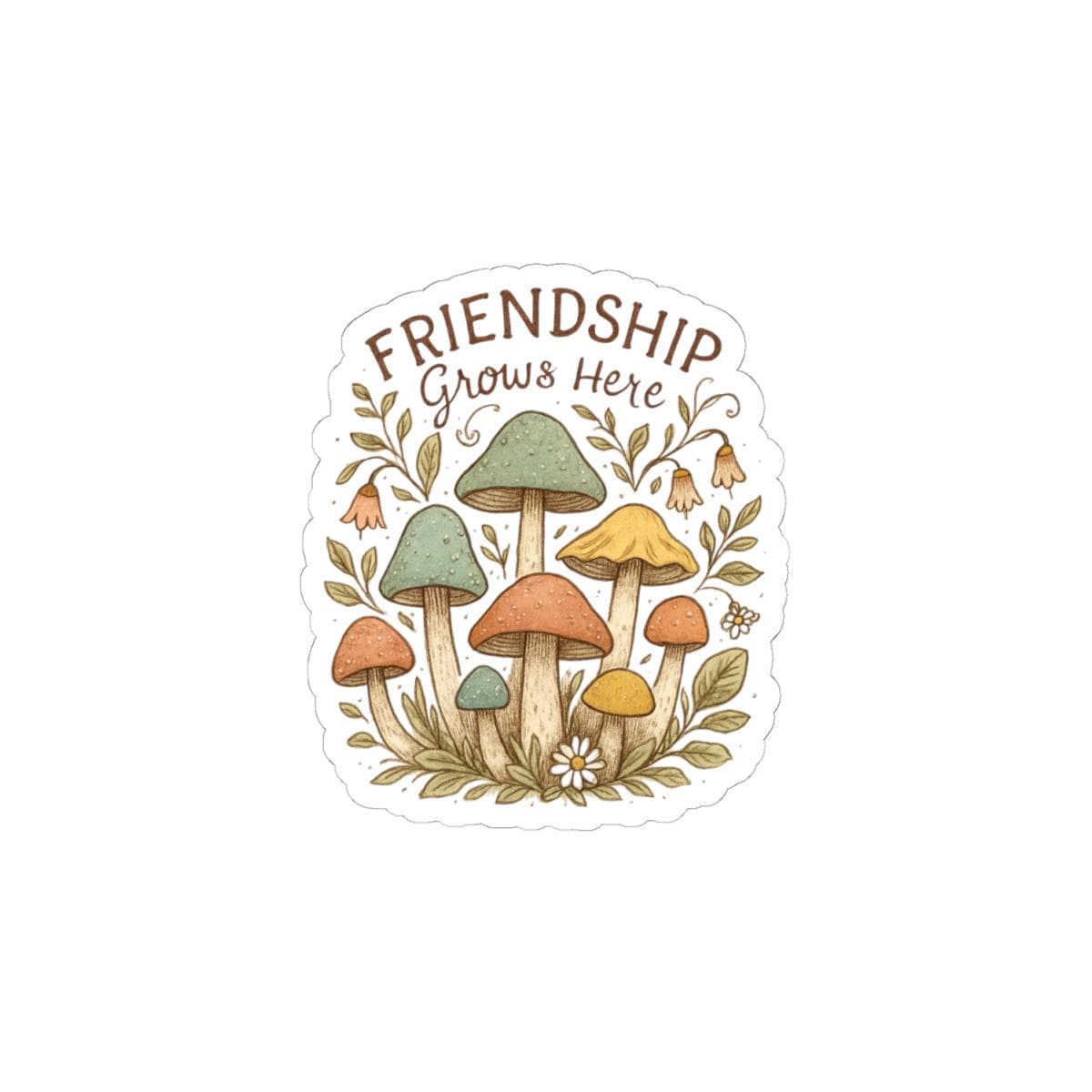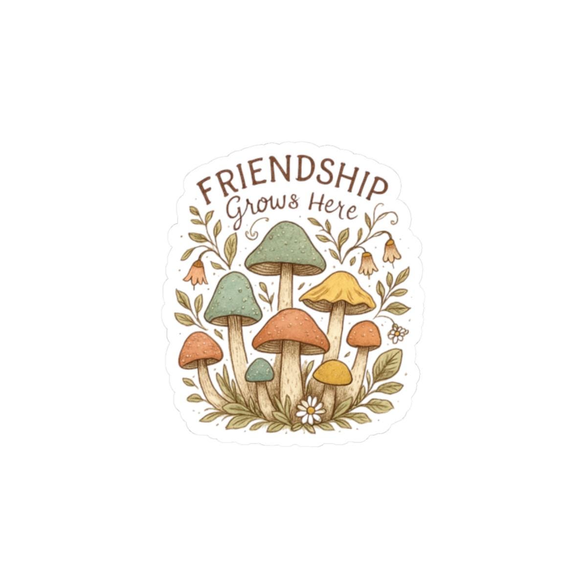 A small glossy kiss-cut sticker featuring a warm, hand-drawn cluster of whimsical mushrooms and foliage with the hand-lettered phrase “Friendship Grows Here.” Earthy tones and soft pastels give it a gentle, cottagecore feel—perfect for adding a quiet touch of charm to laptops, journals, water-bottle lids, or phone cases. The shiny finish deepens the colors and highlights the delicate linework, while the durable vinyl and strong adhesive keep it in place on smooth, flat surfaces around the home or studio.