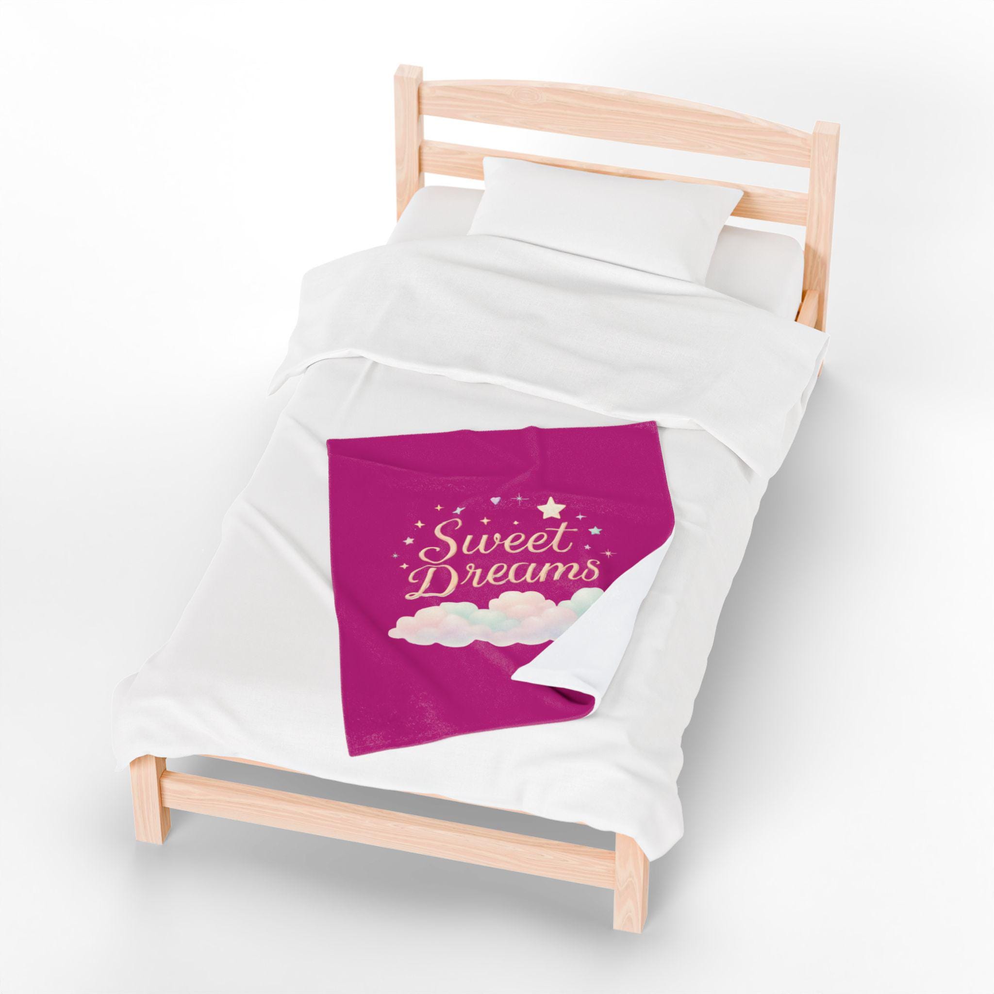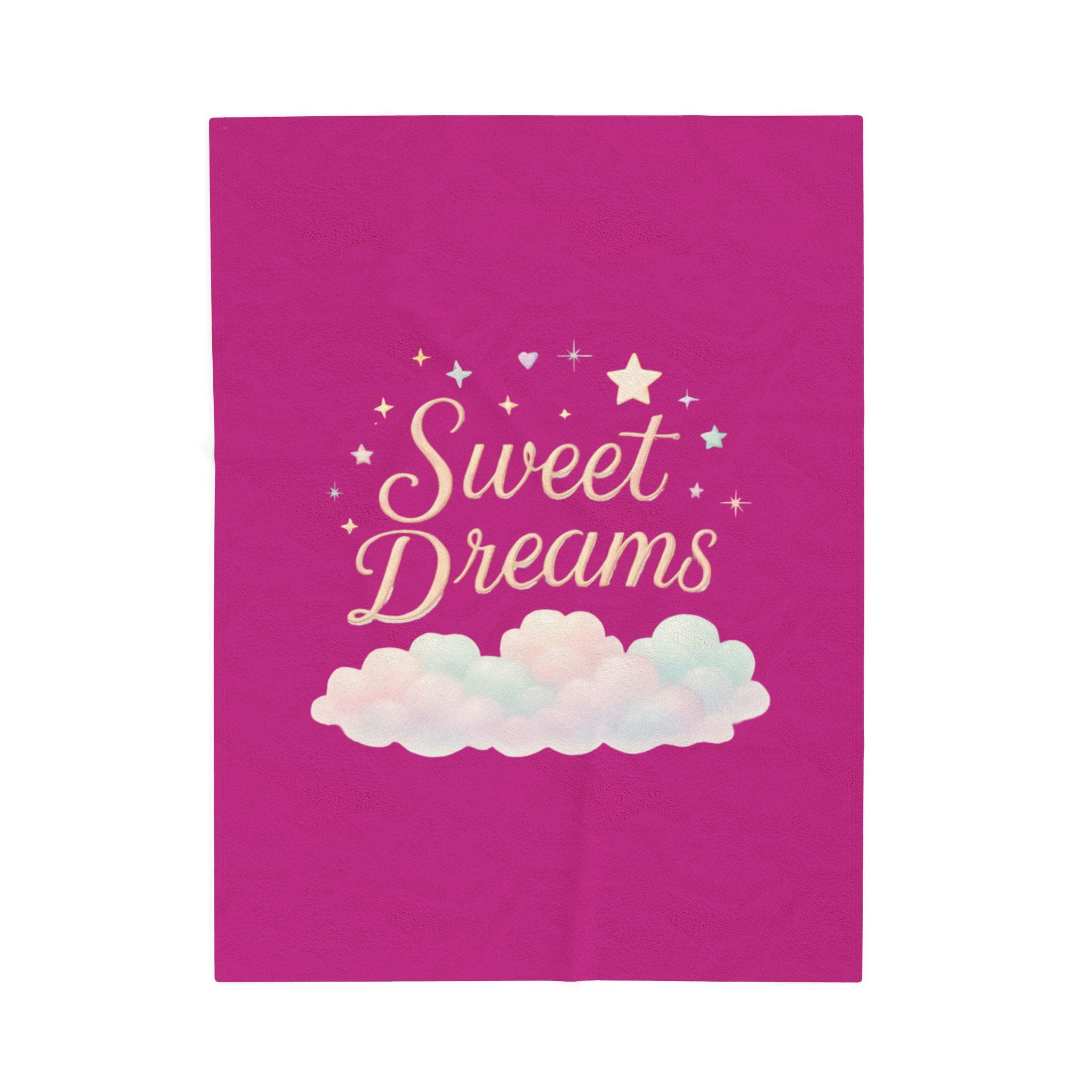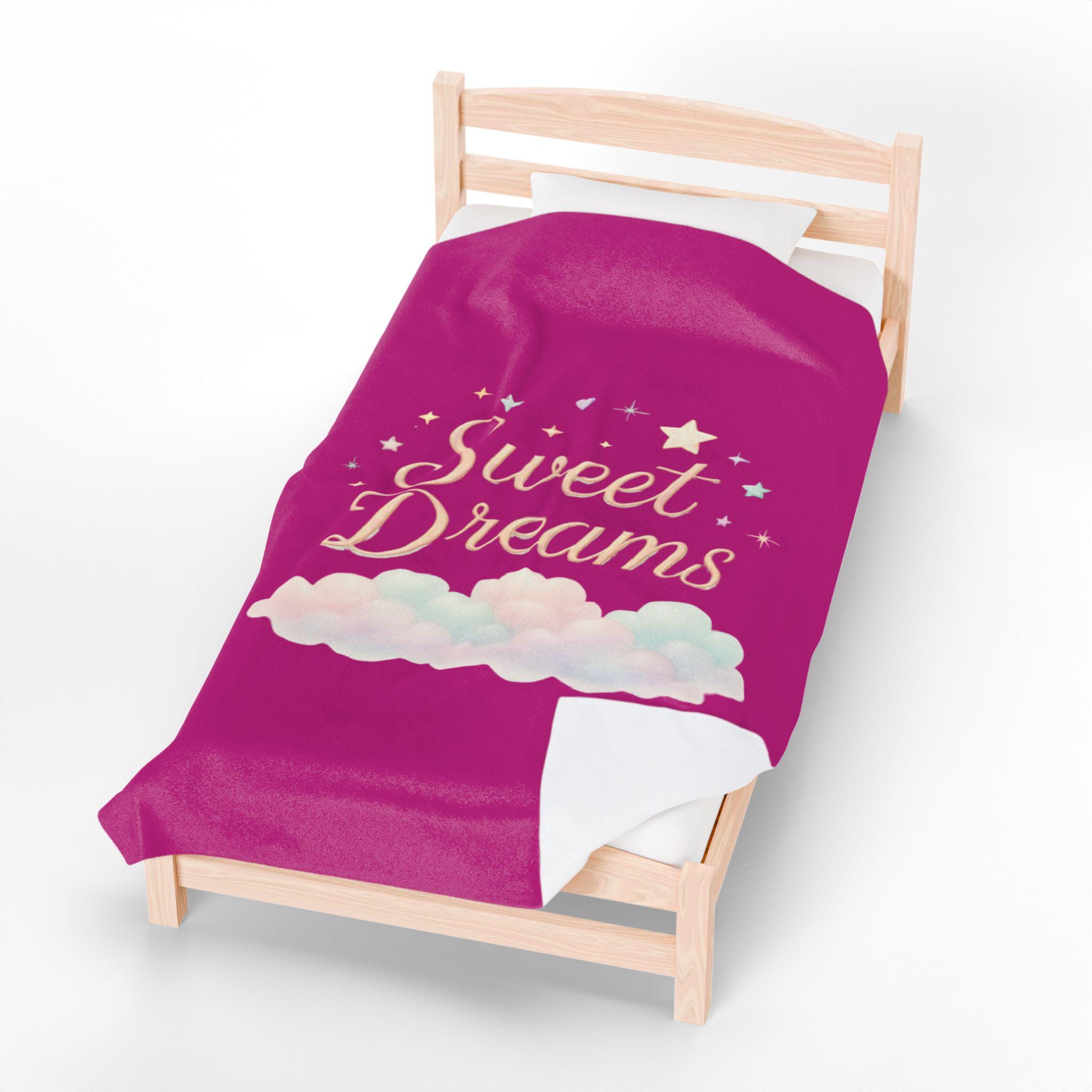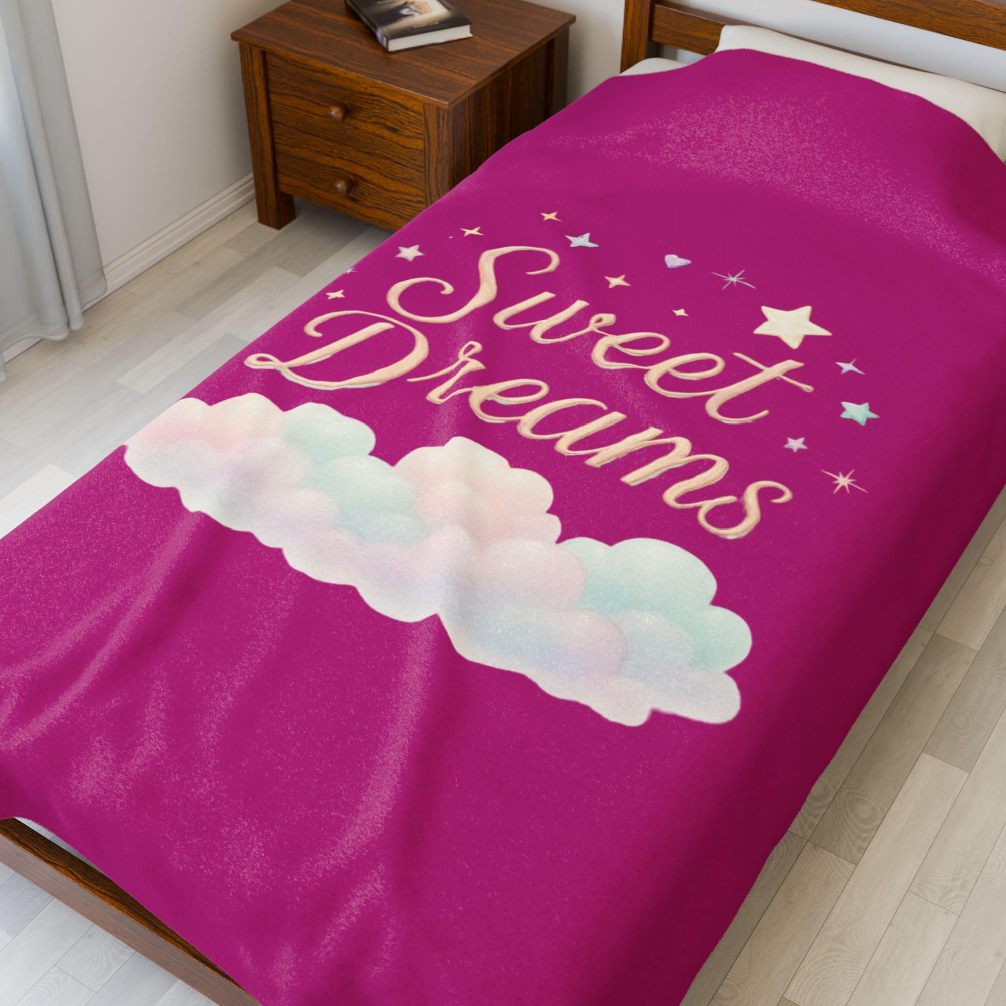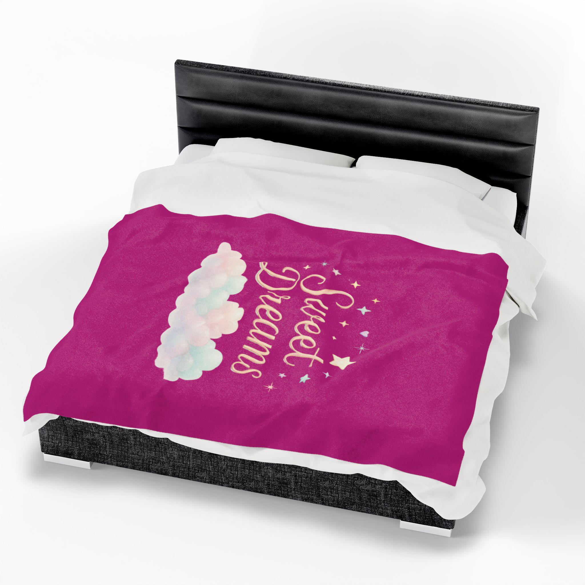A velvety plush blanket that wraps you in a soft, pastel lullaby. The subtle “Sweet Dreams” lettering floats above a cloud of sherbet tones and tiny stars, bringing a gentle, calming presence to bedtime or quiet moments on the couch. Lightweight but cozy, the blanket drapes easily over shoulders or across laps and keeps its color and shape through regular use. It reads like a whispered goodnight — soothing, warm, and quietly joyful for anyone who loves soft textures and dreamy decor.