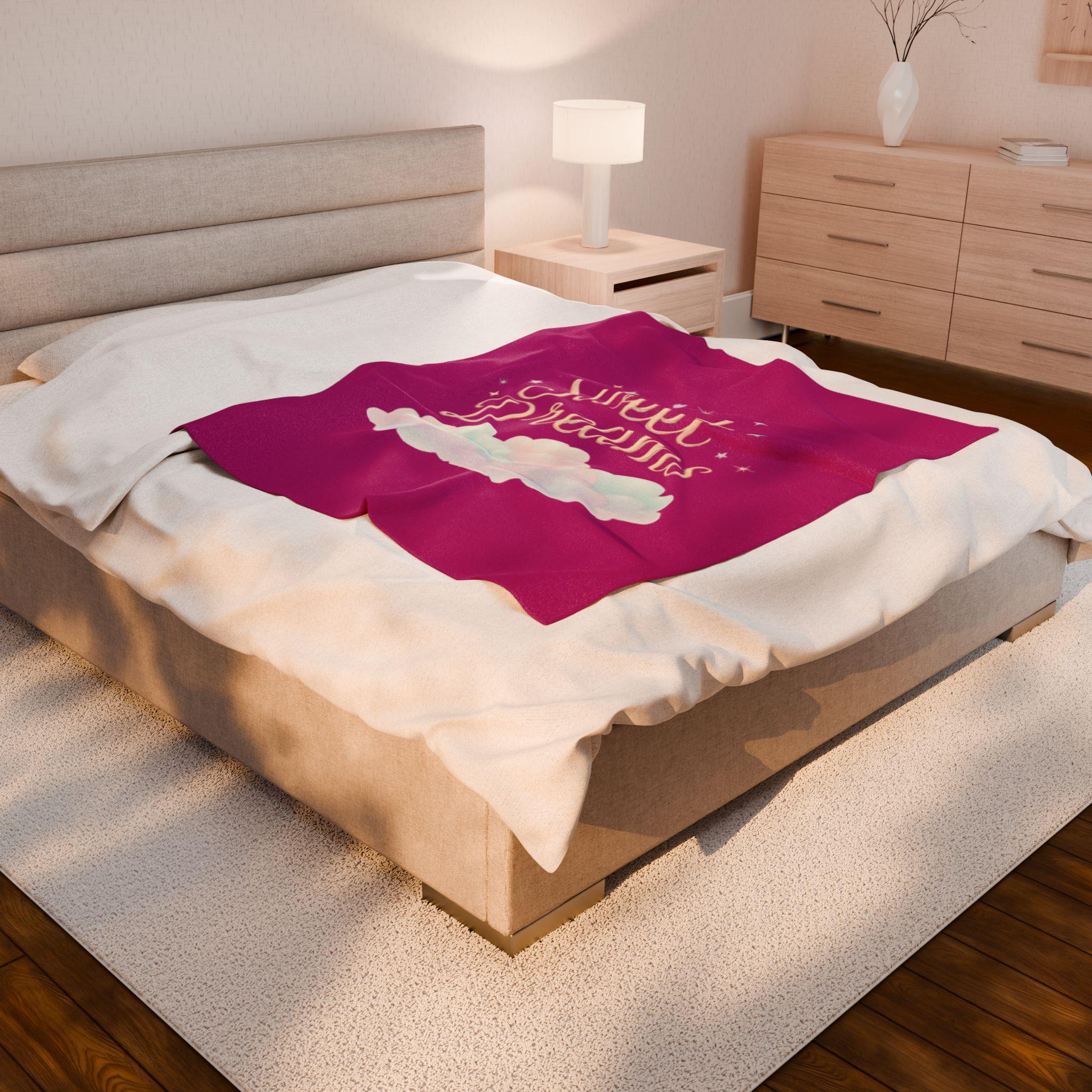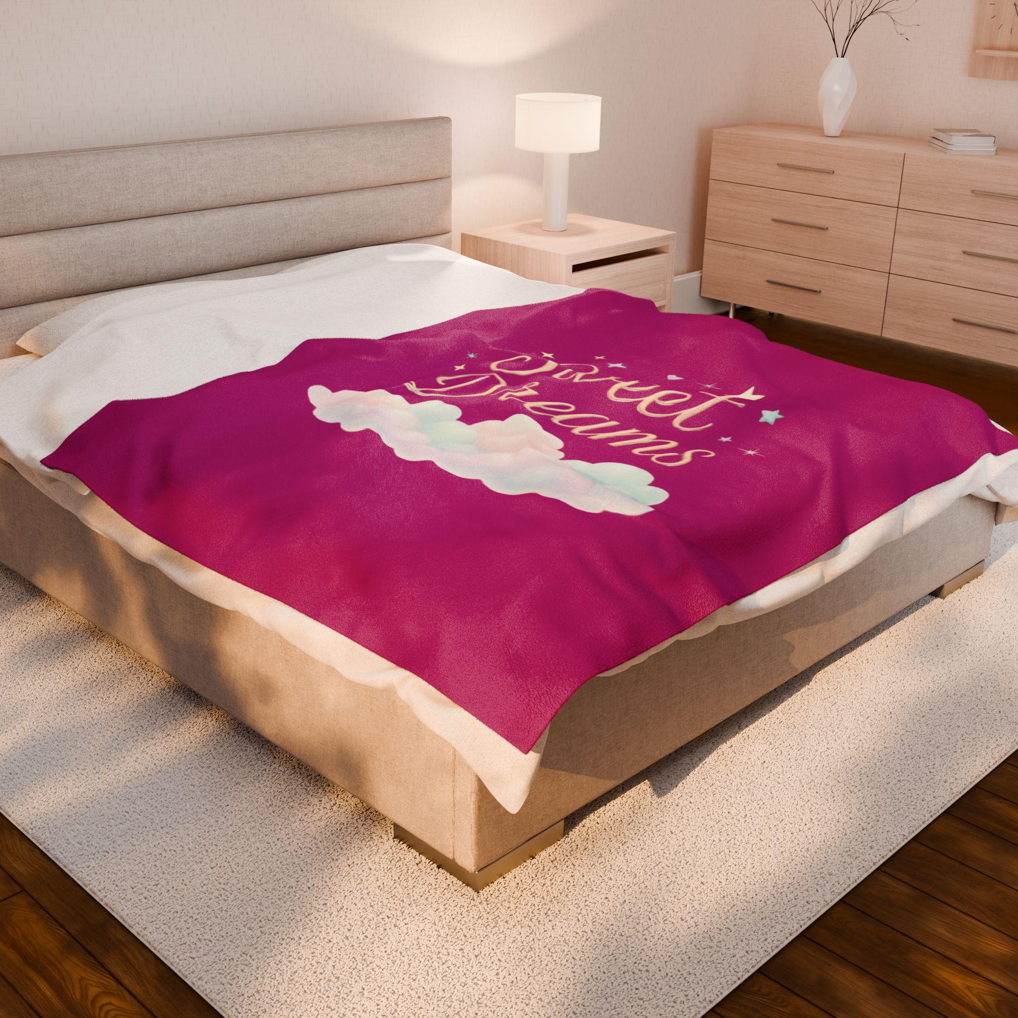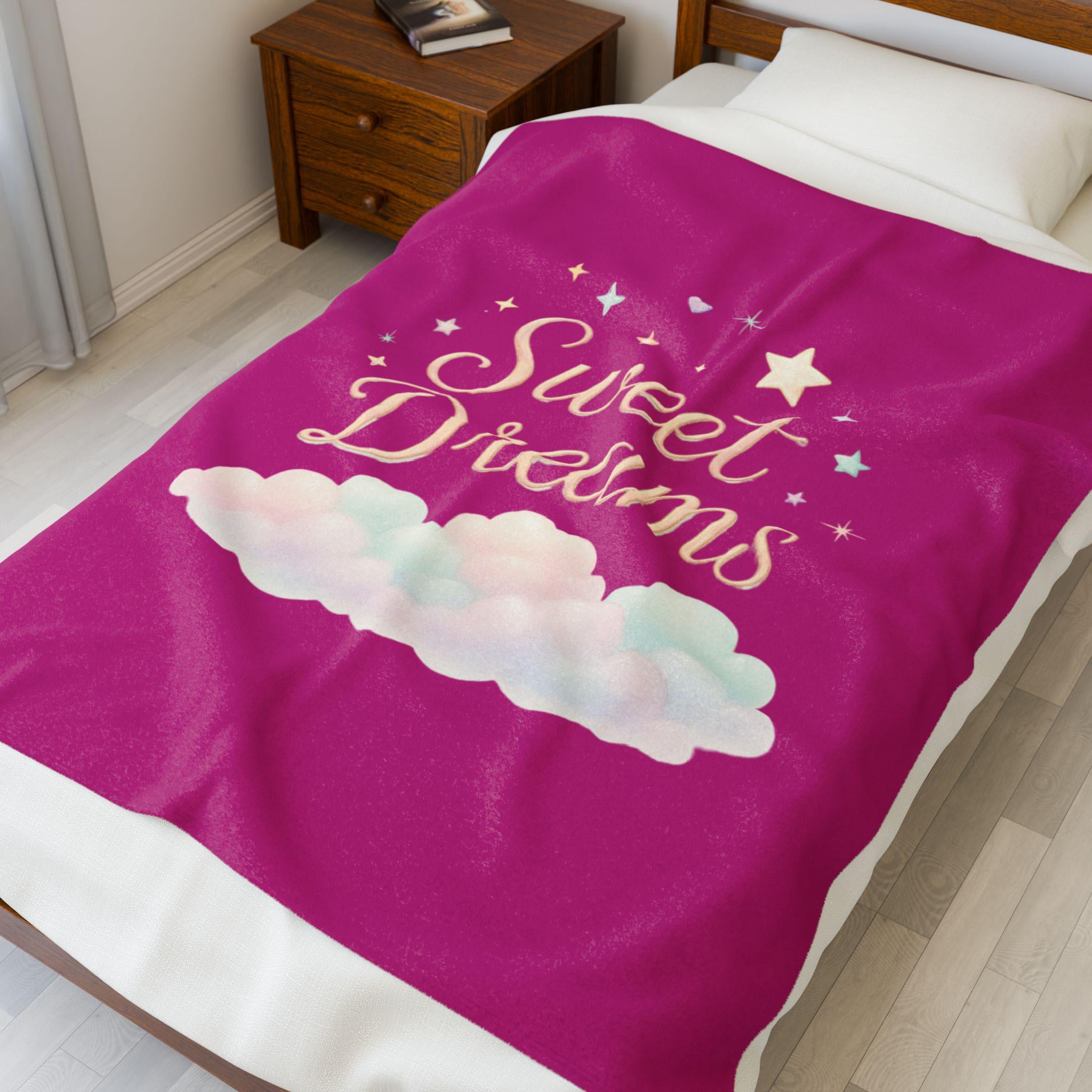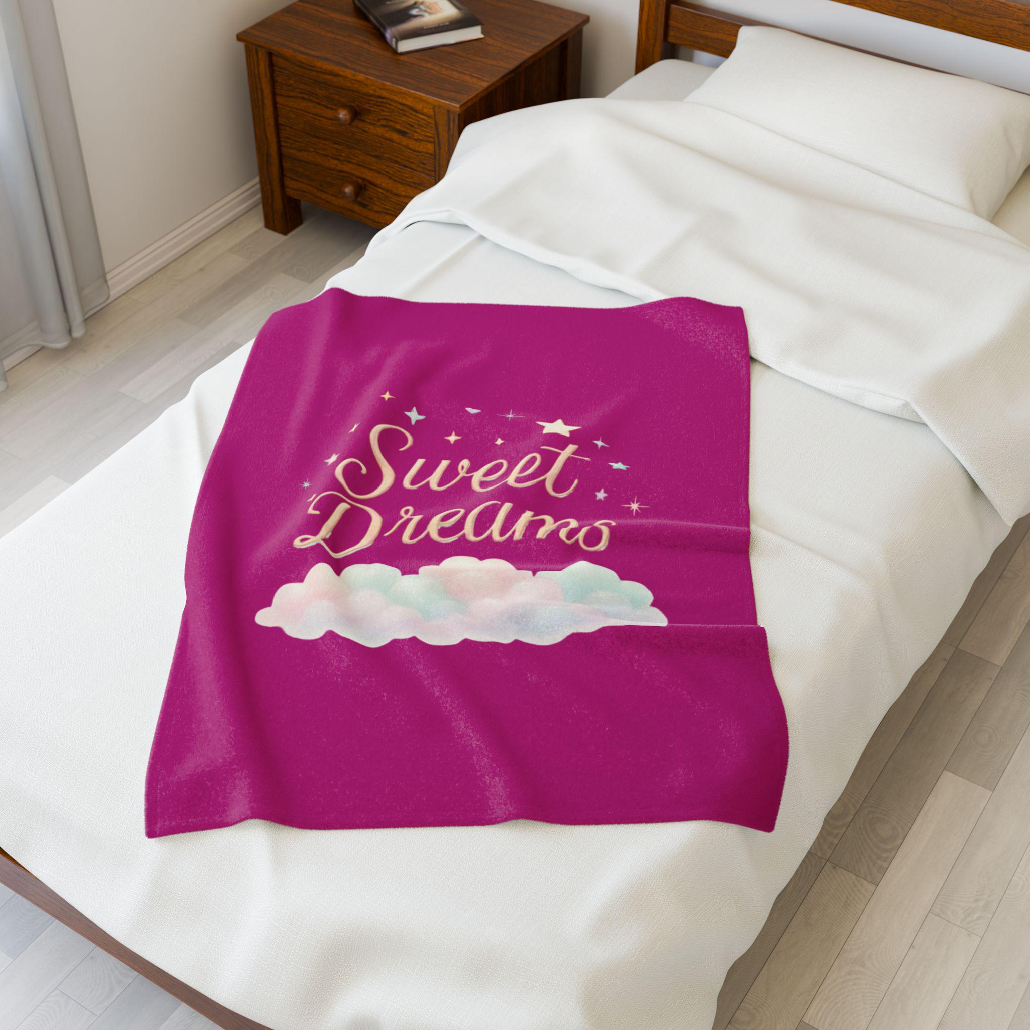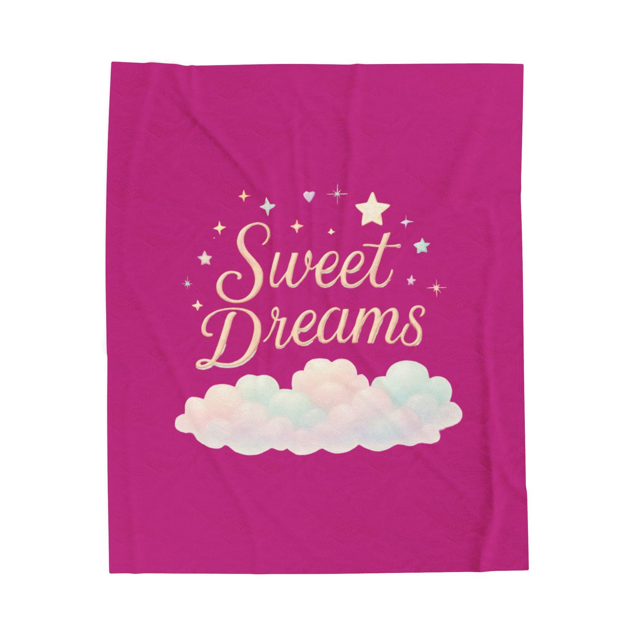 A velvety plush blanket that wraps you in a soft, pastel lullaby. The subtle “Sweet Dreams” lettering floats above a cloud of sherbet tones and tiny stars, bringing a gentle, calming presence to bedtime or quiet moments on the couch. Lightweight but cozy, the blanket drapes easily over shoulders or across laps and keeps its color and shape through regular use. It reads like a whispered goodnight — soothing, warm, and quietly joyful for anyone who loves soft textures and dreamy decor.